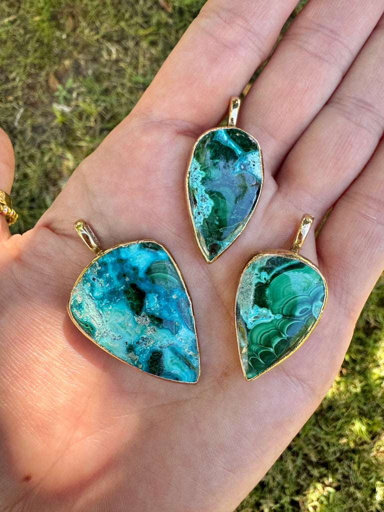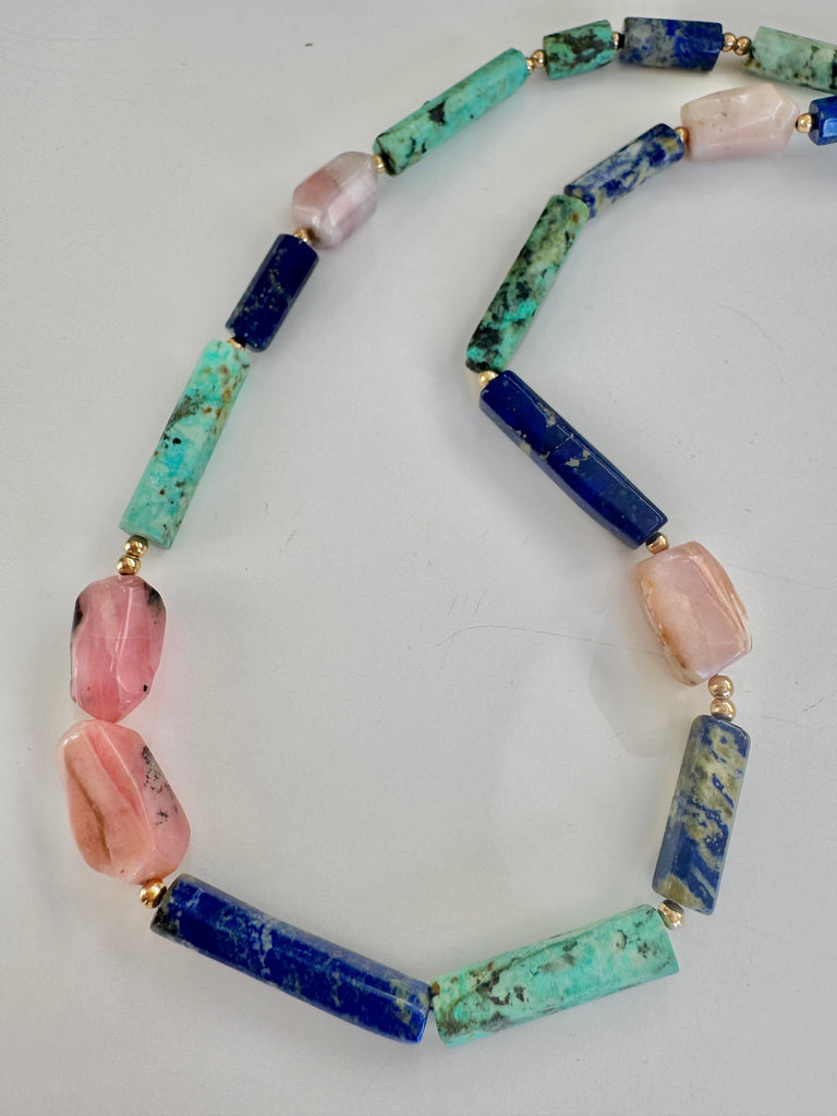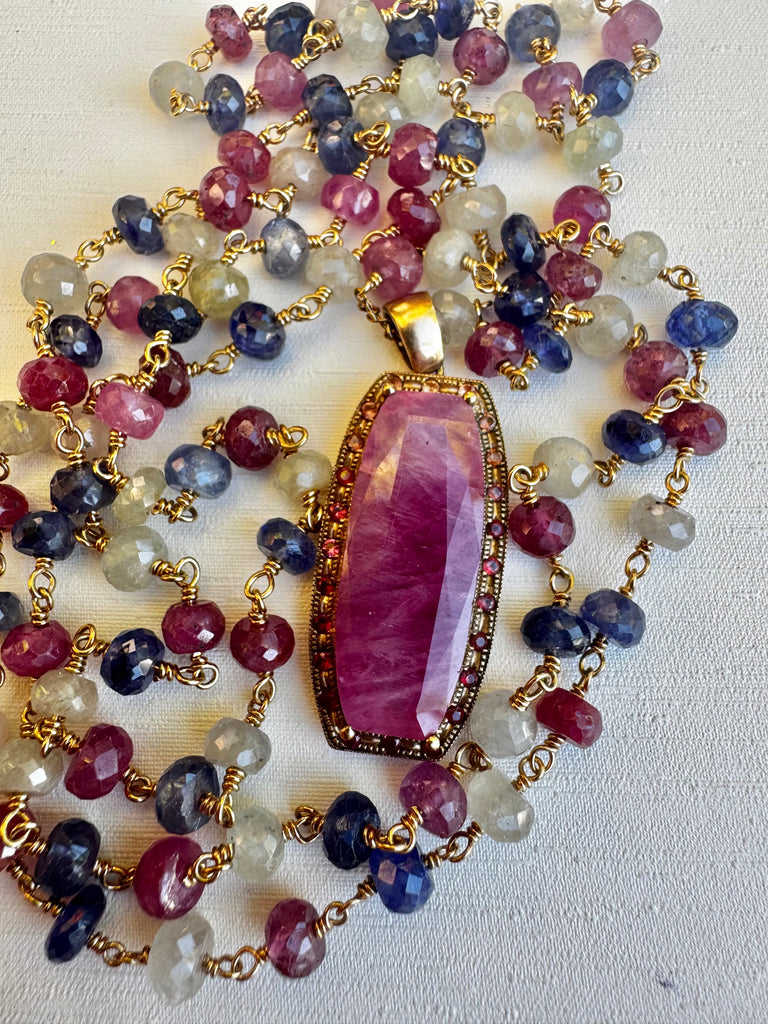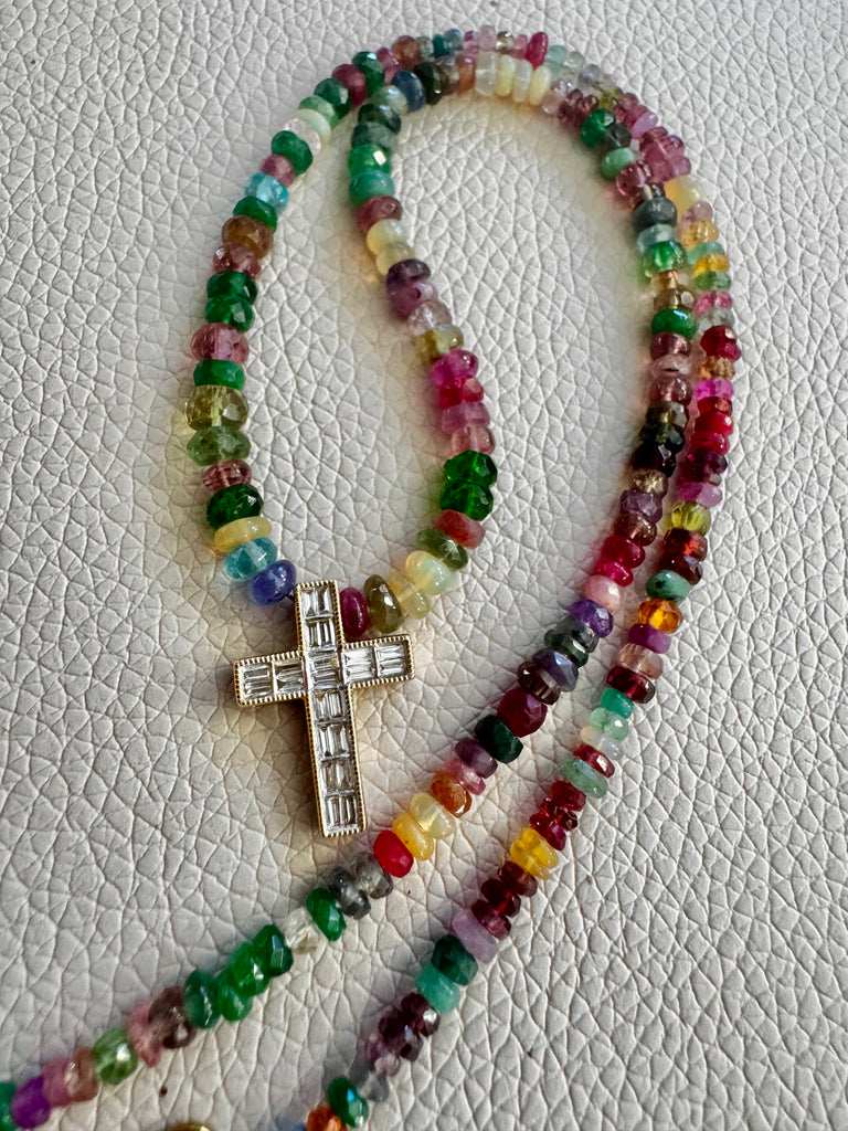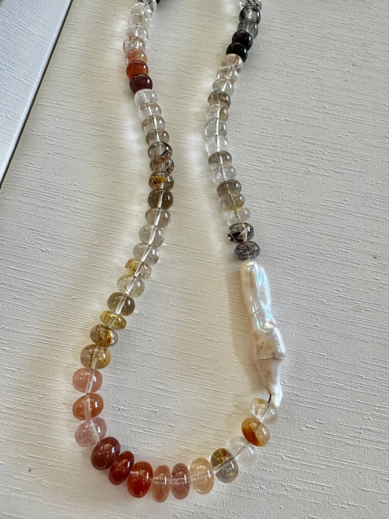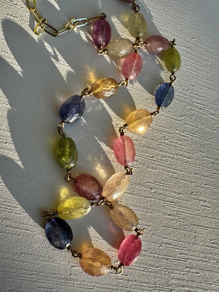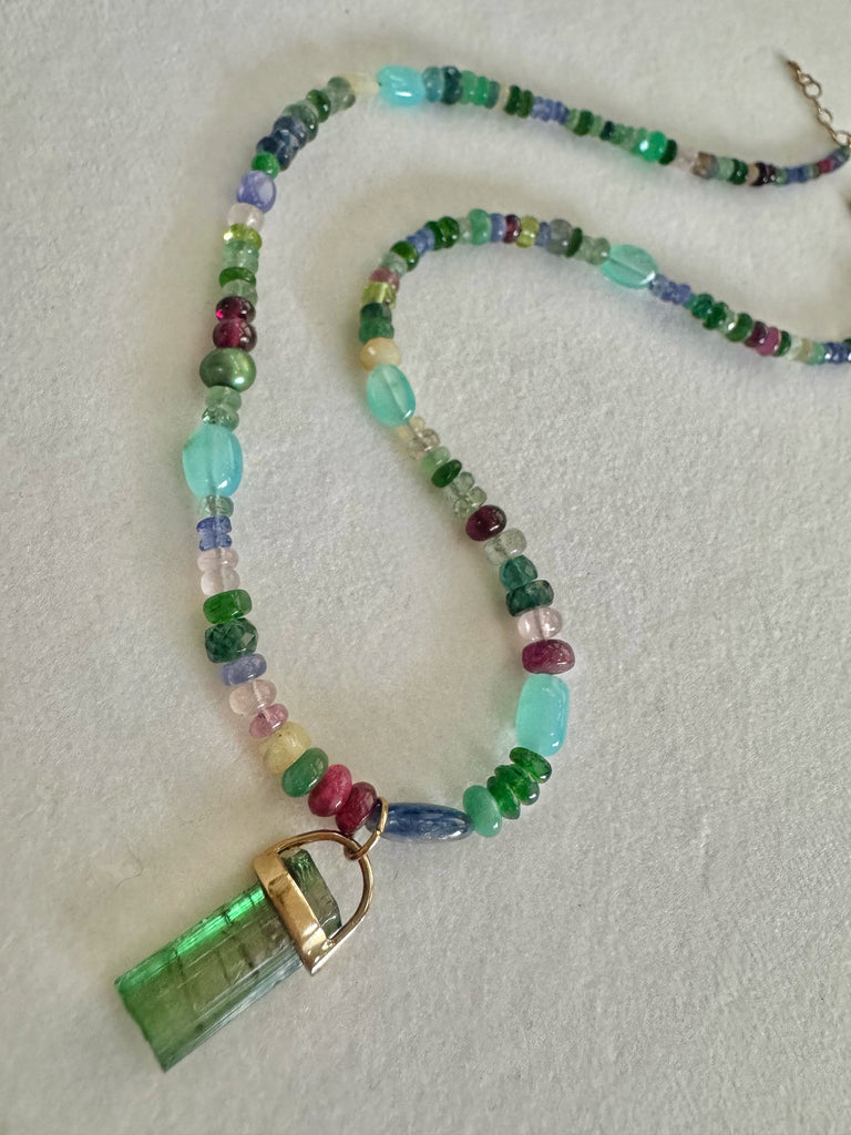 - Matte multi gemstone barrel bead necklace with vermeil mermaid "wisdom" coin pendant