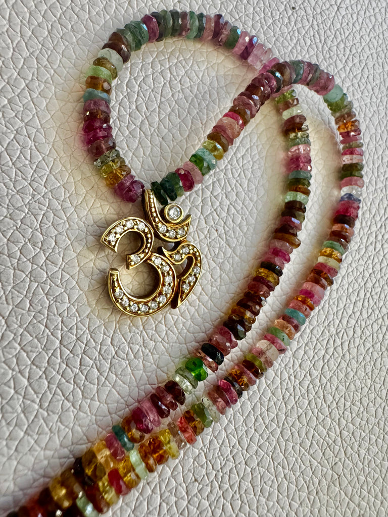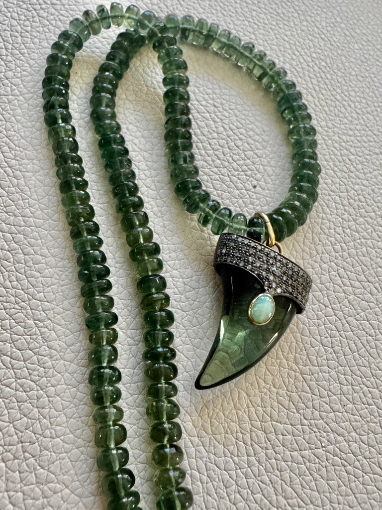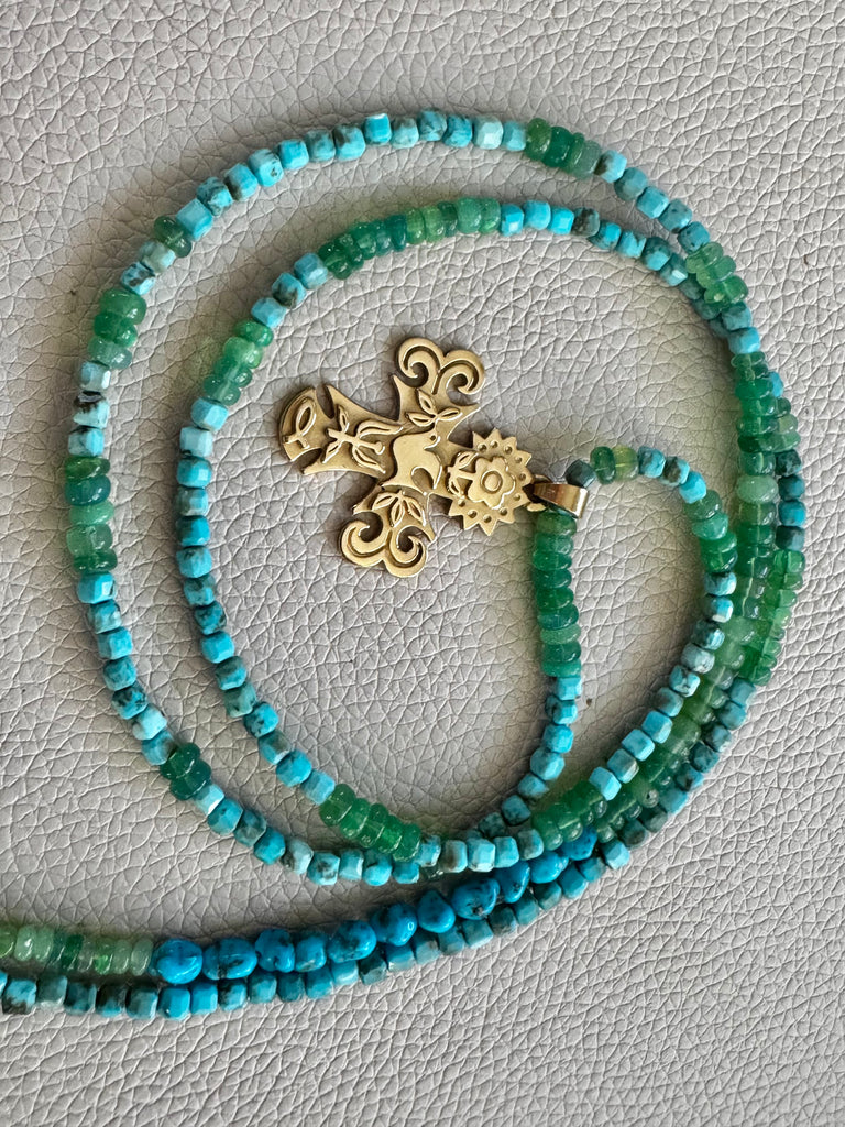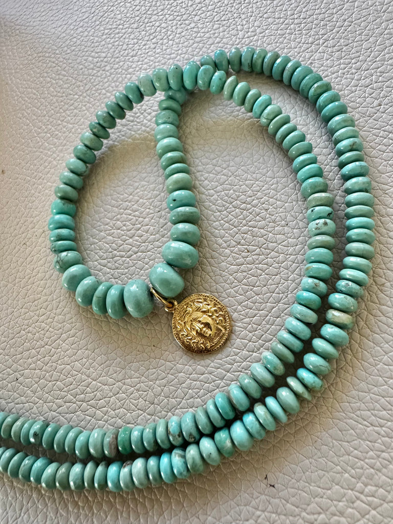 - Beautiful premium smoke topaz beads with AZ heishi turquoise and our exclusive Ganesh coin