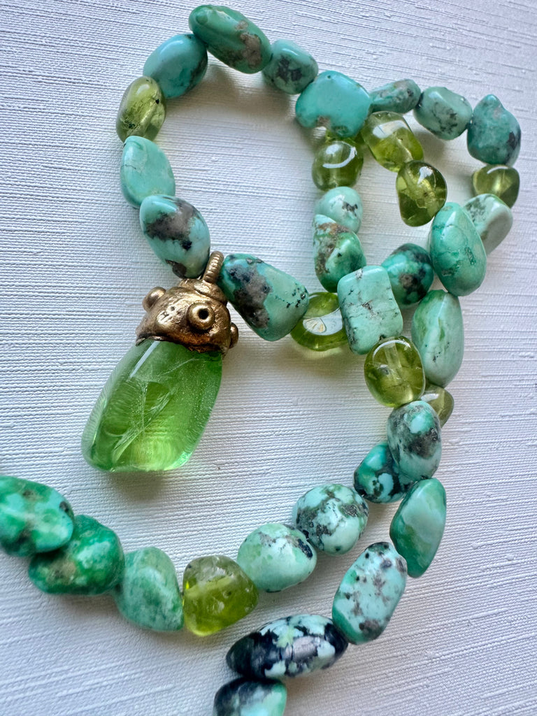 Rustic AZ turquoise/peridot nugget bead necklace with artisan peridot pendant