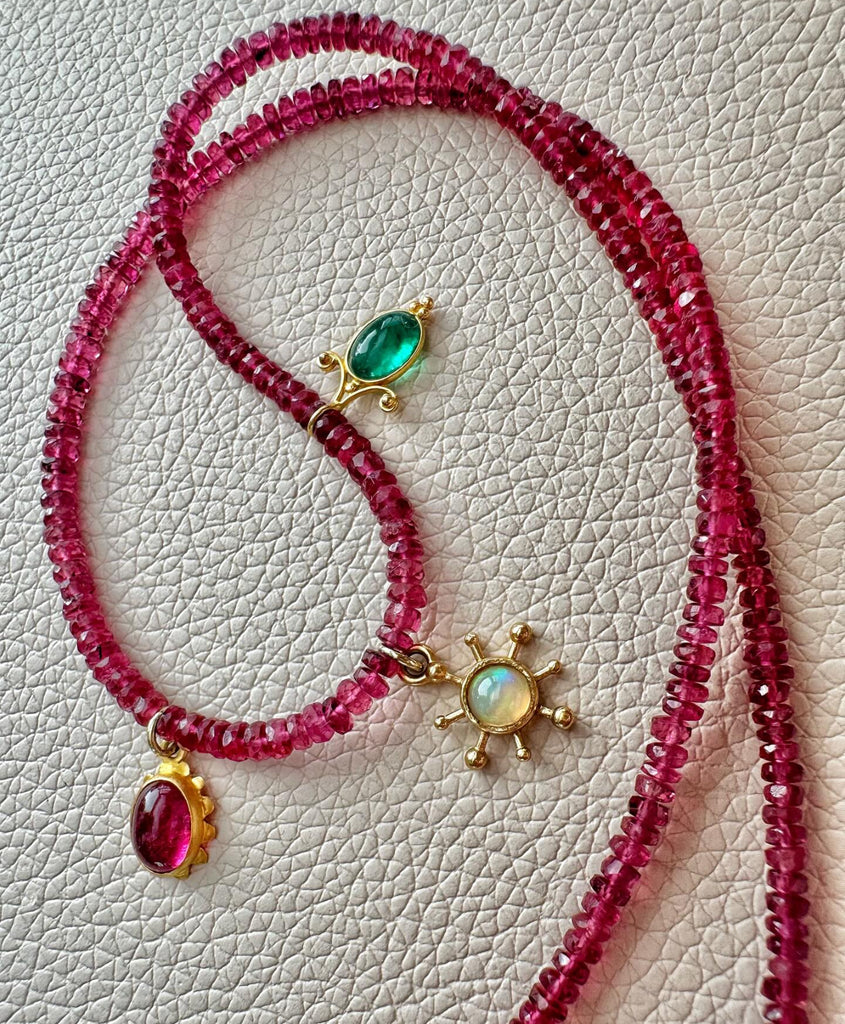Stunning AAA pink spinel/18KT gold emerald, opal and pink tourmaline charms