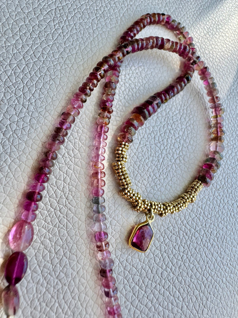 AAA Watermelon tourmaline/spinel bead necklace with 18KT gold accents and tourmaline charm