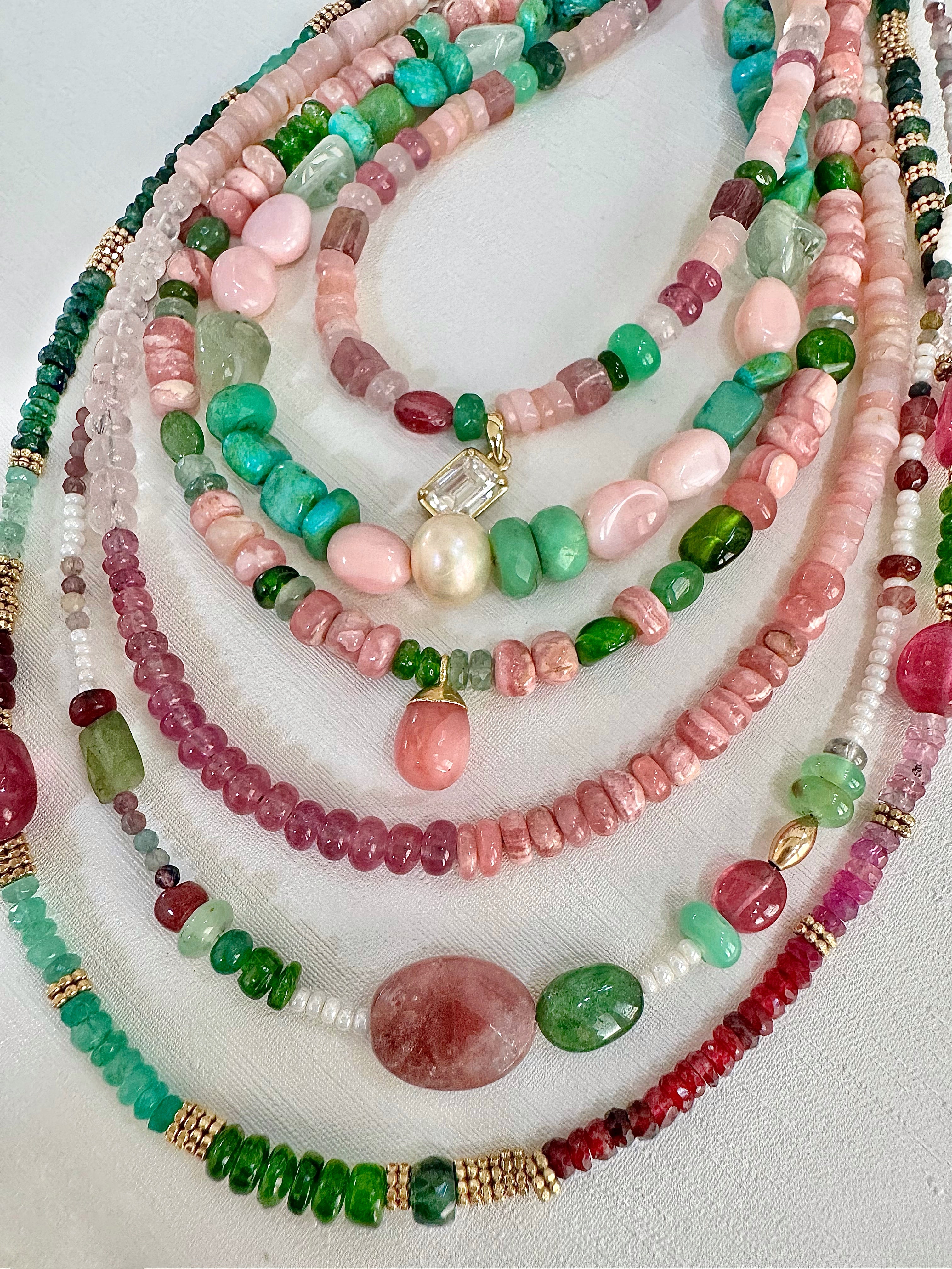 Stunning rhodochrosite/emerald/diopside/chryso/tsavorite bead necklace with Peruvian opal drop