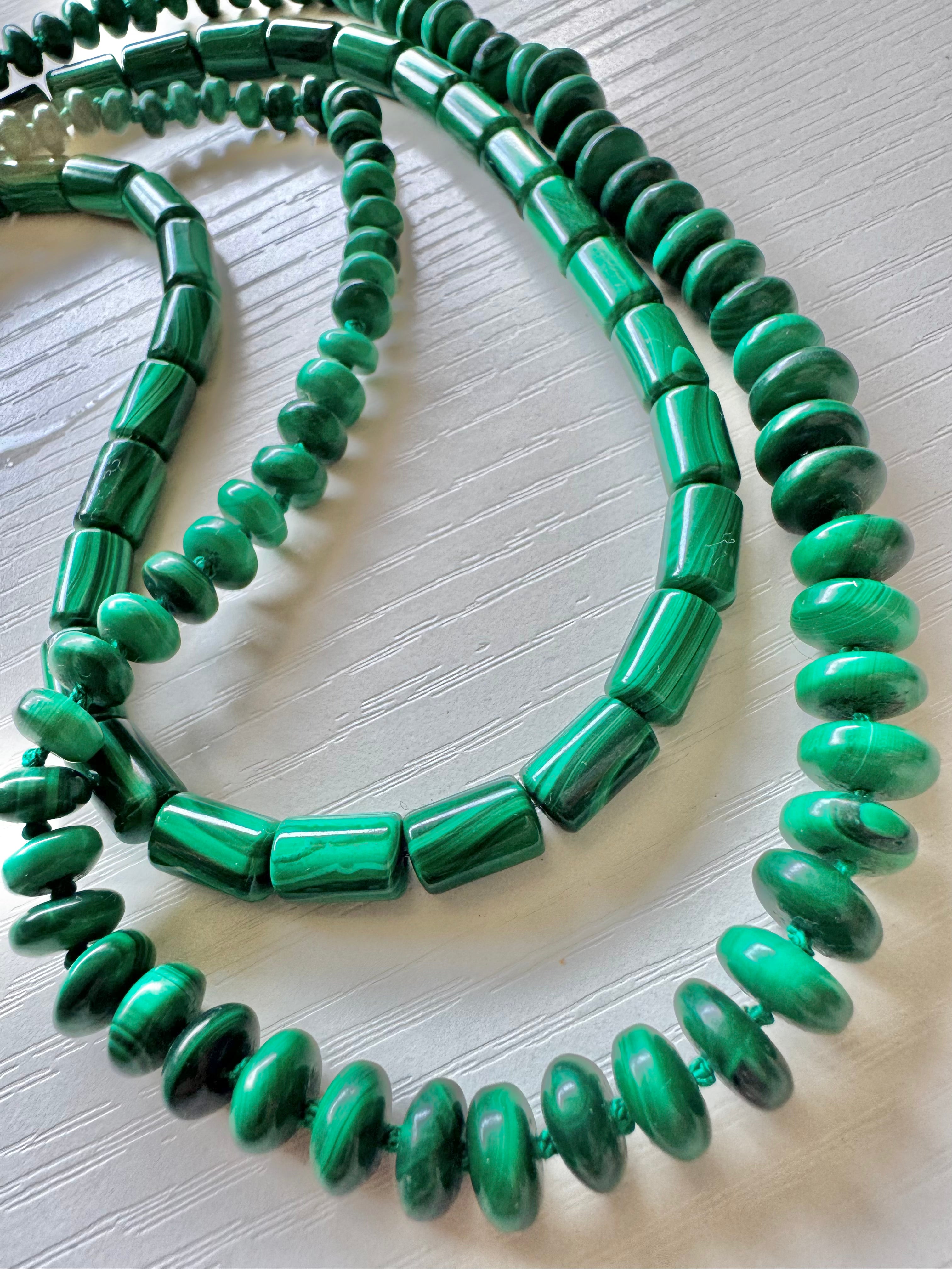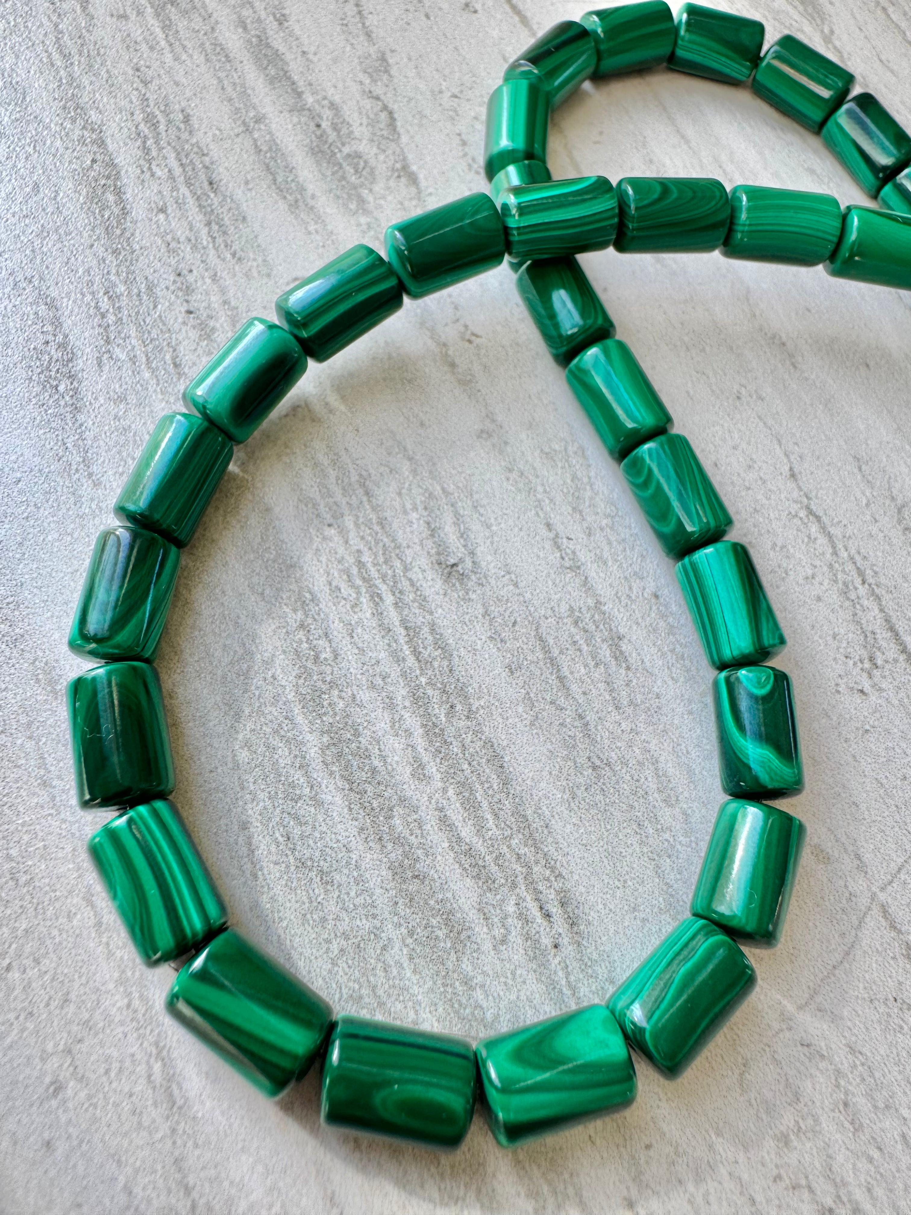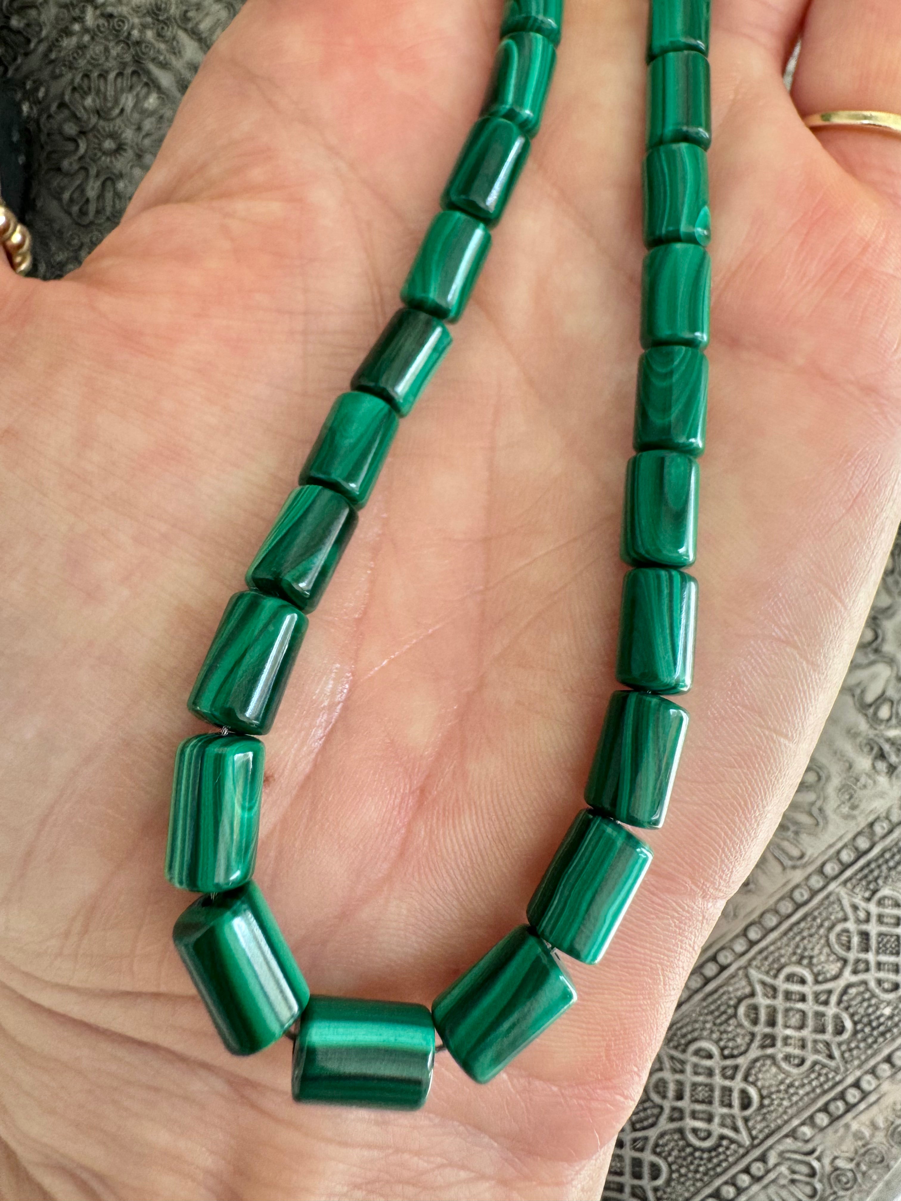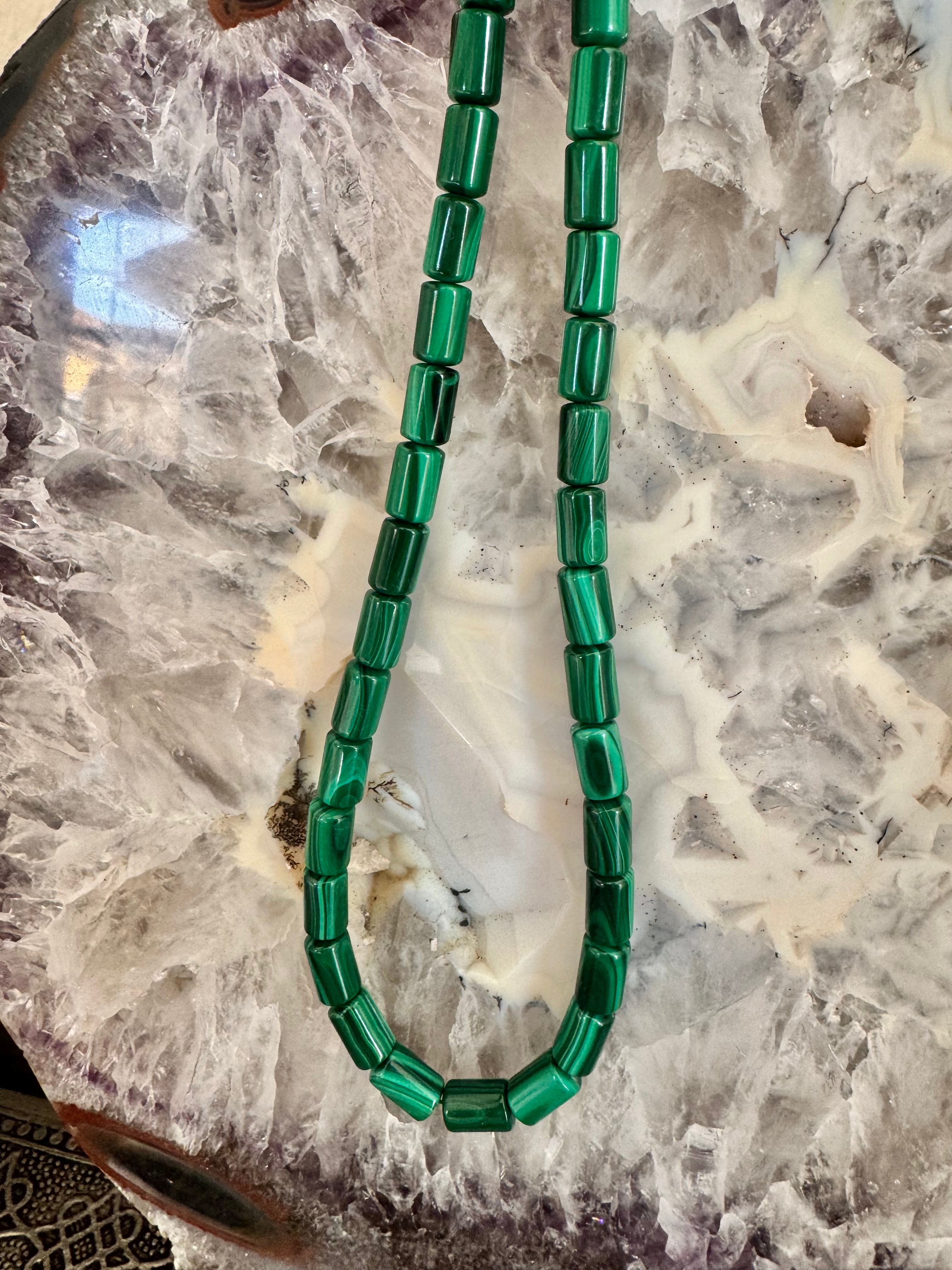 Stunning top quality barrel bead malachite layering necklace. Stunning patterns on these malachite bead with beautiful saturated green. Wear with other layers or alone. Gold filled findings.