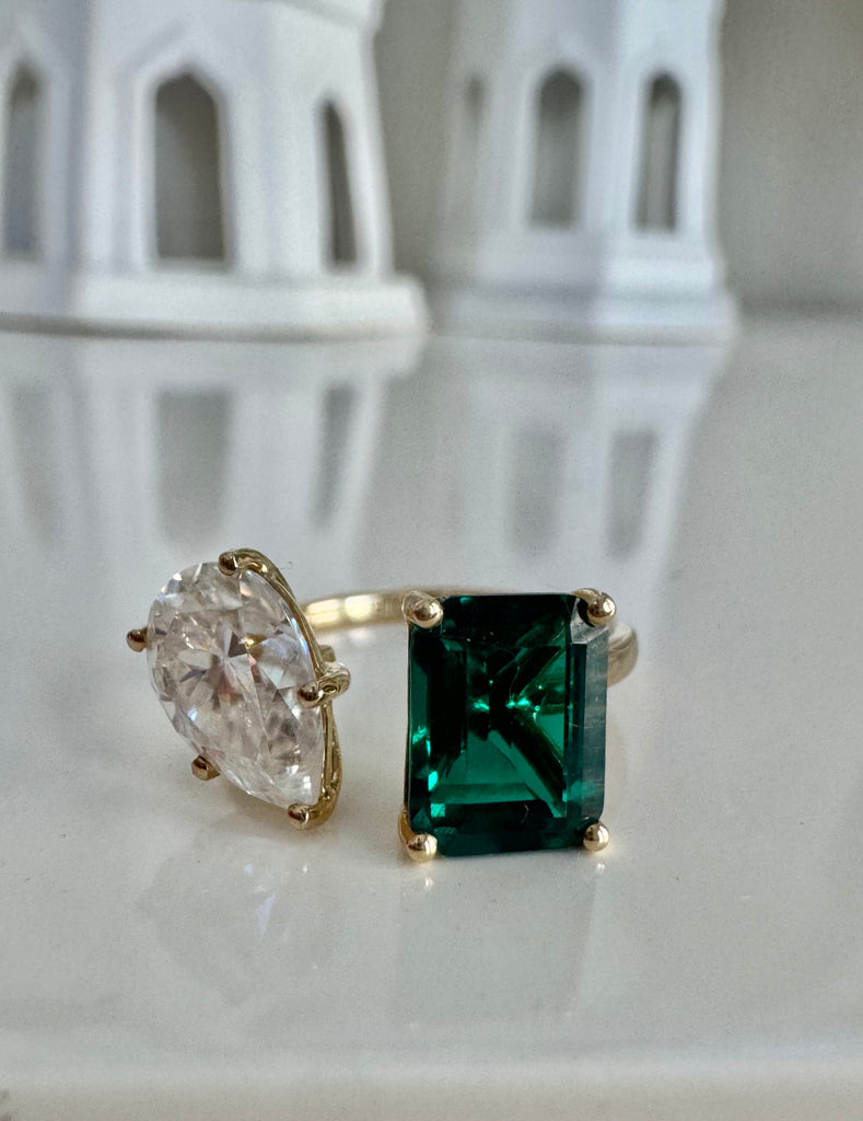 10K gold 5CTW Toi Et Moi lab emerald/moissanite statement ring