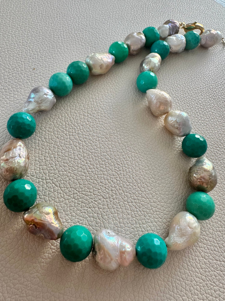 Beautiful statement grassy agate bead necklace with freshwater Edison baroque pearl