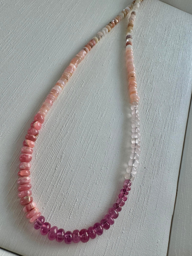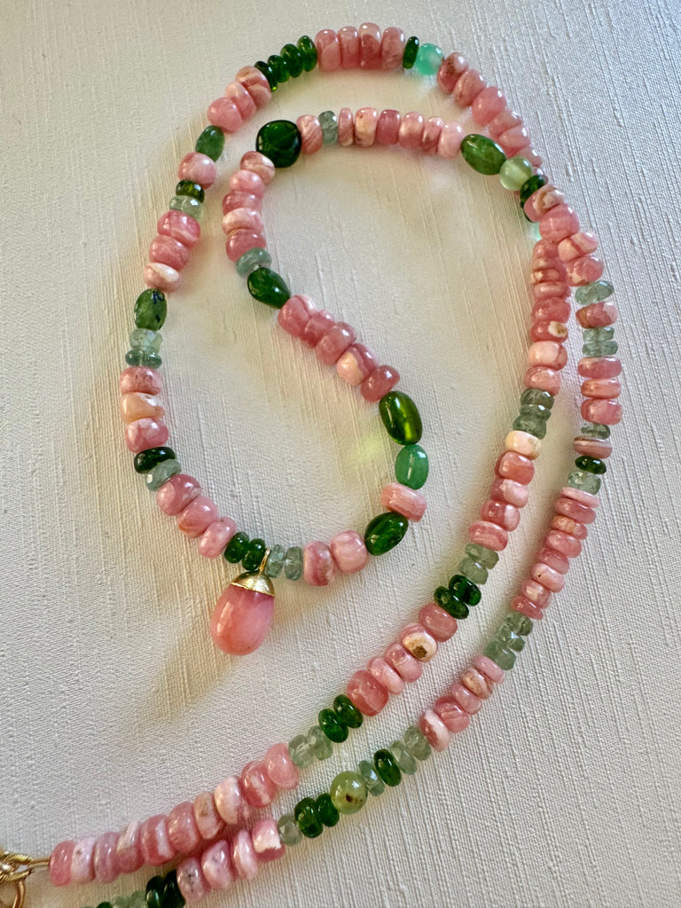 Stunning rhodochrosite/emerald/diopside/chryso/tsavorite bead necklace with Peruvian opal drop