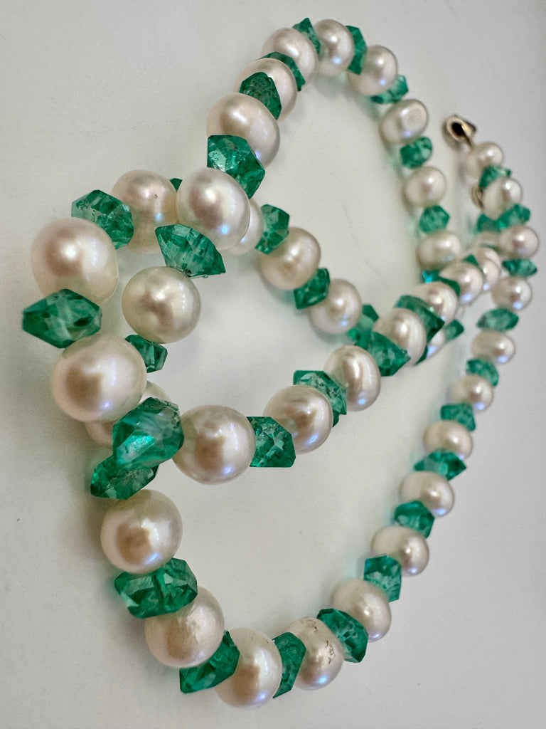 Stunning freshwater pearls with highly healing AAA green herkimer diamond gem bead necklace