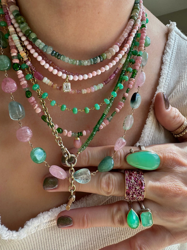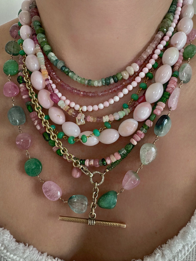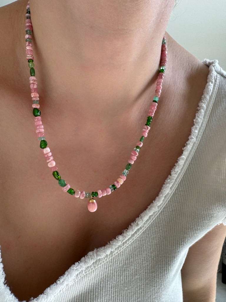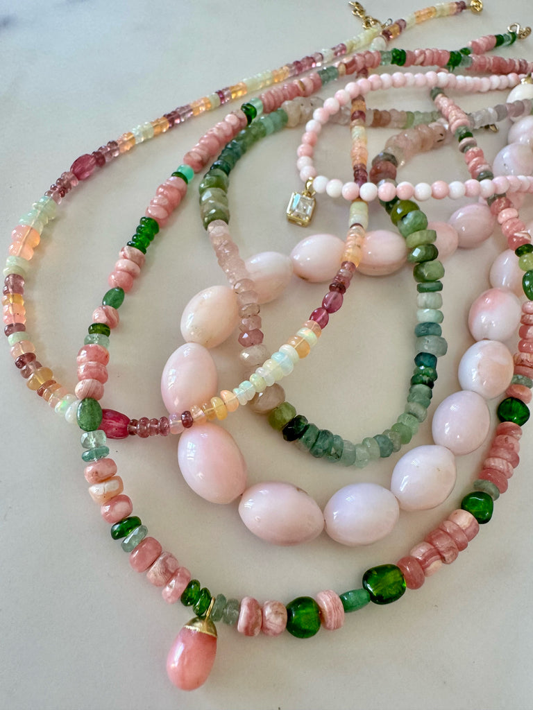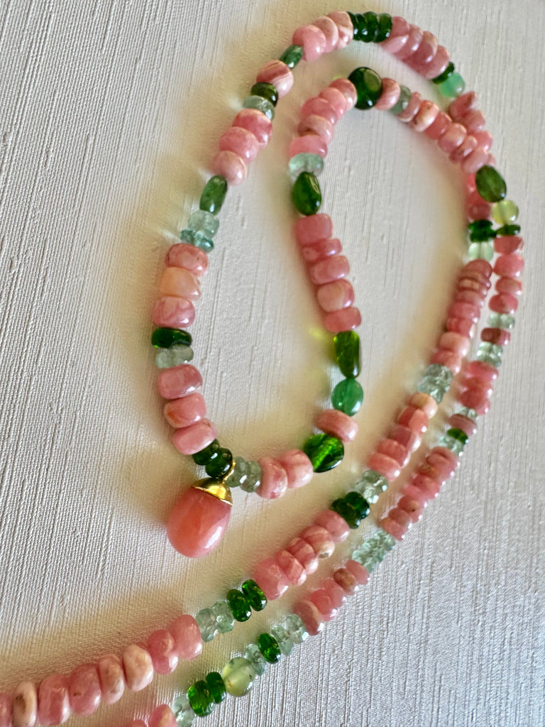Stunning rhodochrosite/emerald/diopside/chryso/tsavorite bead necklace with Peruvian opal drop