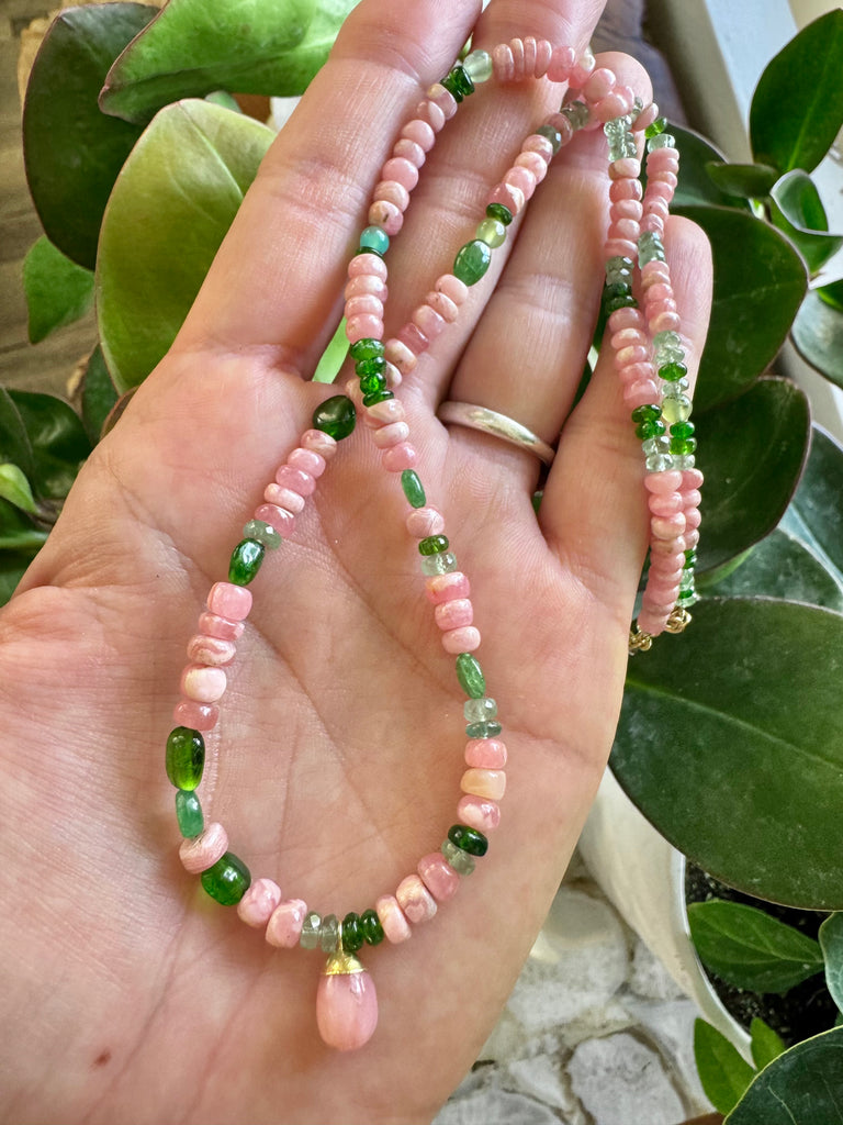 Stunning rhodochrosite/emerald/diopside/chryso/tsavorite bead necklace with Peruvian opal drop. Just wow! Beautiful color combination of top quality gems in wide variety of greens and beautiful rhodochrosite....ahhhhh....Peruvian pink opal as a cherry on top. Great for layering. Gold filled findings.