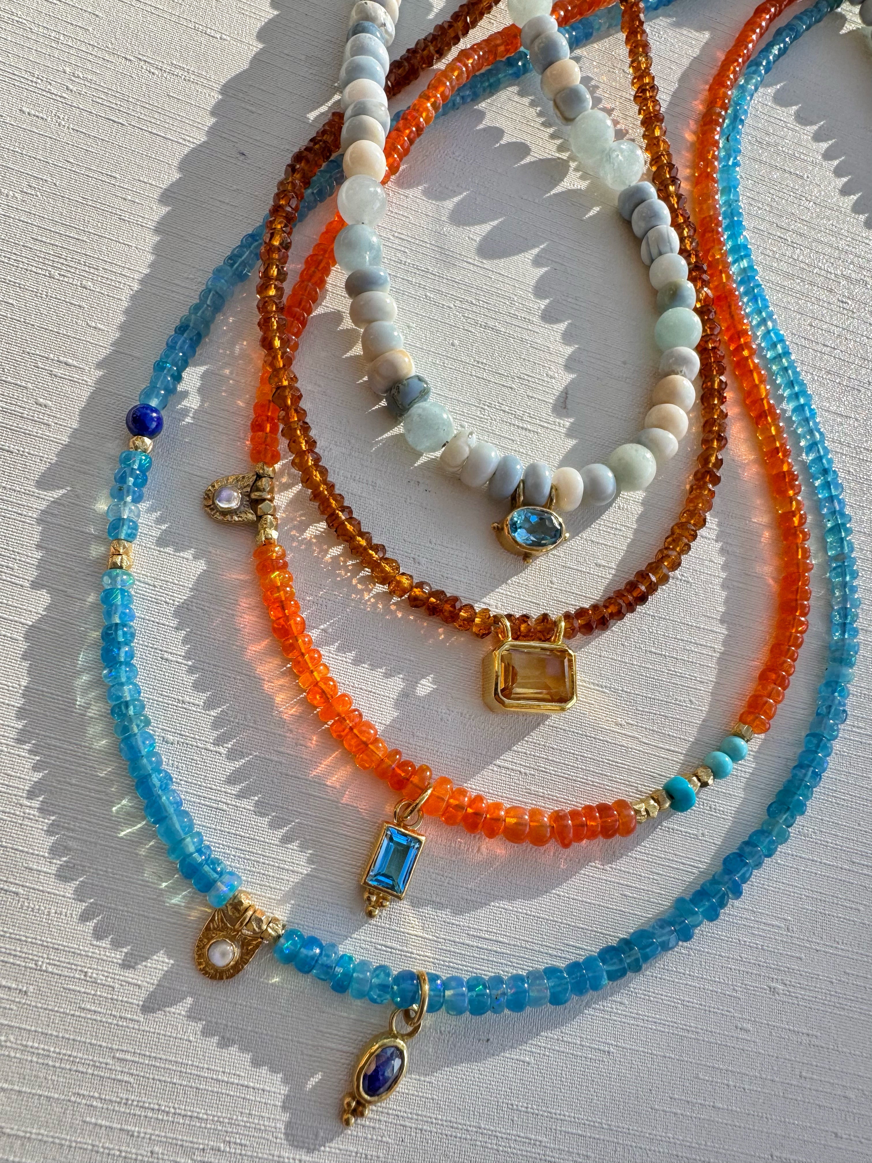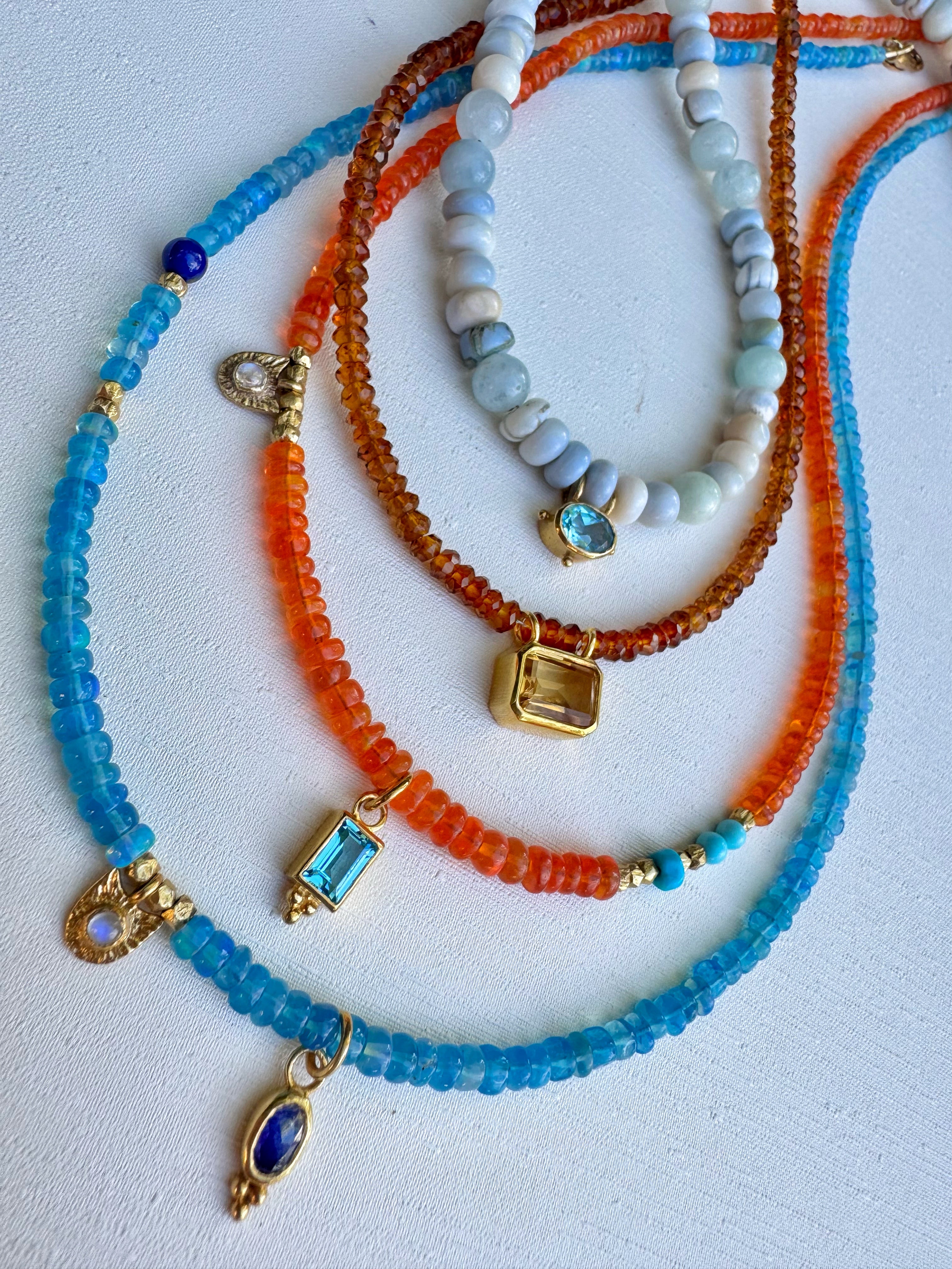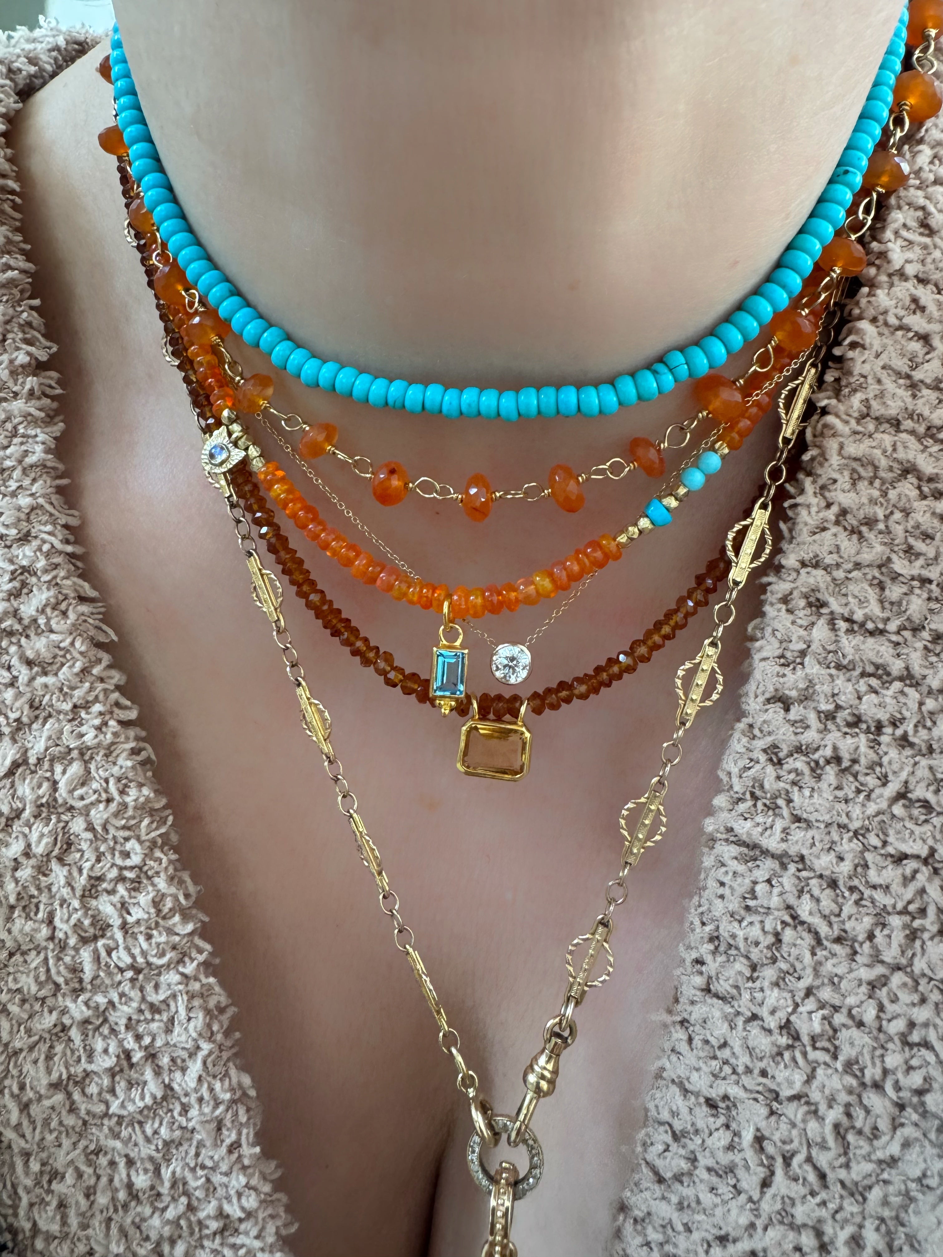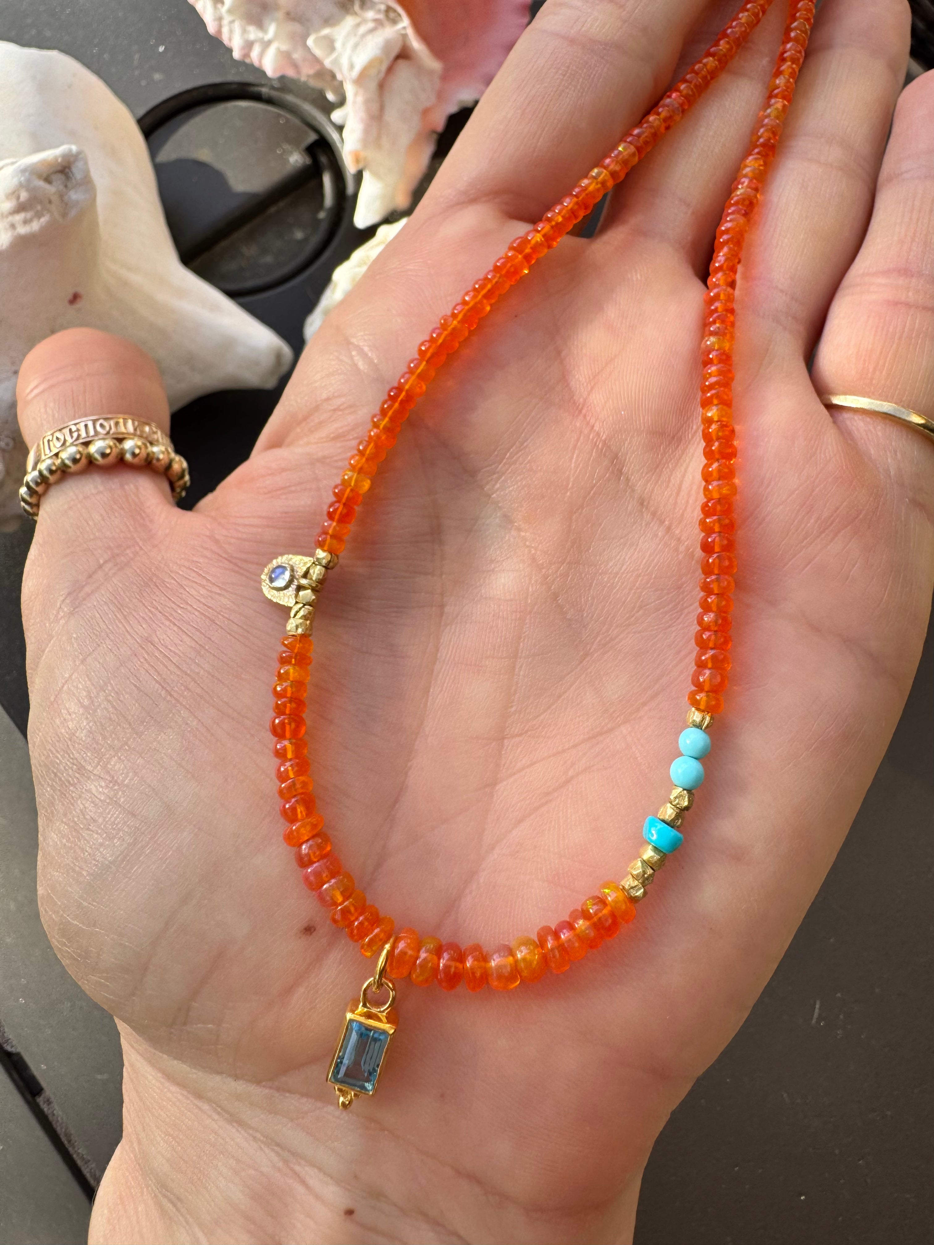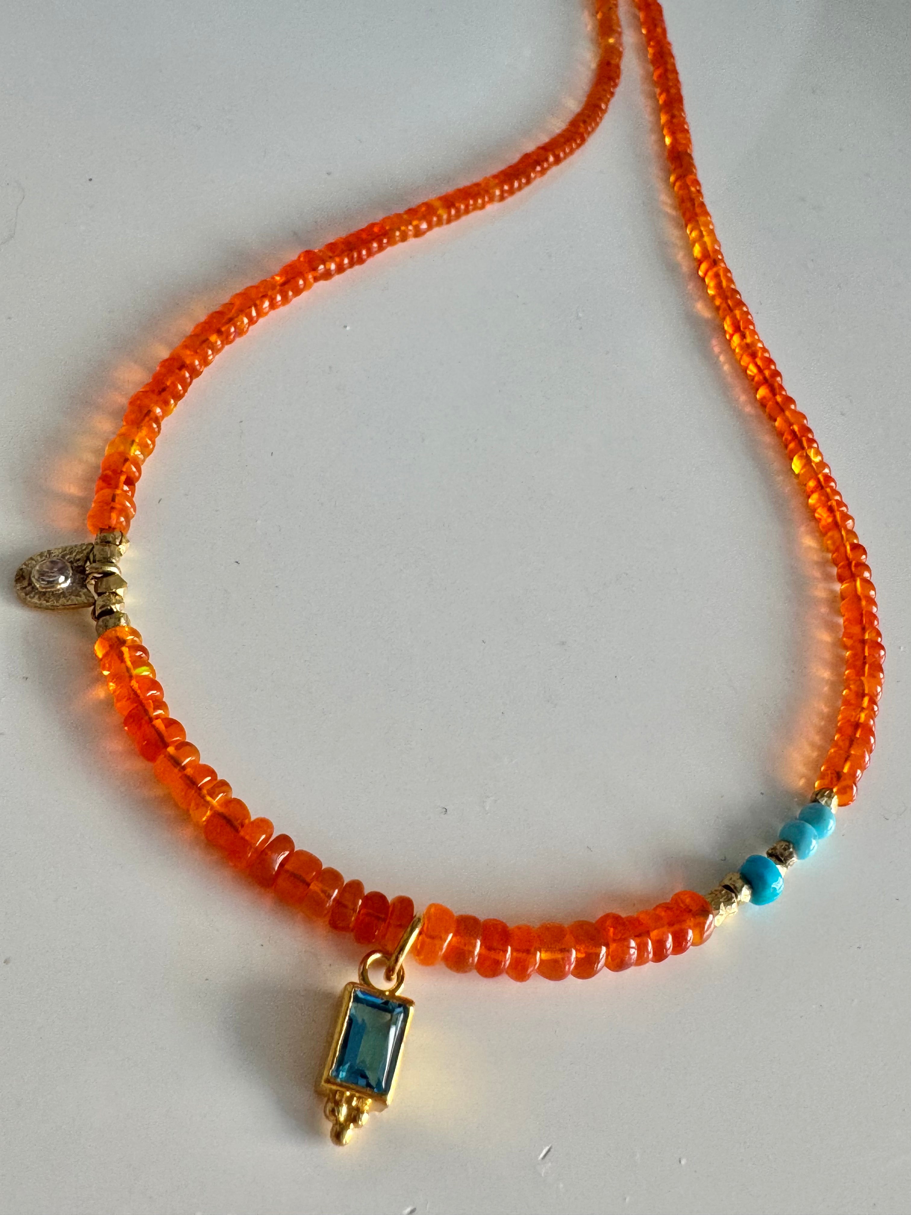 Beautiful orange Ethiopian opal bead necklace with vermeil blue topaz/moonstone charms sprinkled with Arizona turquoise beads. Just wow! What a striking piece in uncommon color combination! Great for layering. Gold filled findings and accents.