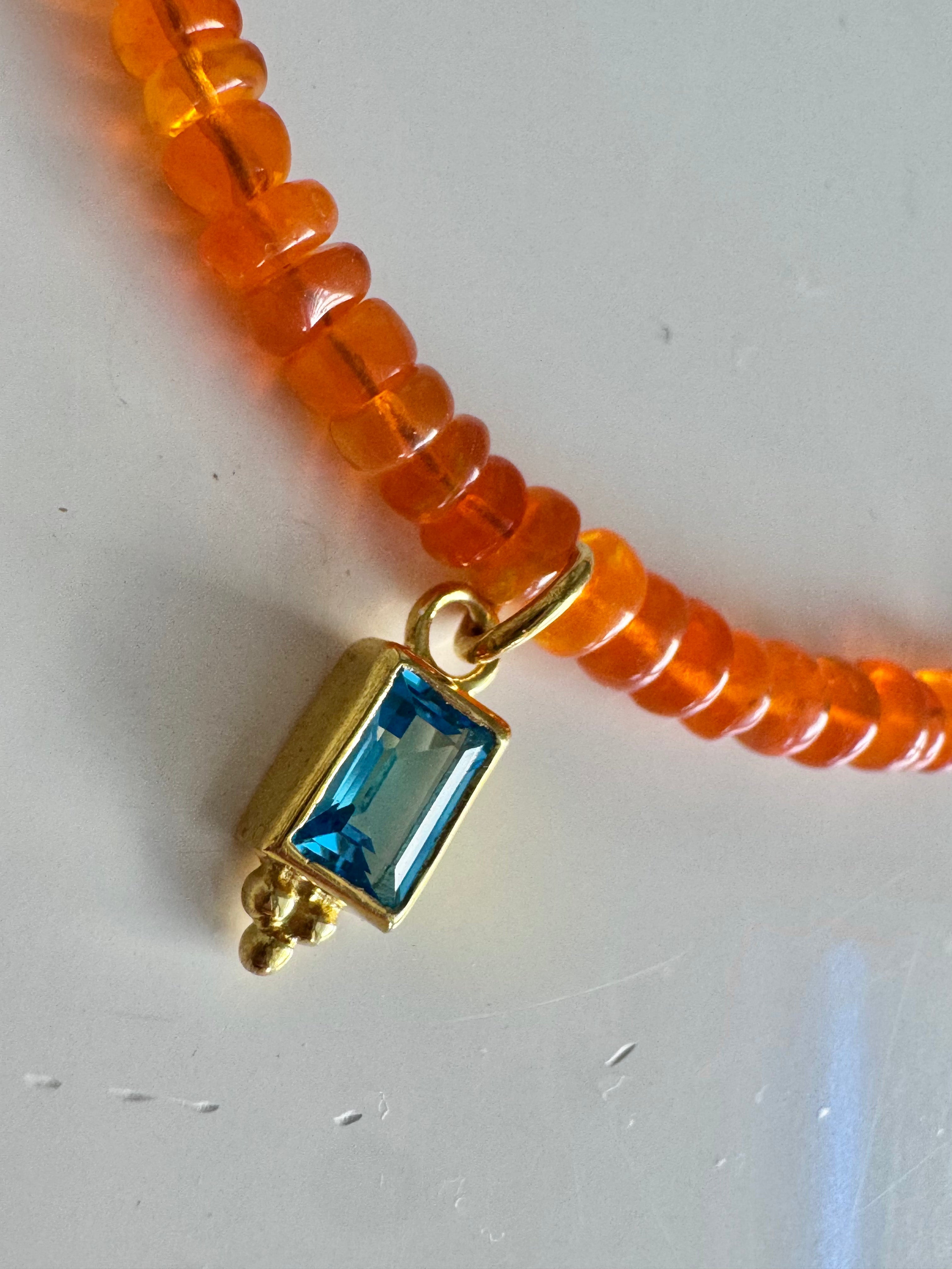 Beautiful orange Ethiopian opal necklace with blue topaz/moonstone charms