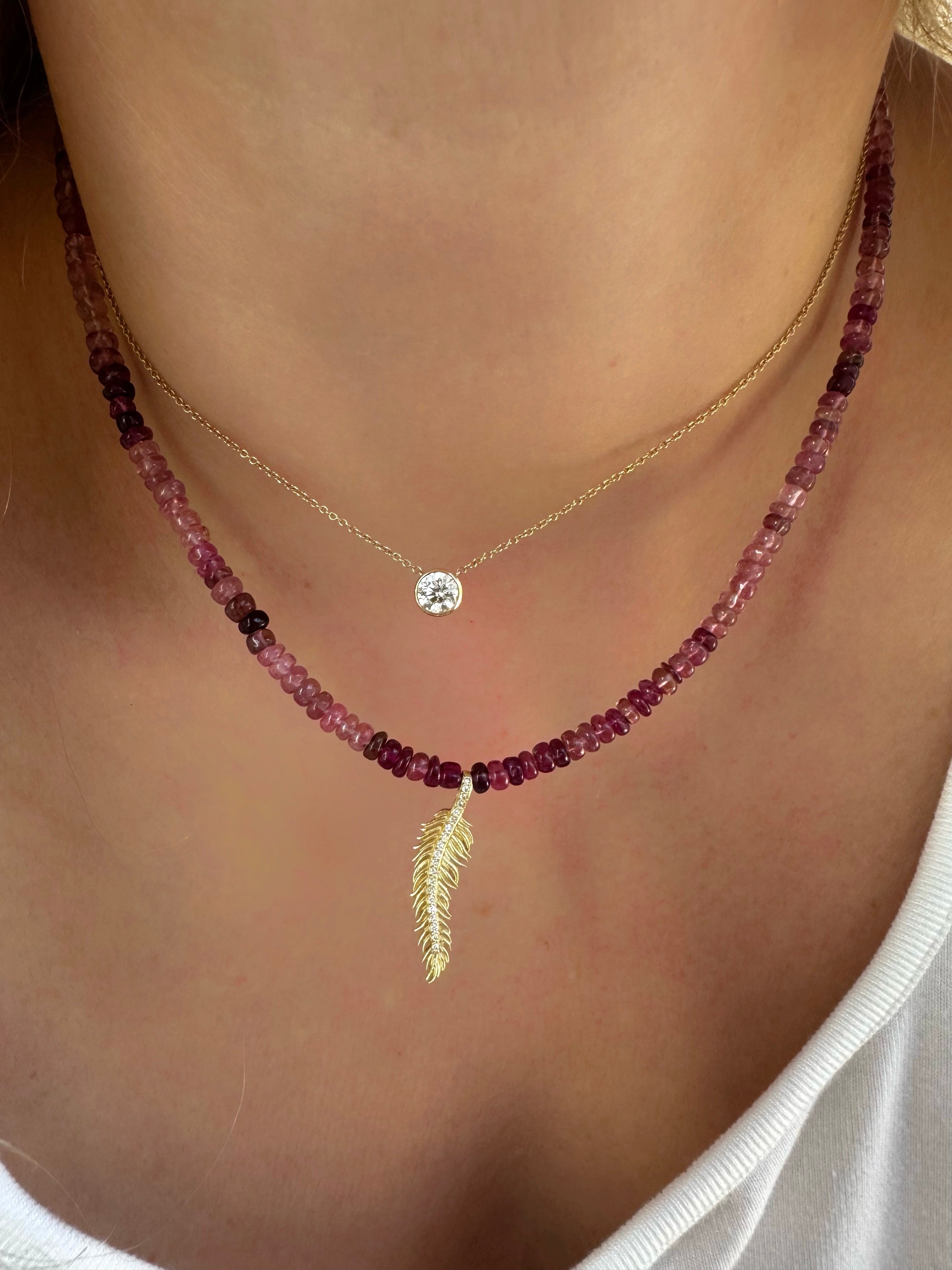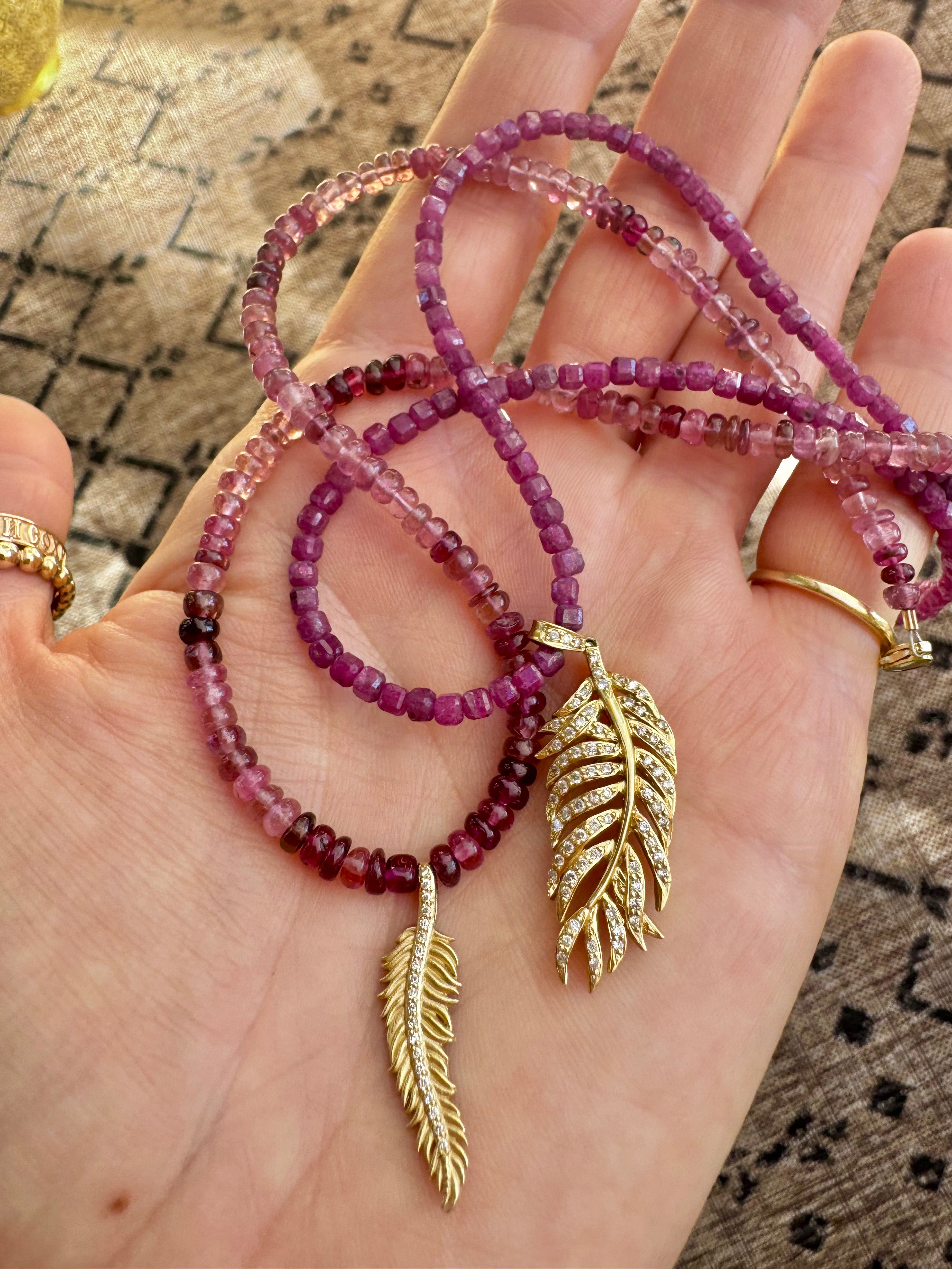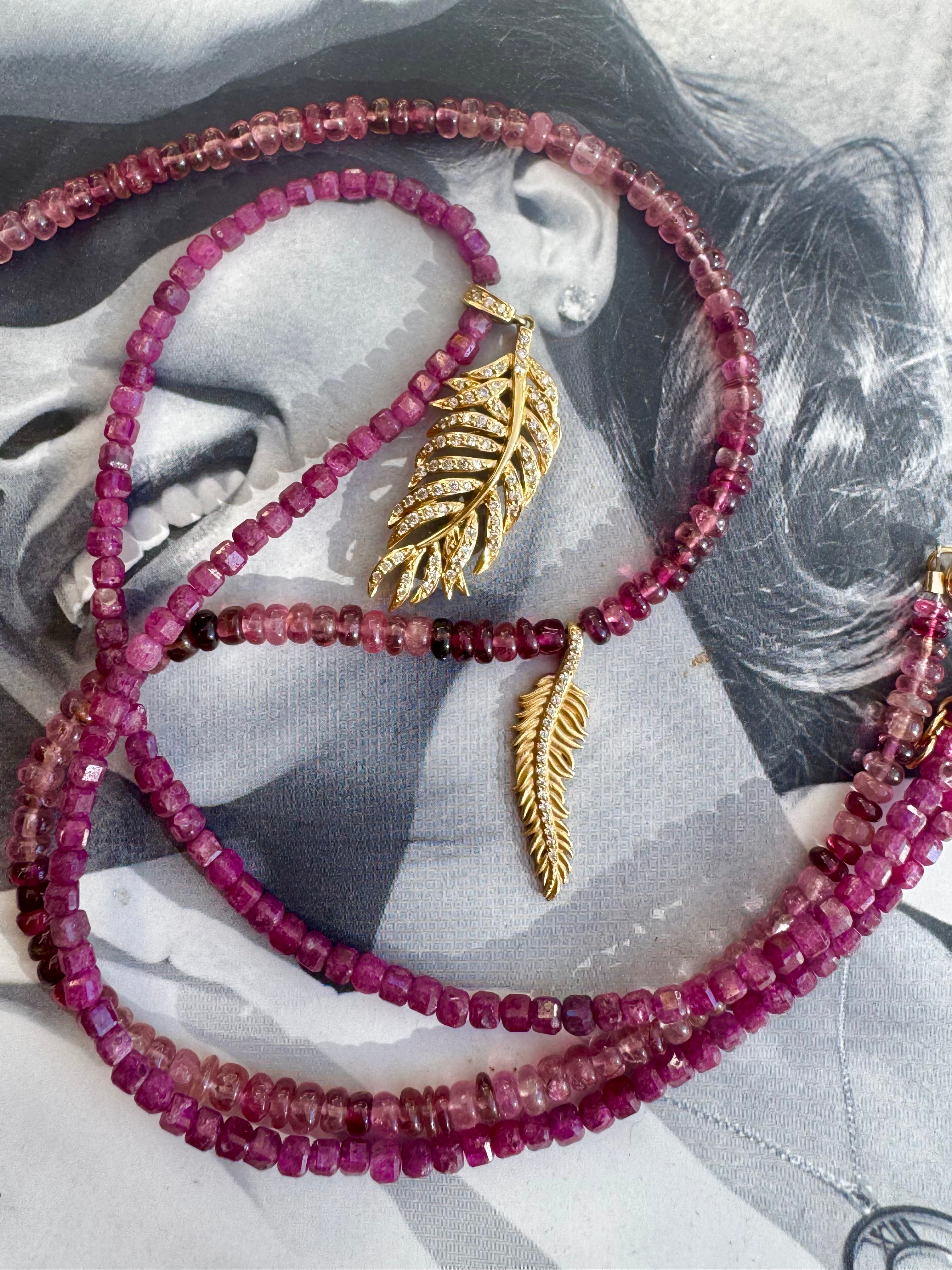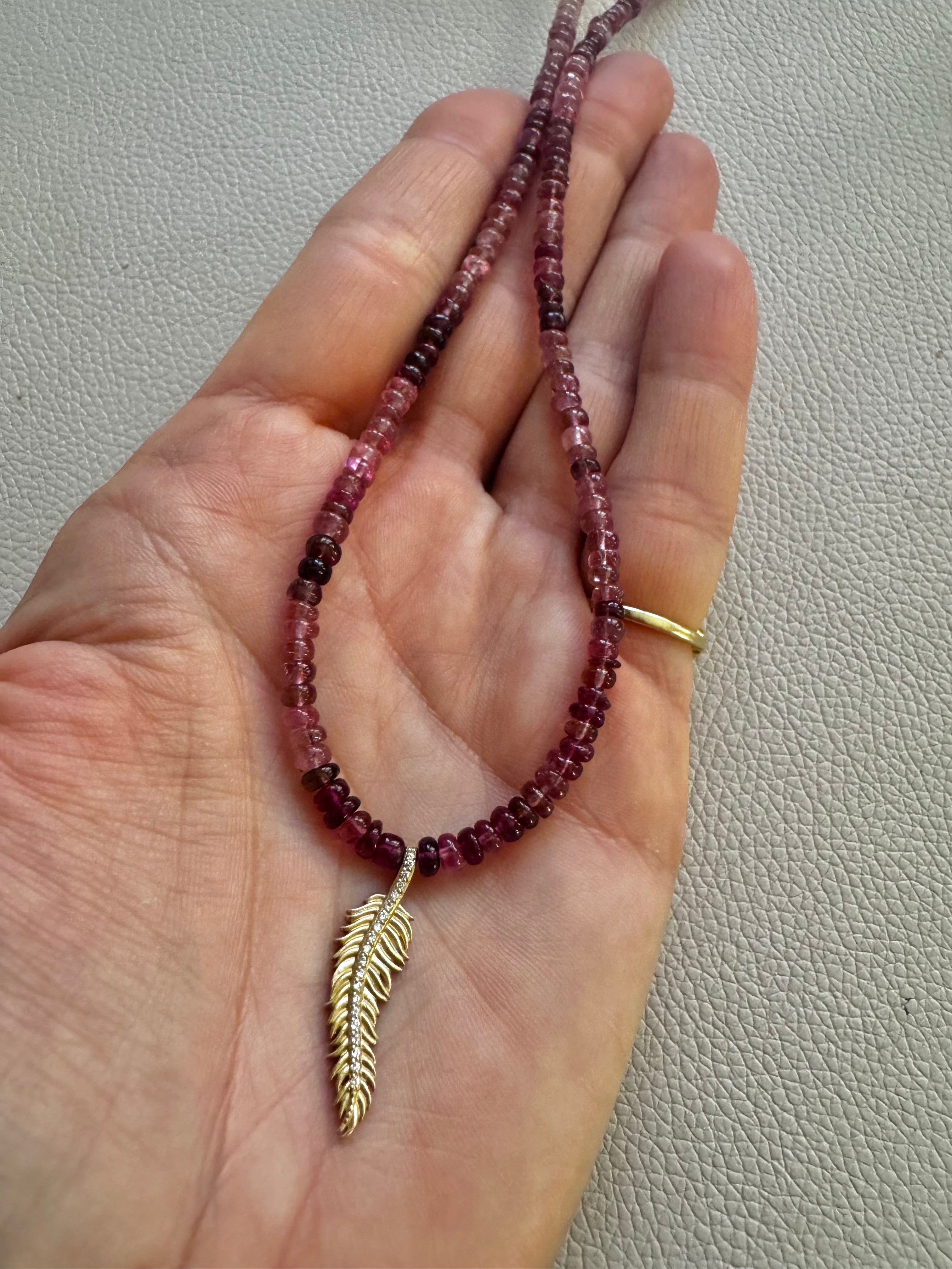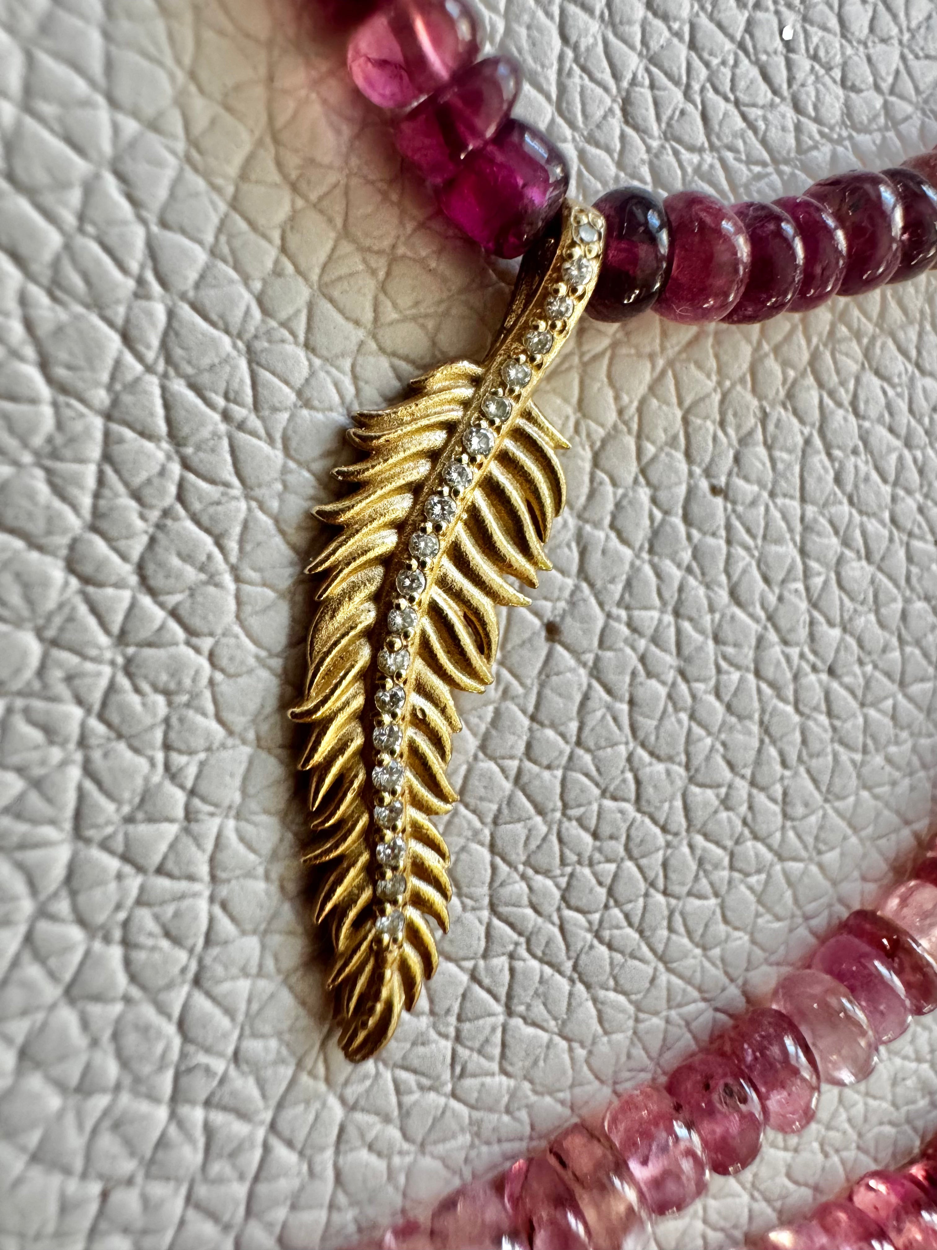 Gorgeous AAA pink tourmaline bead necklace with 14KT gold/diamoind feather pendant