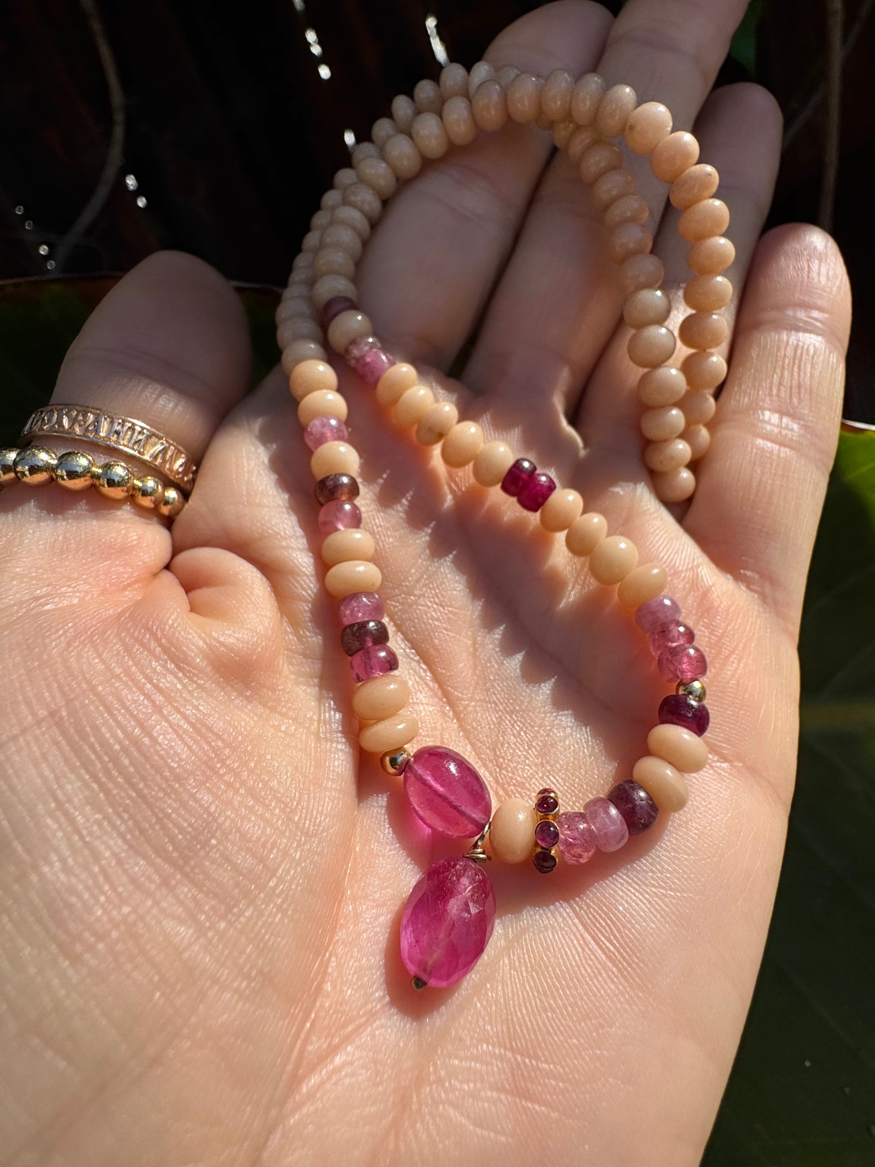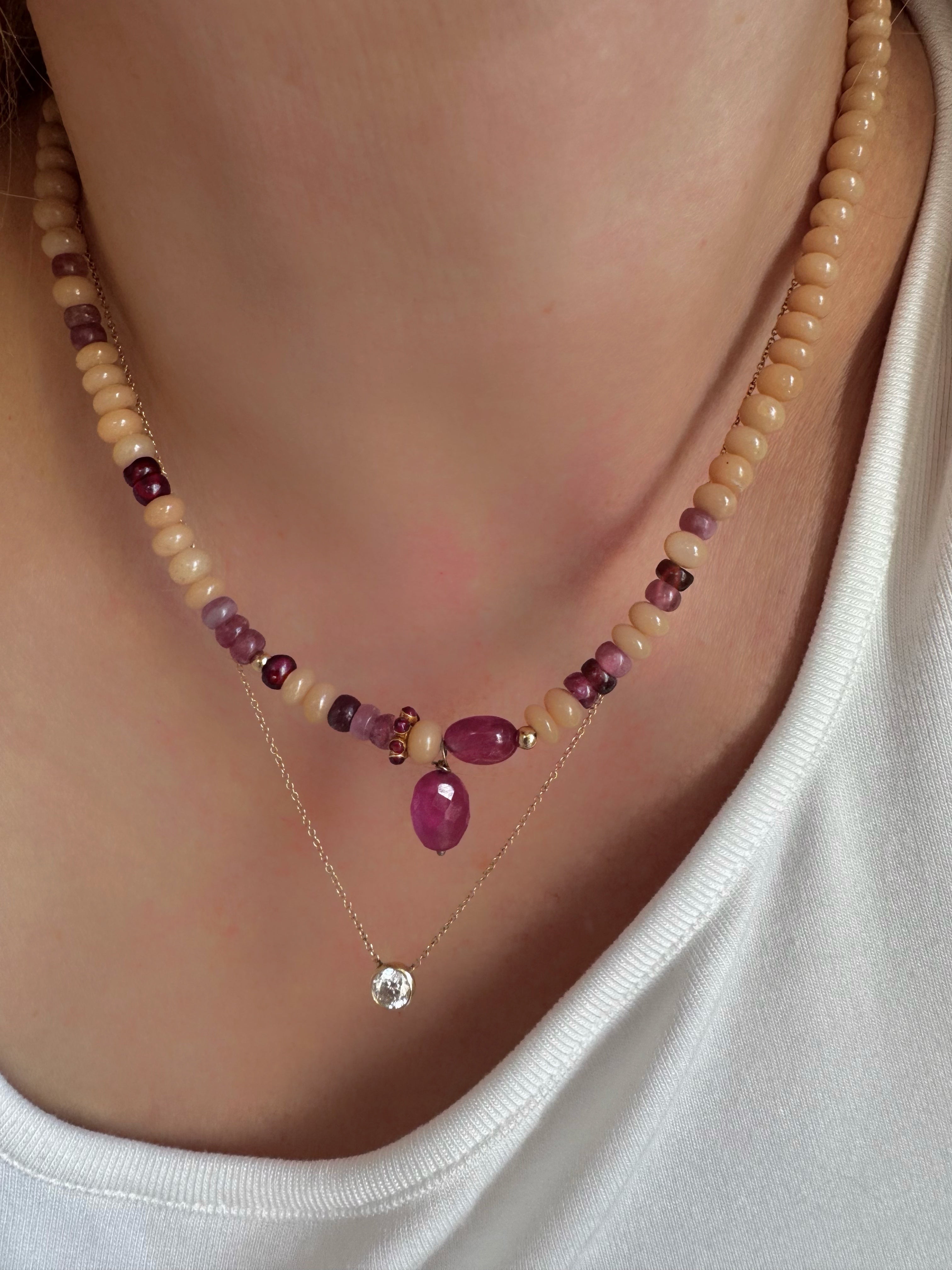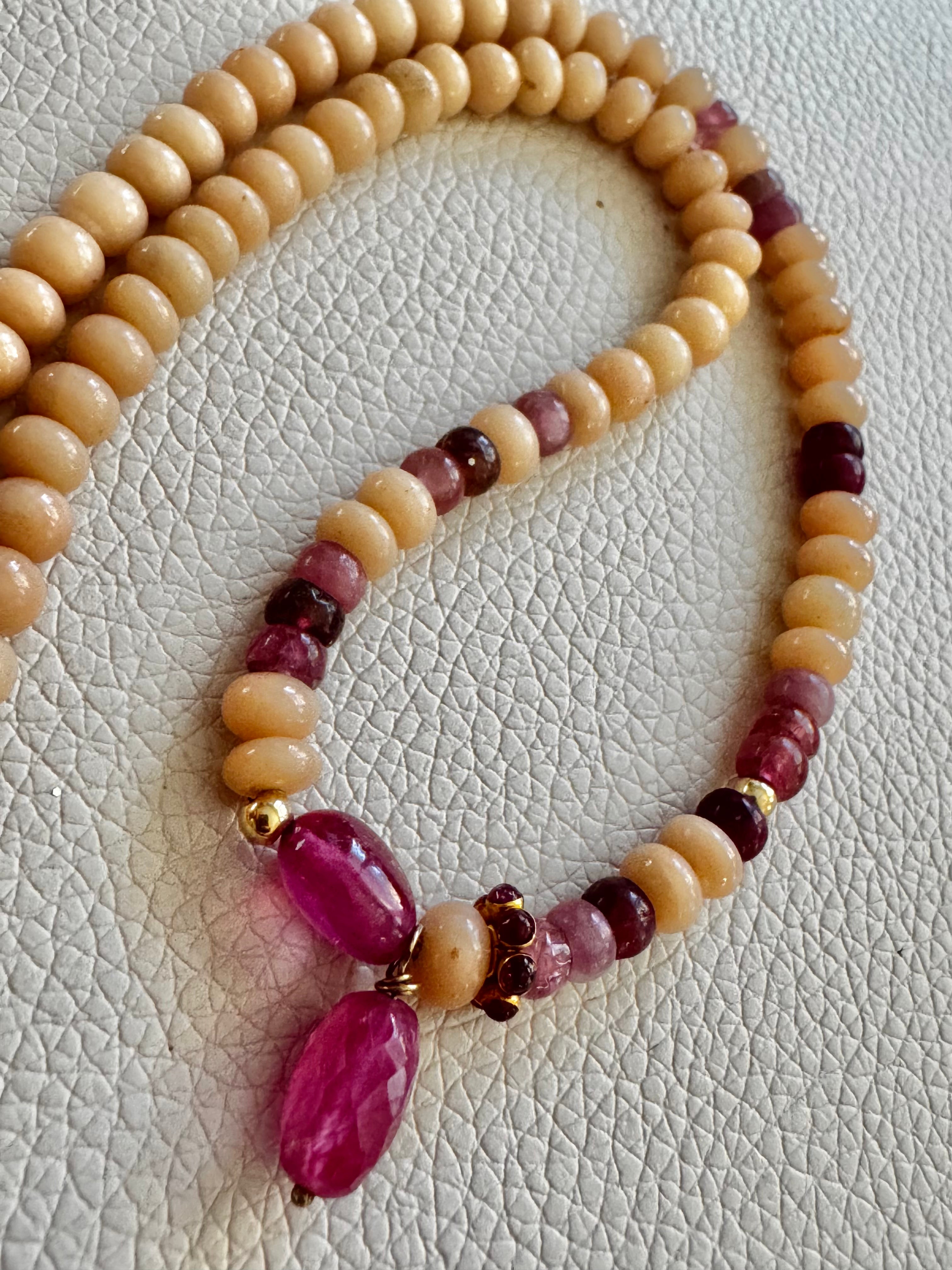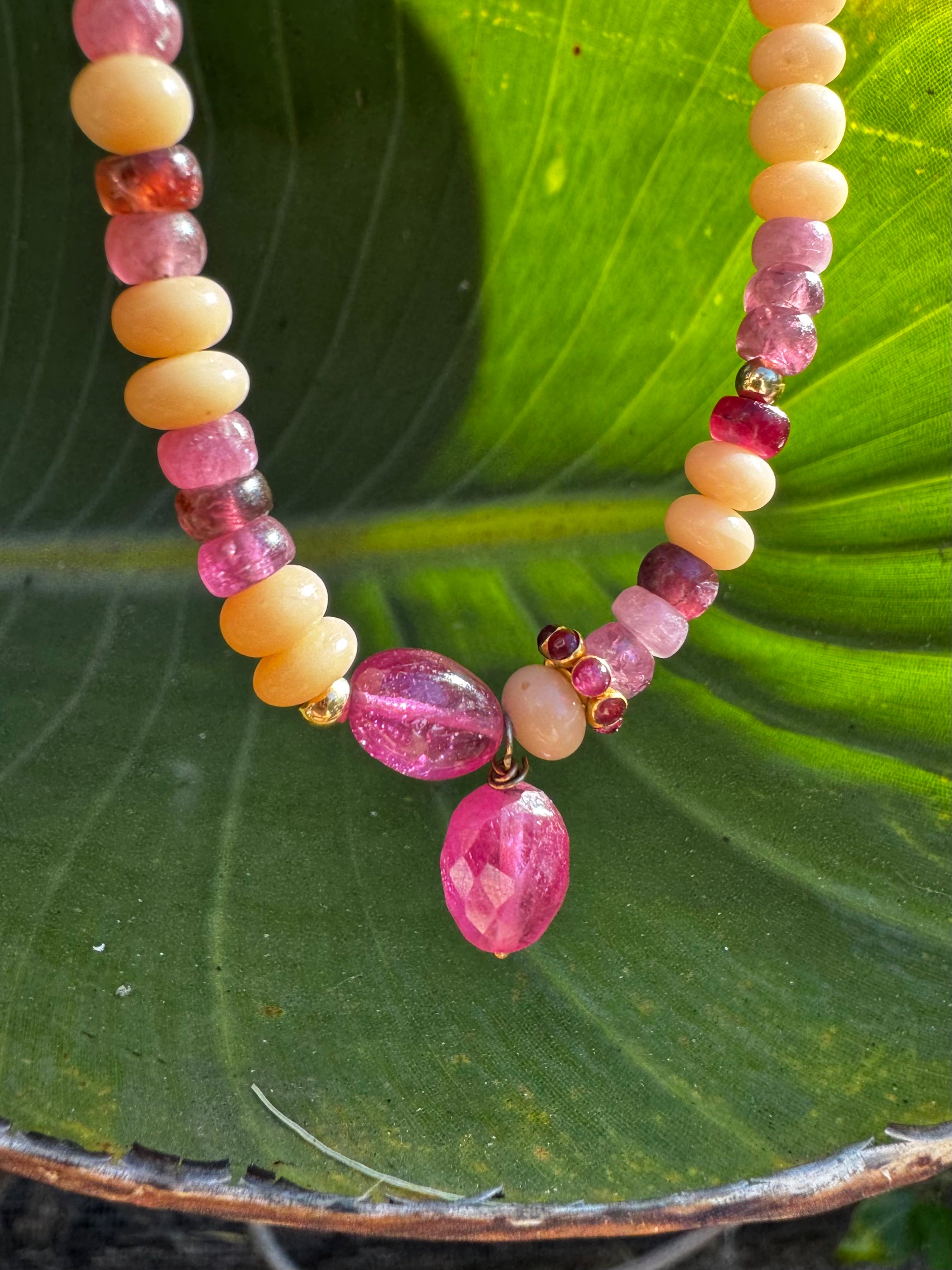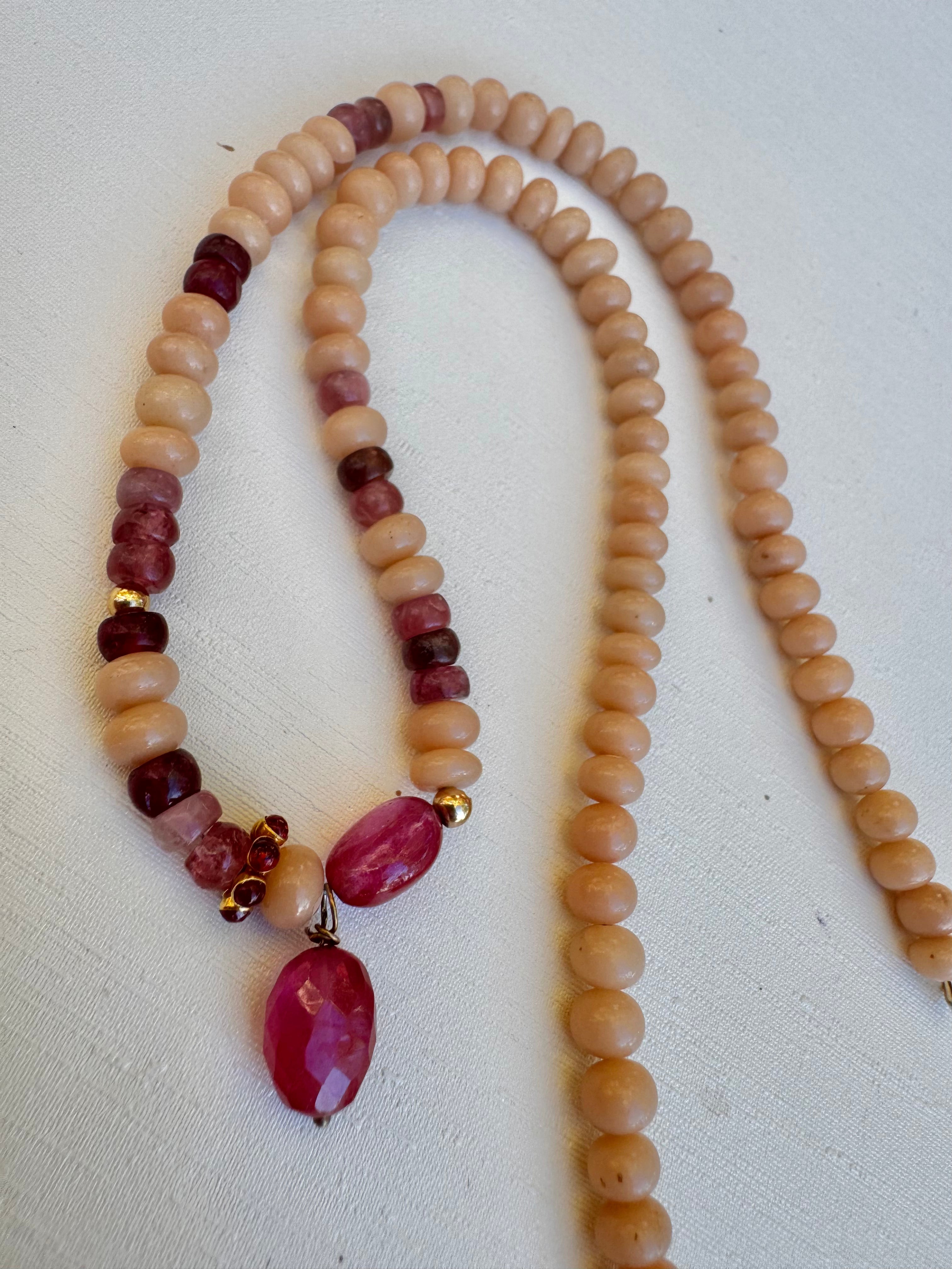 Peach opal/pink sapphire/ruby bead necklace with 18KT gold/ruby accent rondelle bead