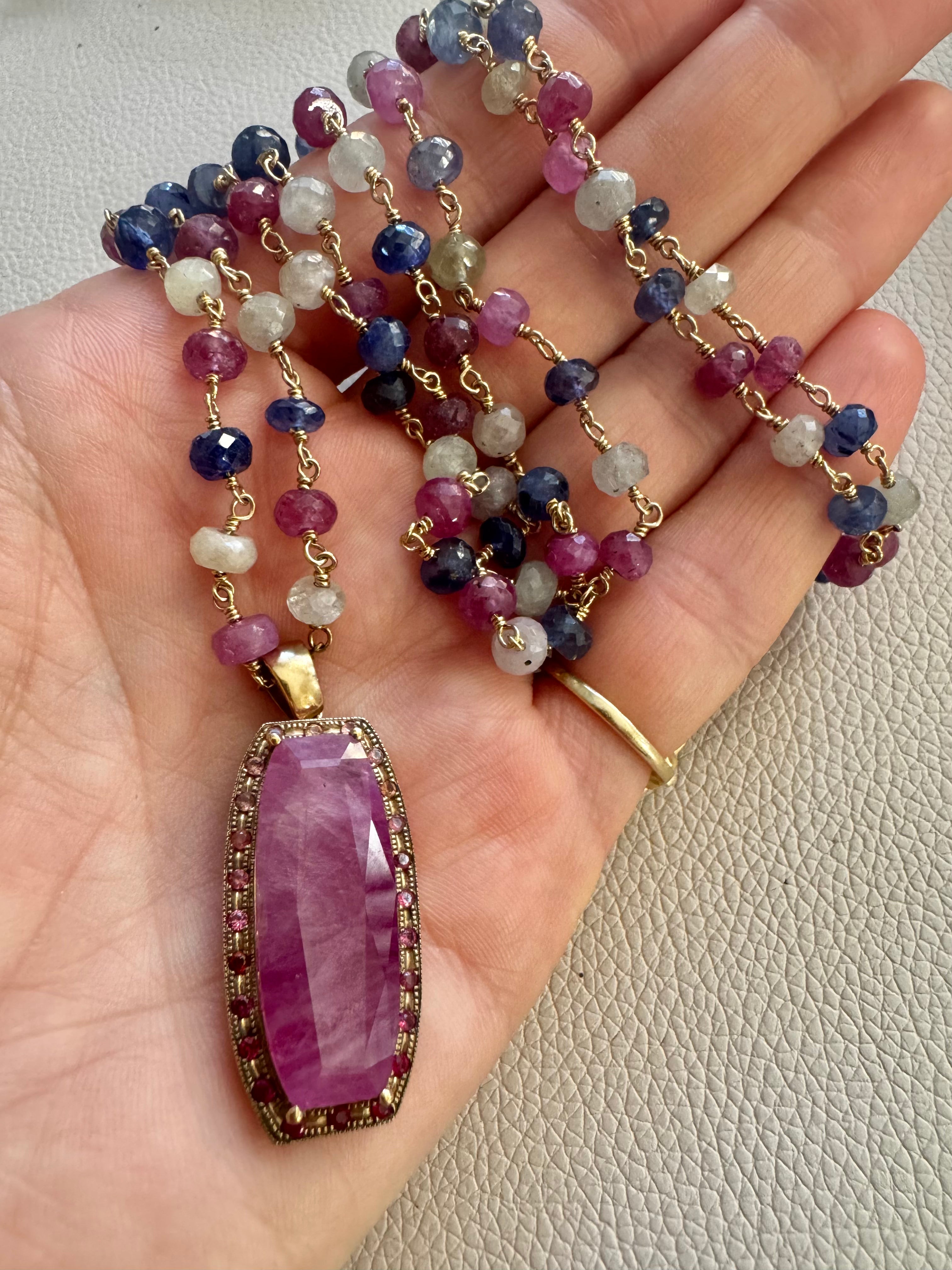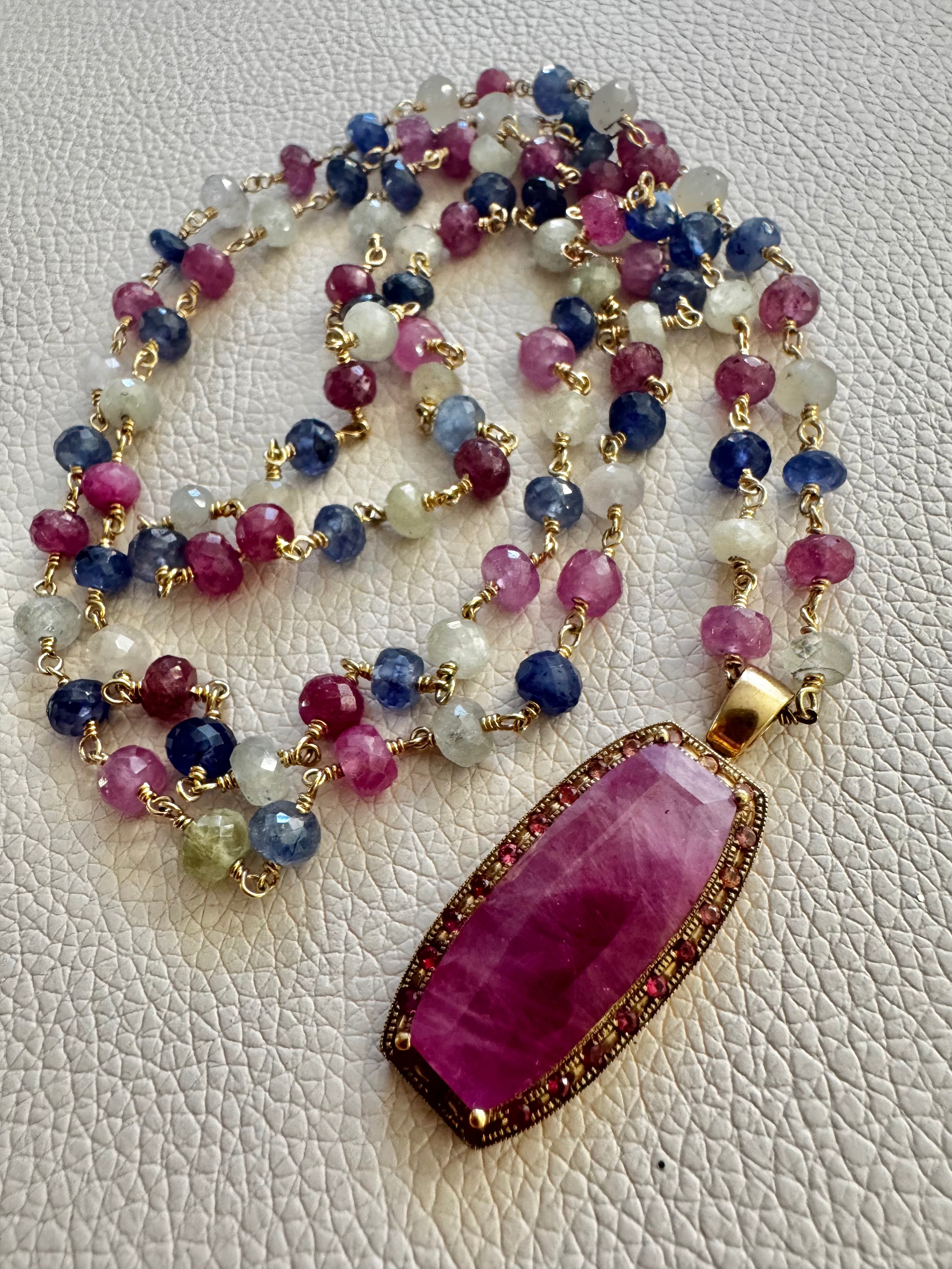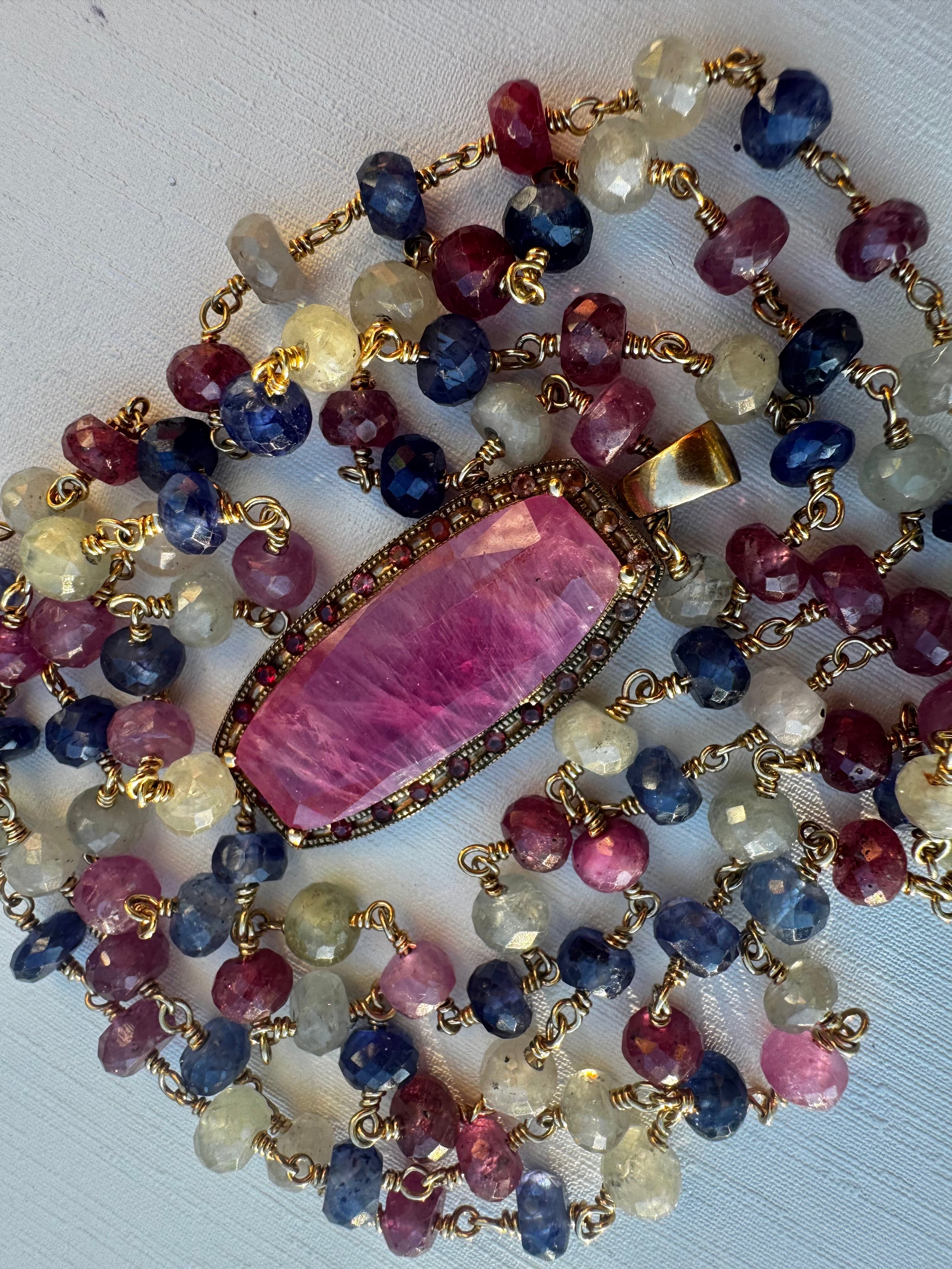 Stunning statement multi color sapphire rosary with 9K gold/rustic ruby pendant