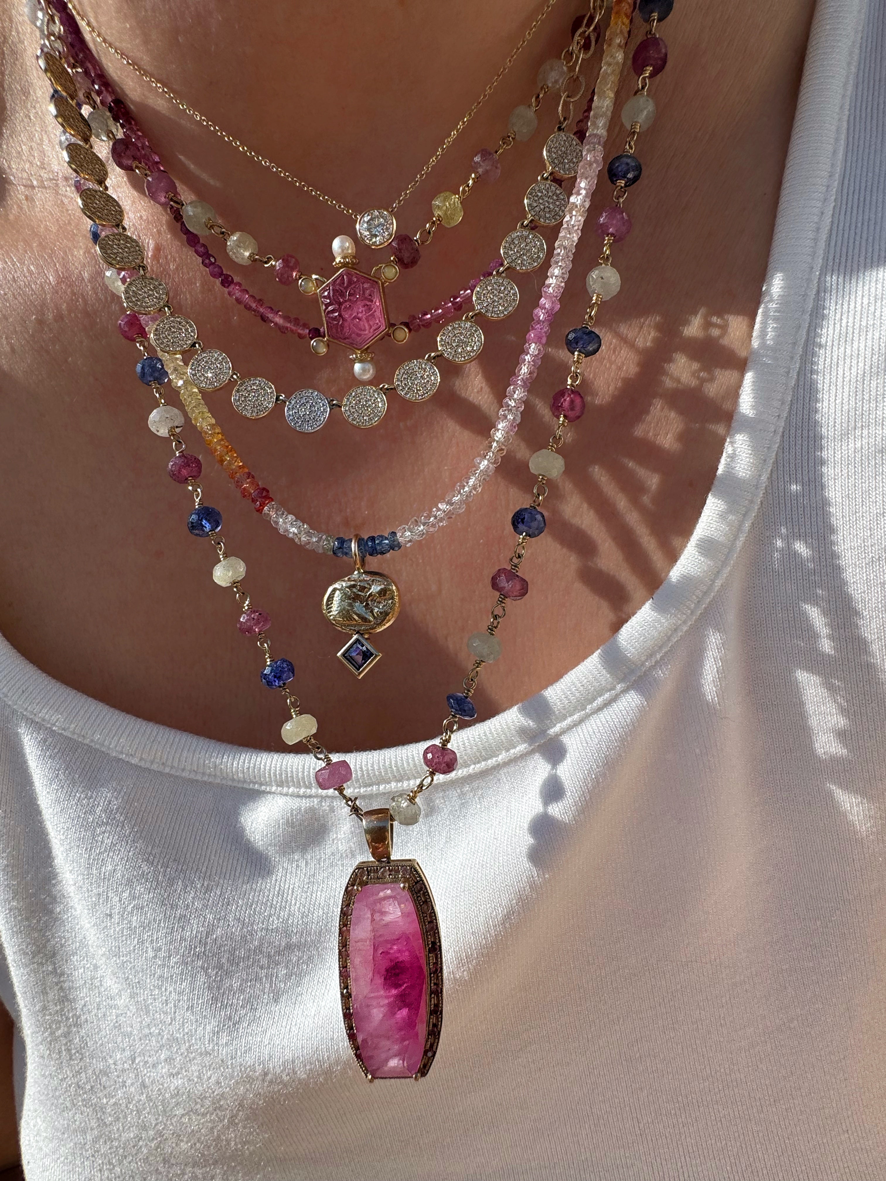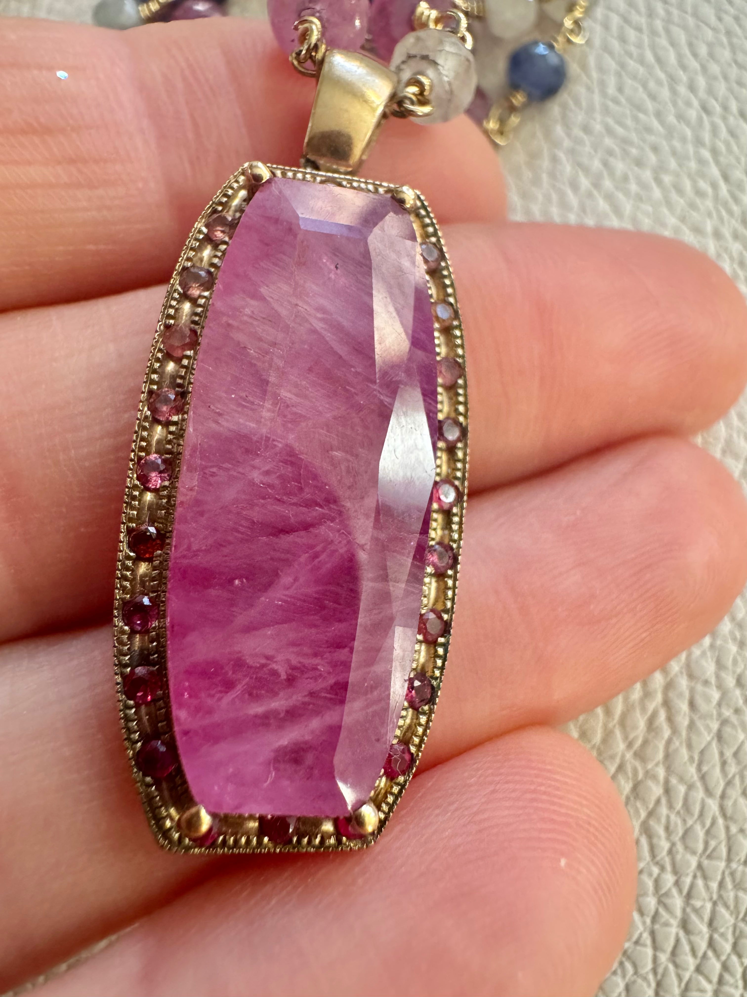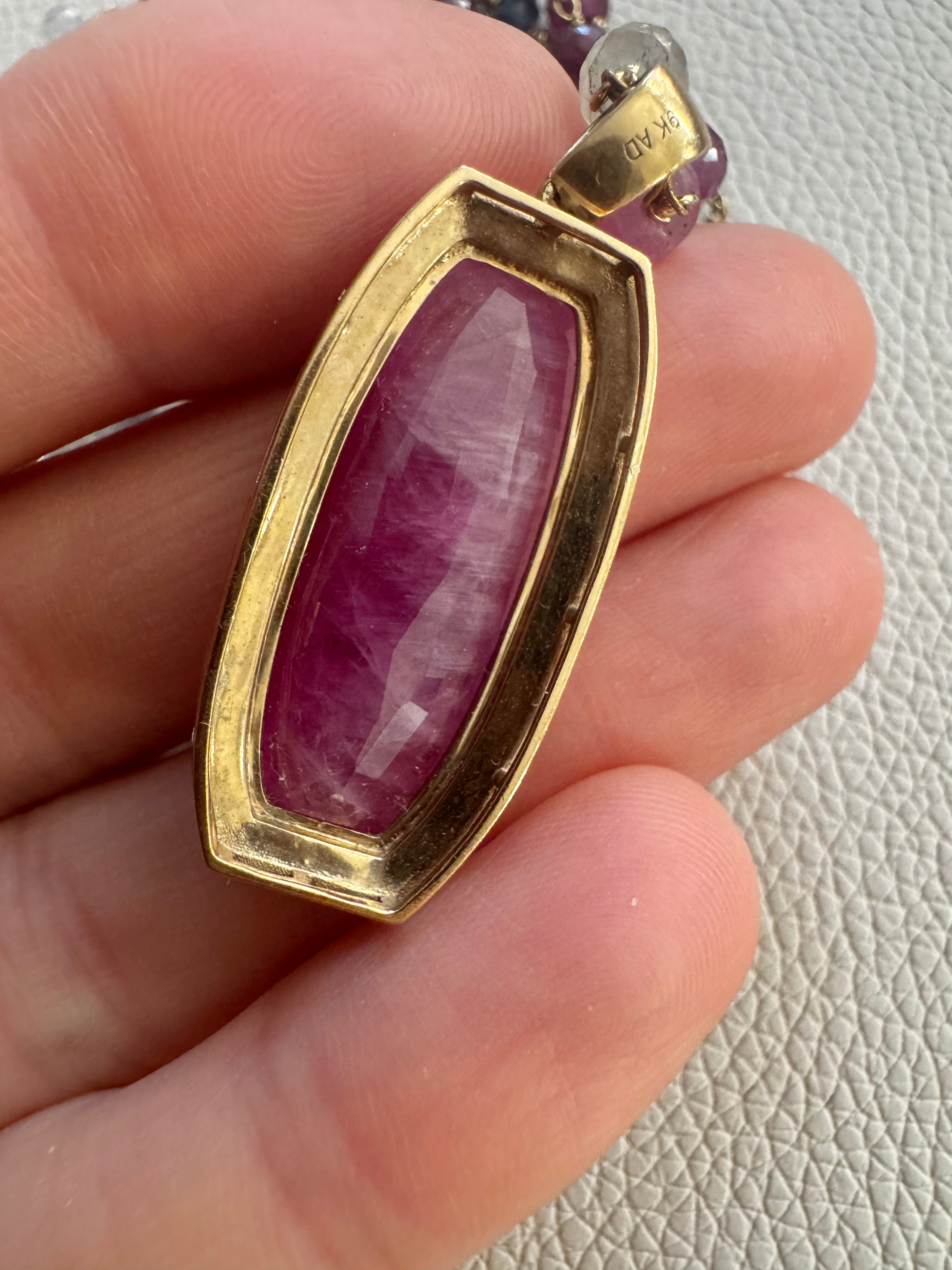 Stunning statement multi color sapphire rosary with 9K gold/rustic ruby pendant
