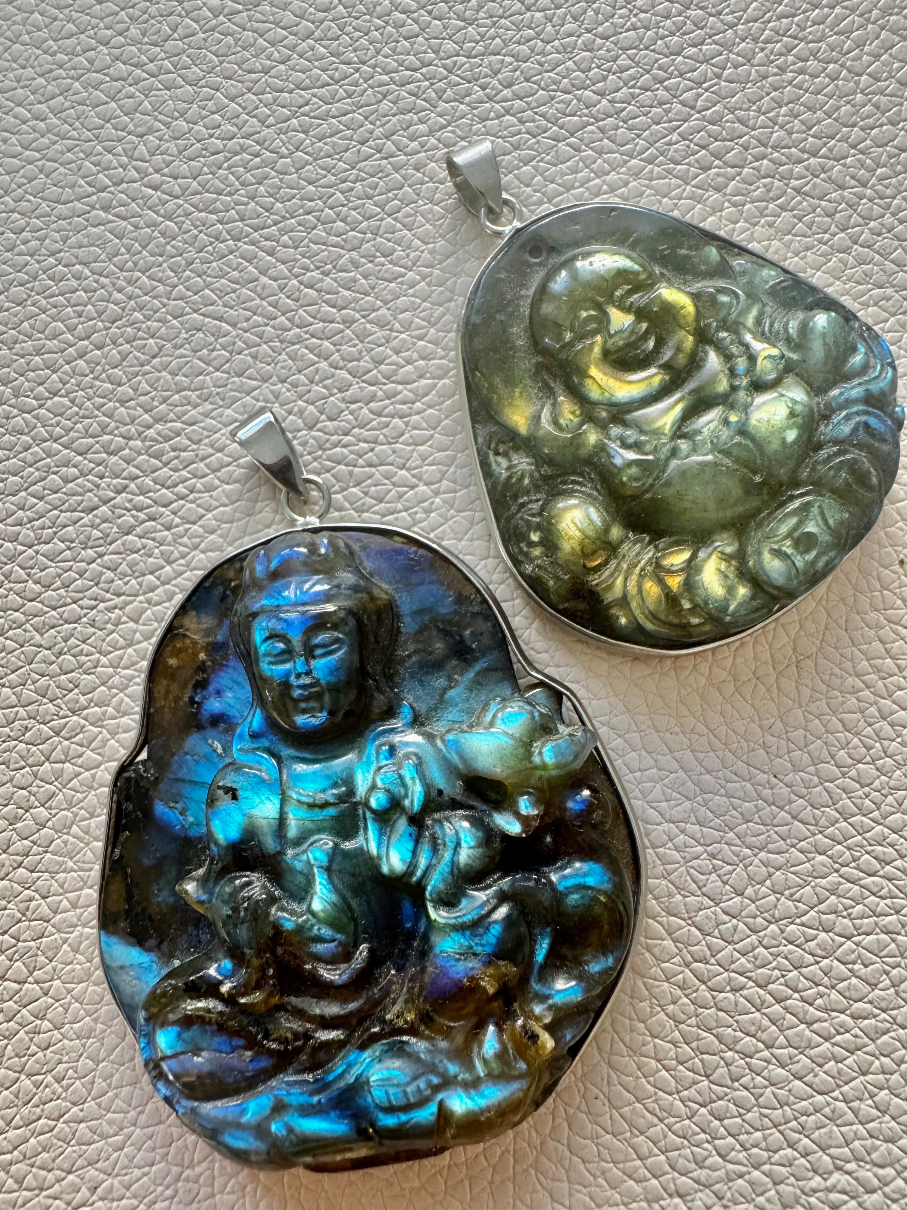 Stunning statement hand carved labradorite Buddha pendant. Just wow! Gorgeous blue/green/yellow flash (iridescence) plays as you move wearing it. Bail is large enough to wear with small/medium sized beads. Highly detailed.