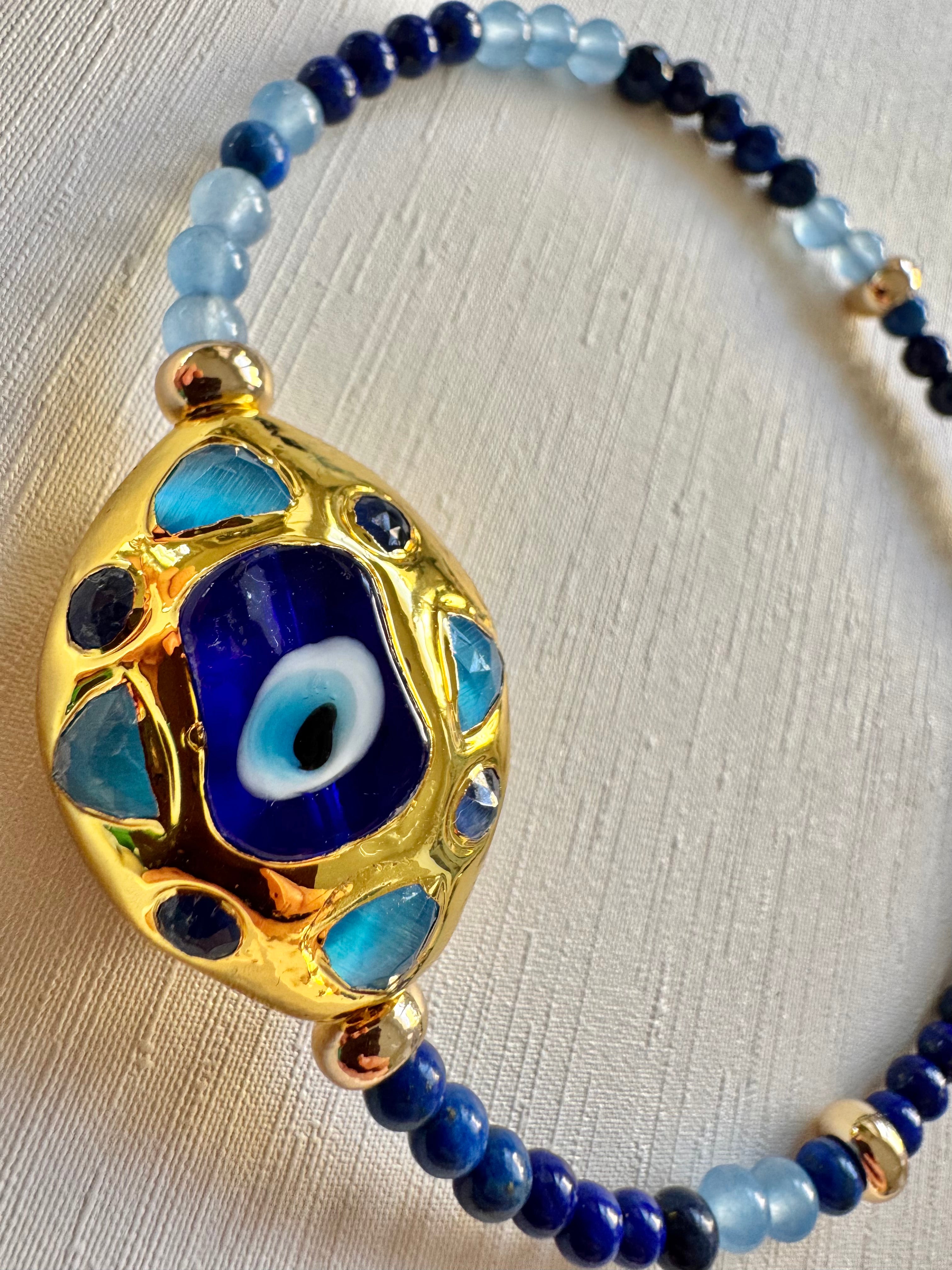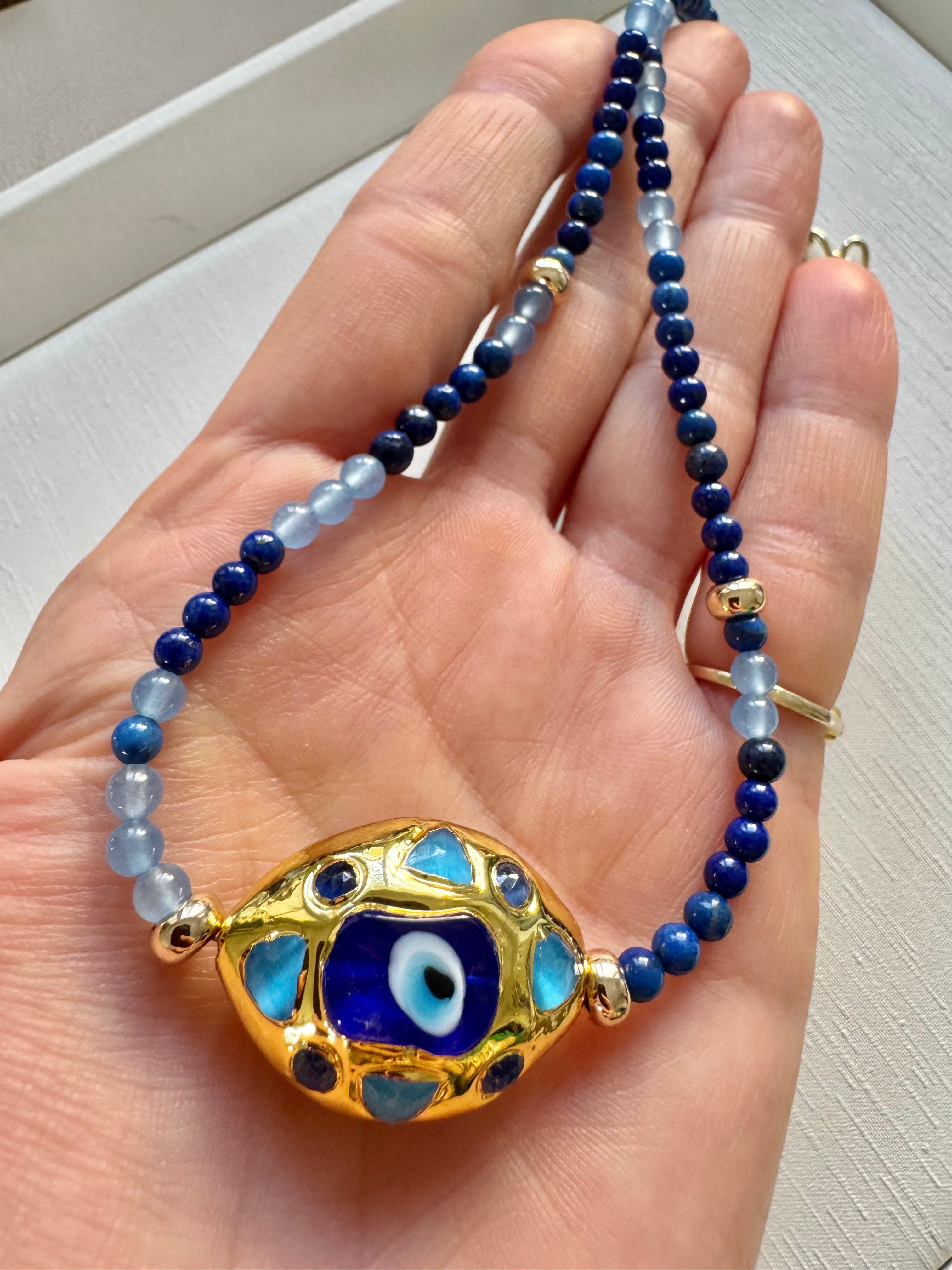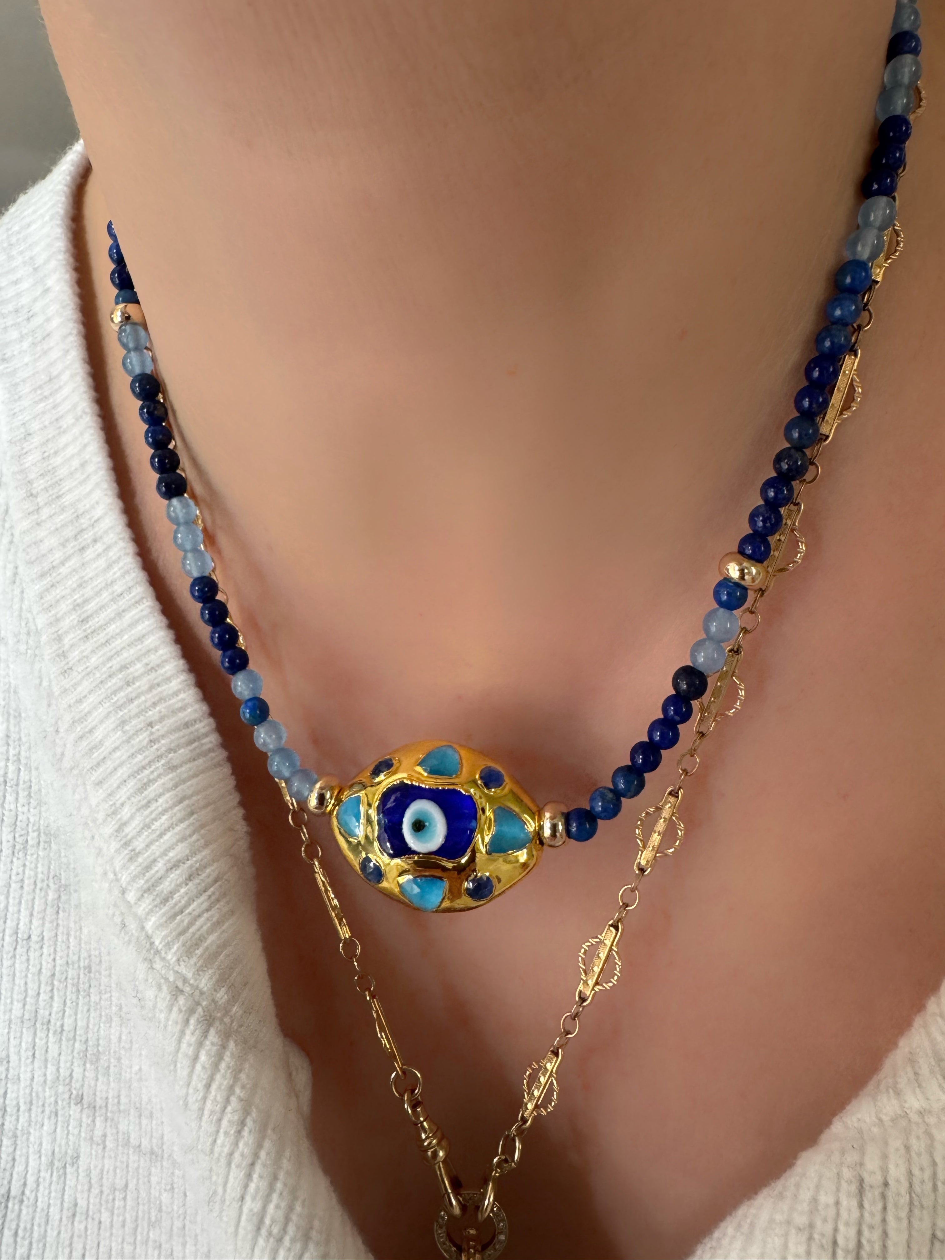 Whimsical lapis/blue chalcedony evil eye bead necklace
