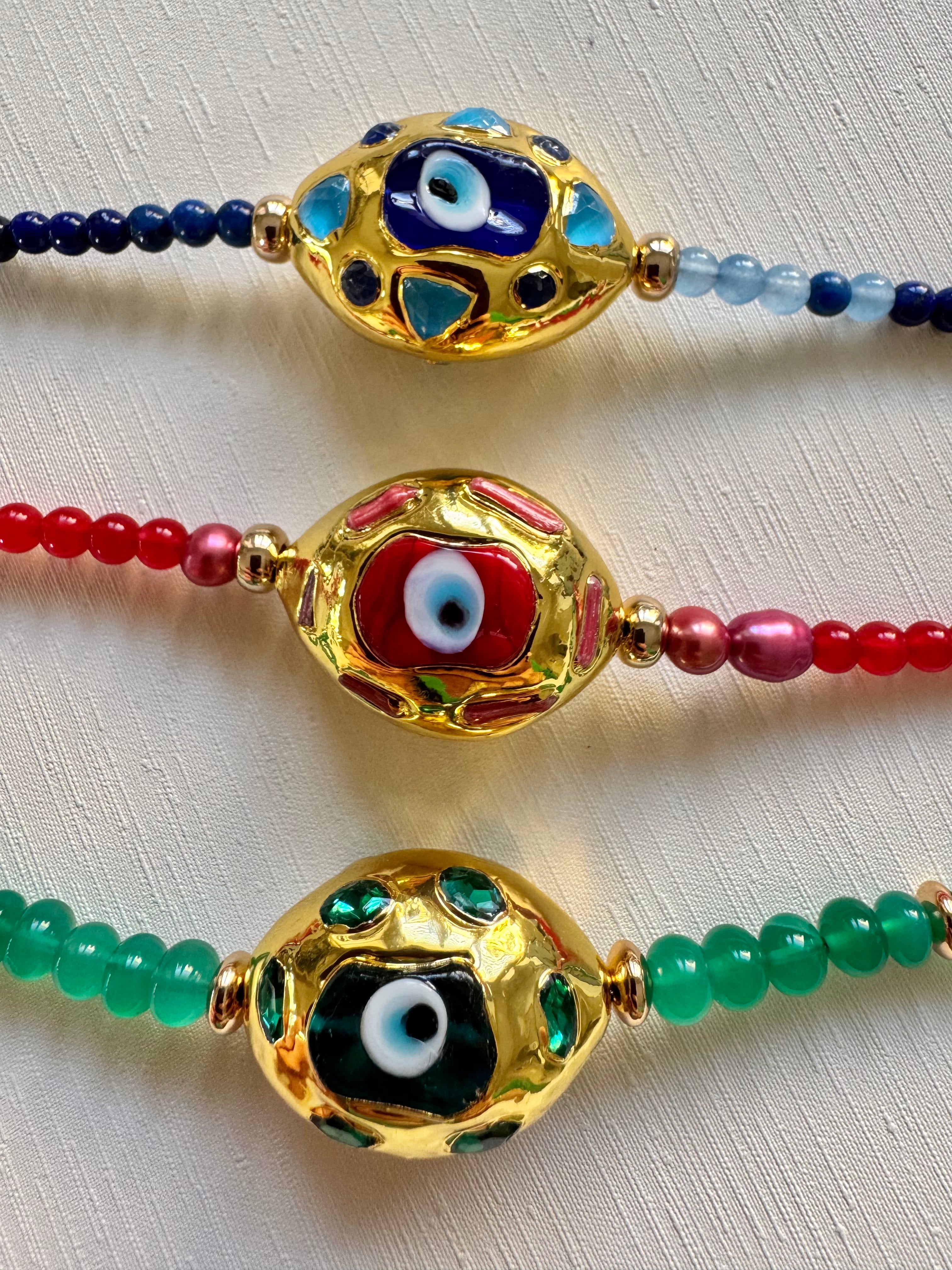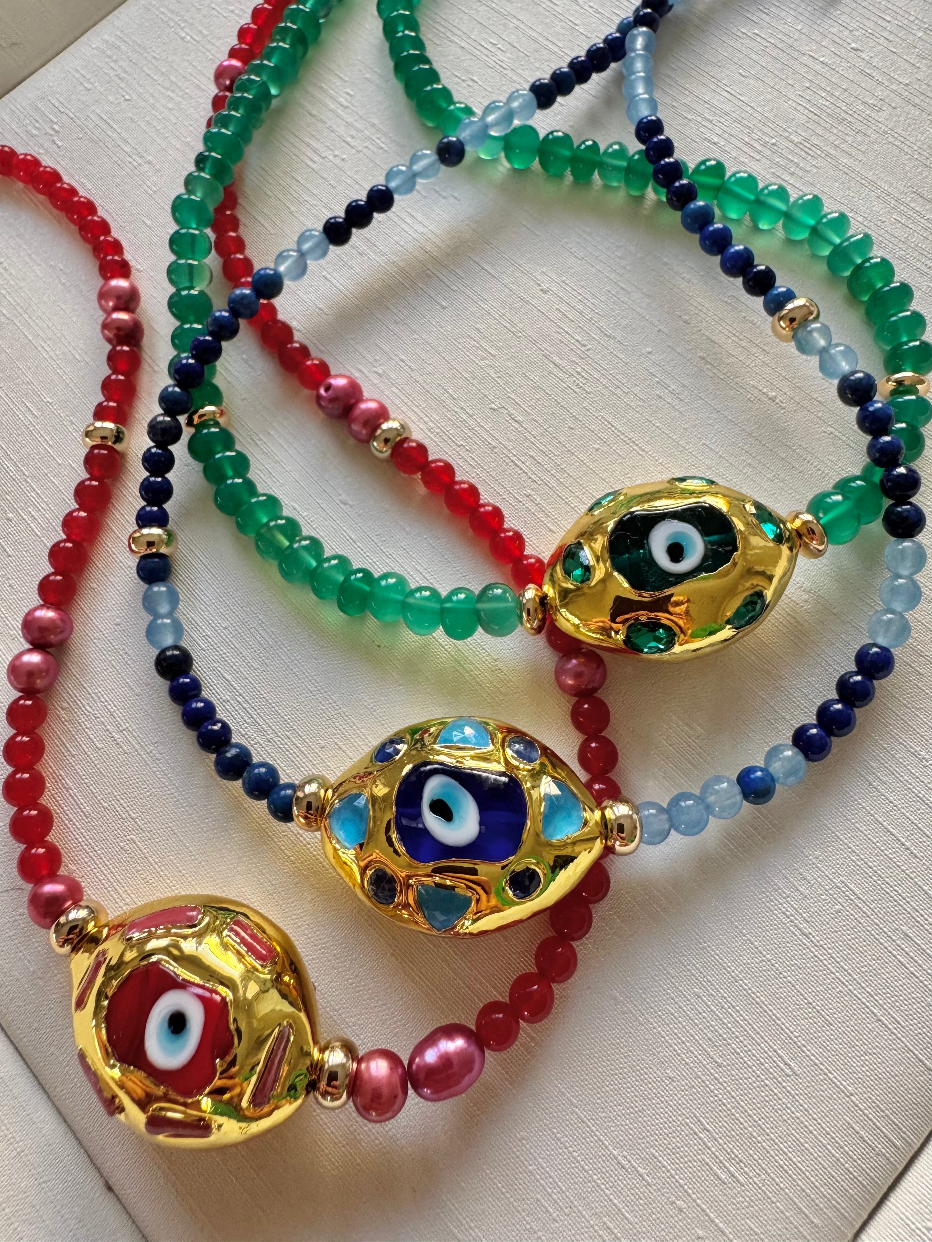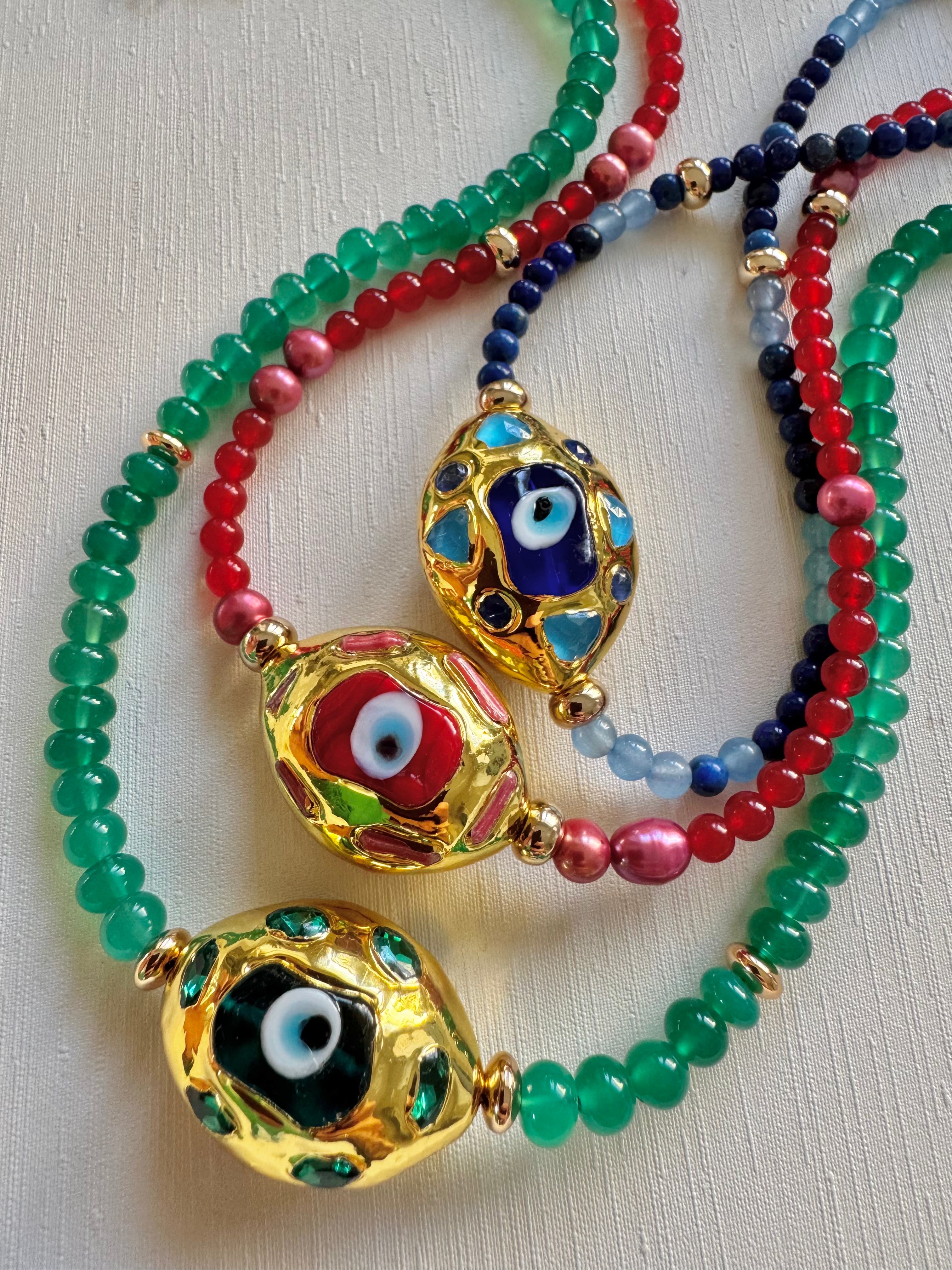 Whimsical lapis/blue chalcedony evil eye bead necklace