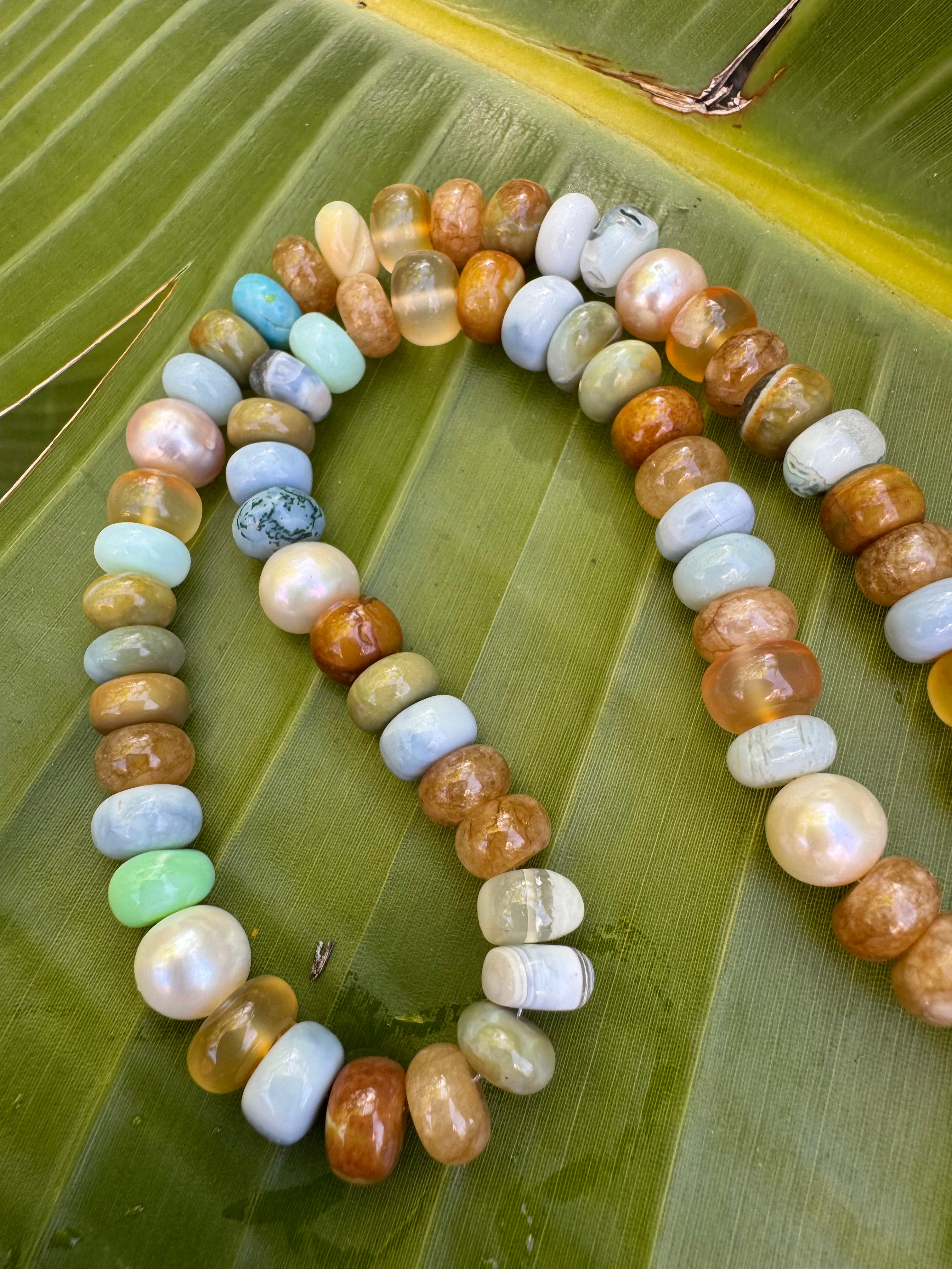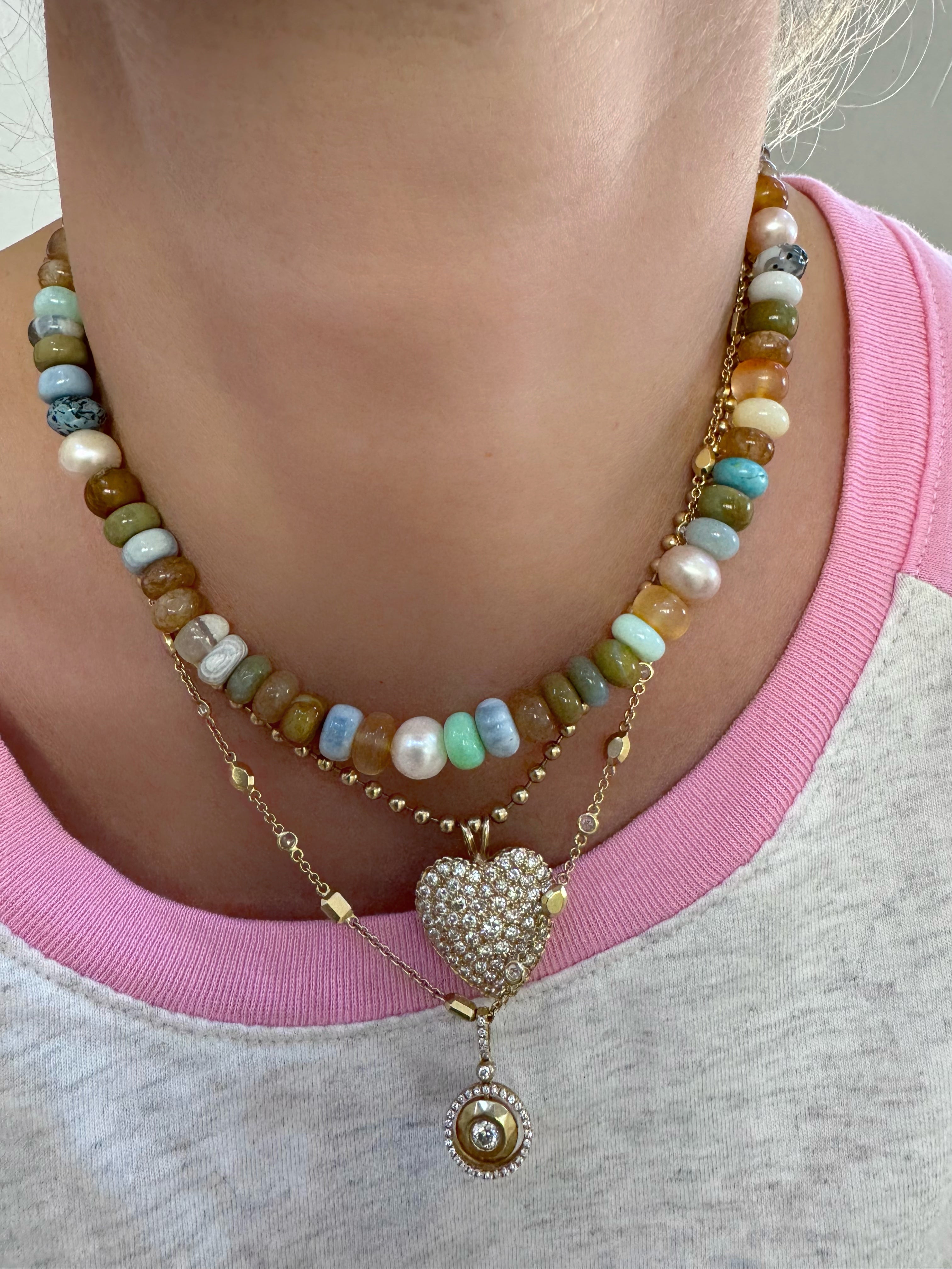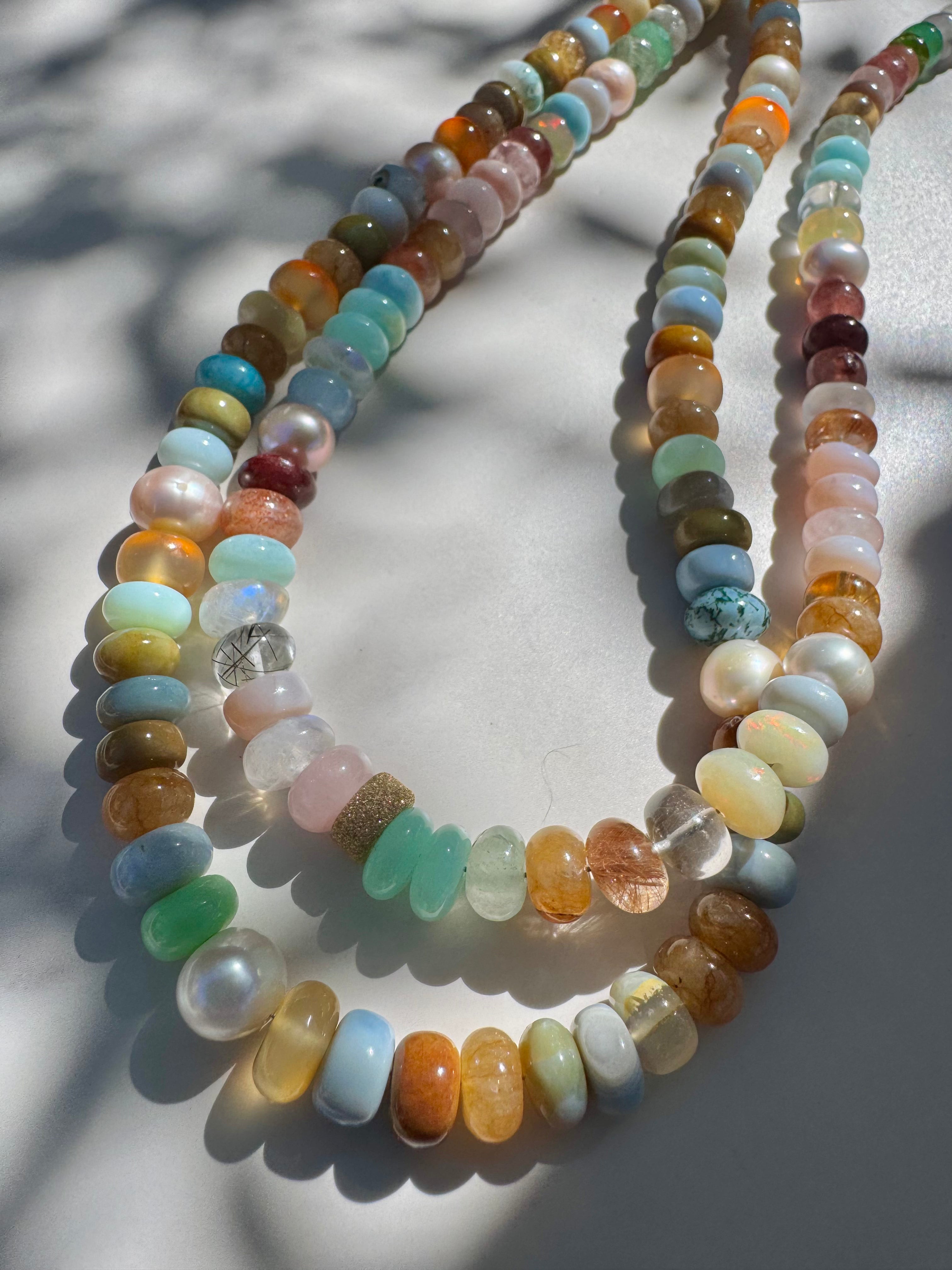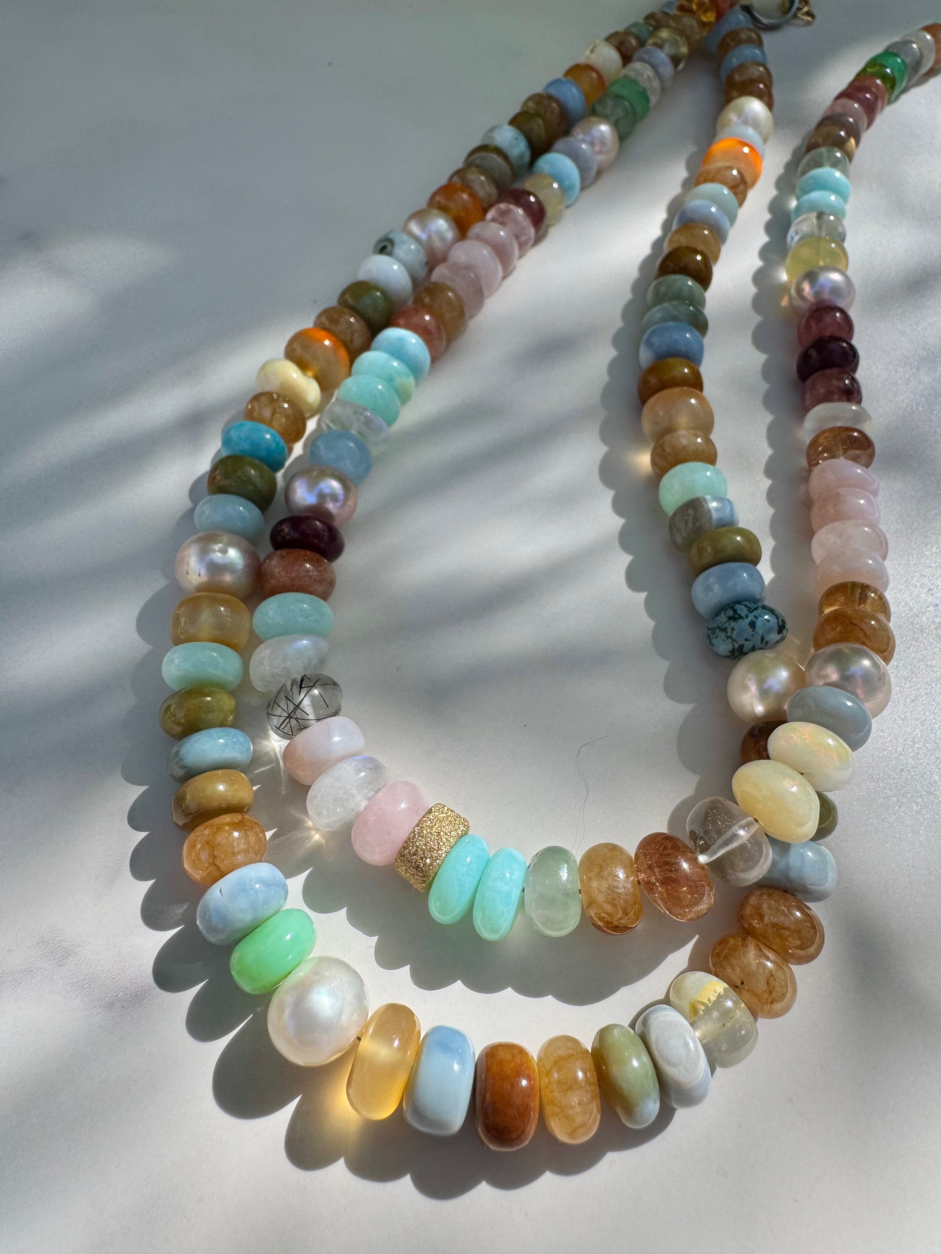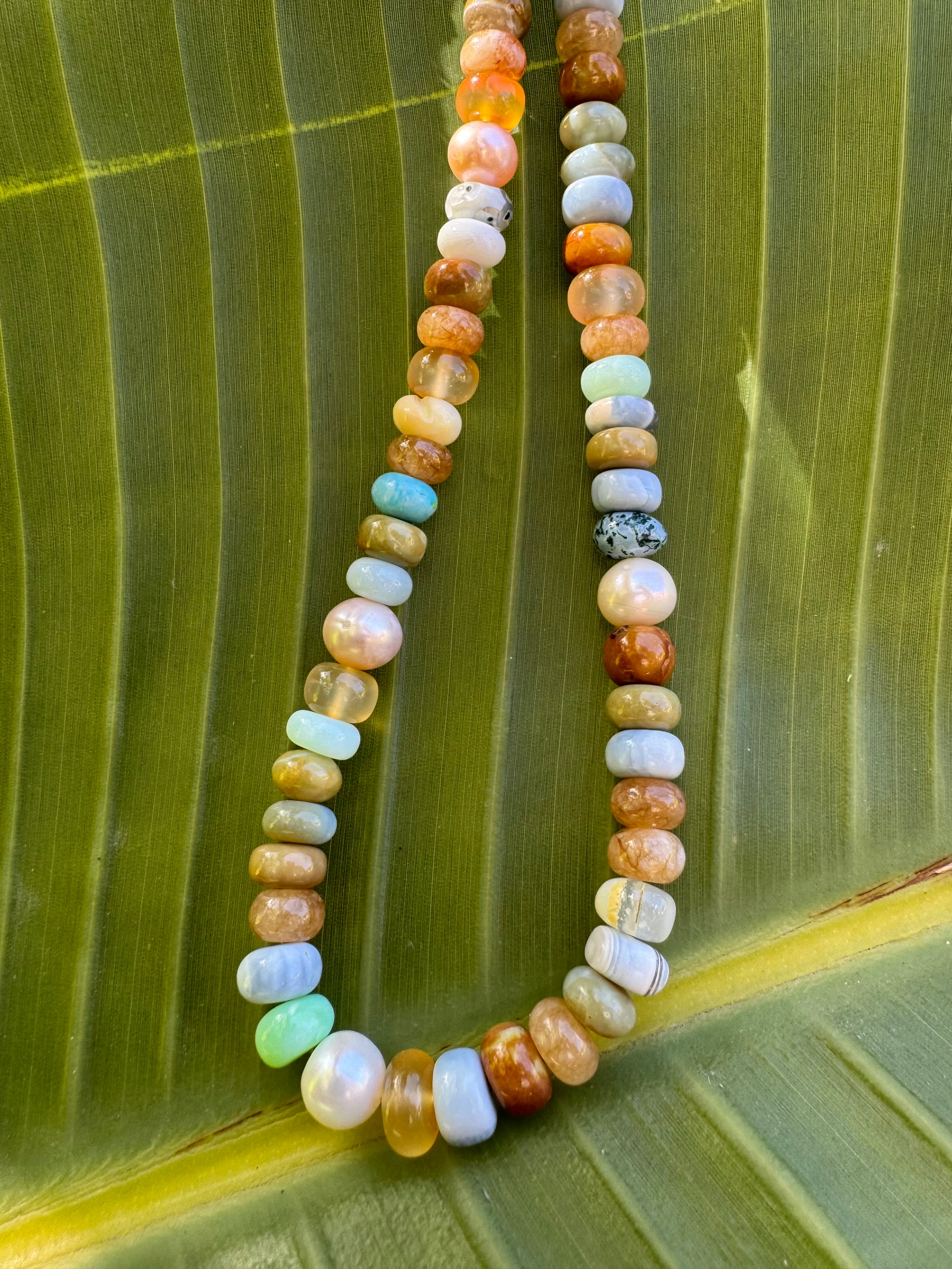 Amazing mixed gem candy necklace in most delicious hues! Gems include: Peruvian opals of many colors, jade, freshwater peals, agate, carnelian...All year long perfect neck staple and great for layering. Gold filled findings. Magnetic closure.