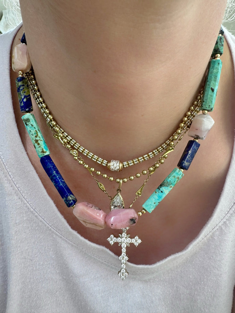 Cool multi gem bead necklace, consisting of Peruvian pink opal, African turquoise tube beads and lapis tube beads. So original and modern take on beaded necklace. Beautiful color combo too! Gold filled findings and accents.