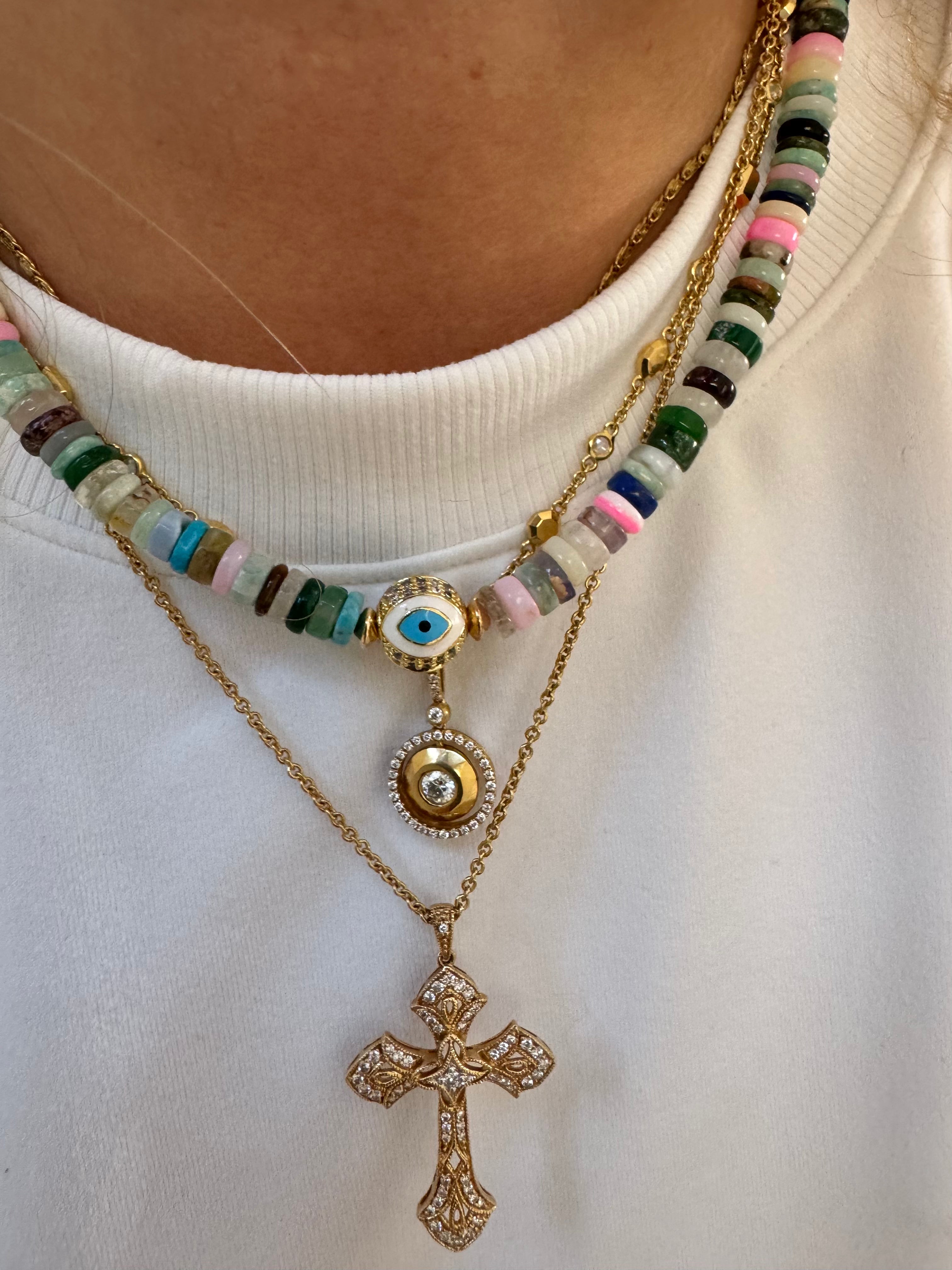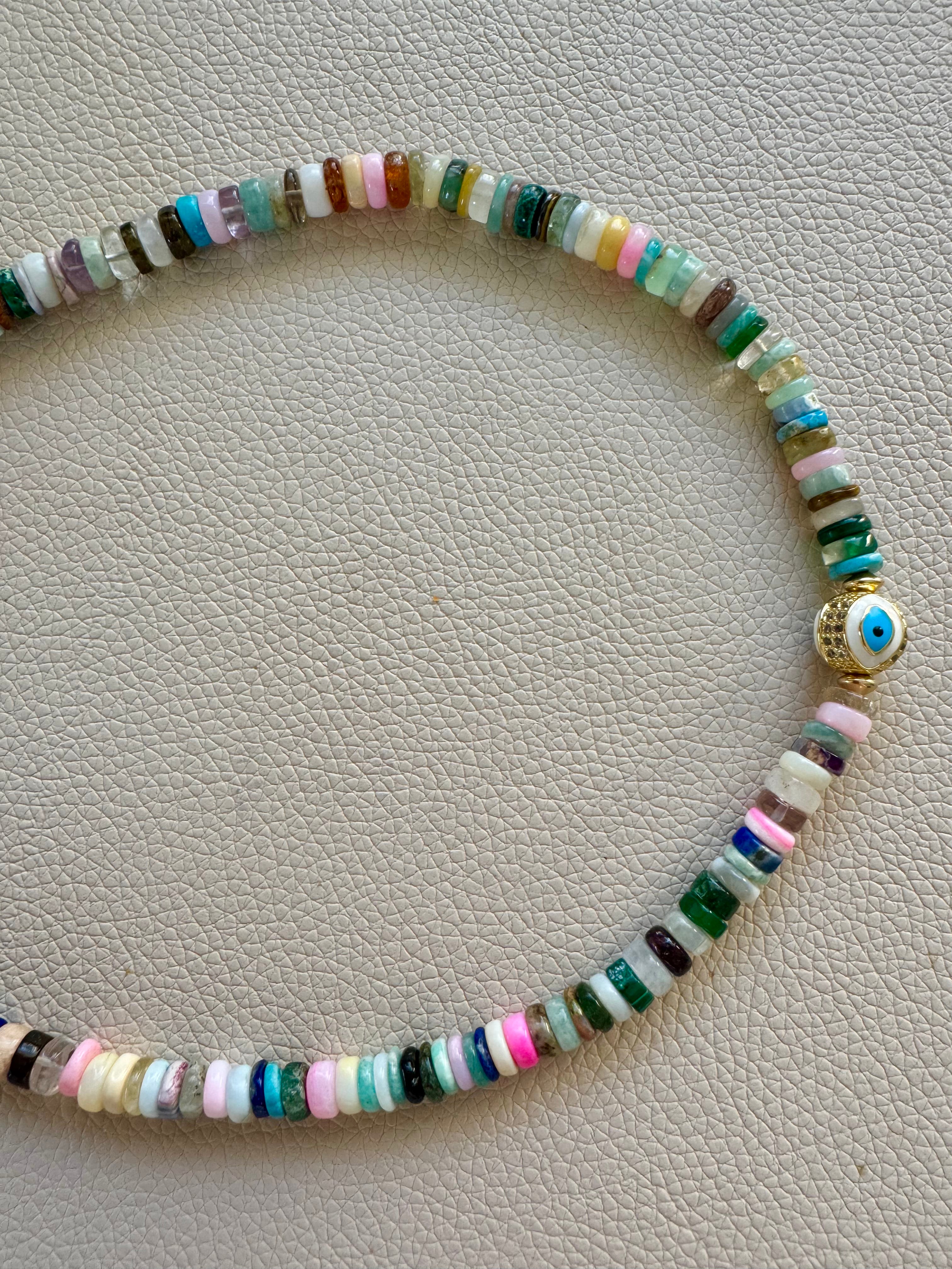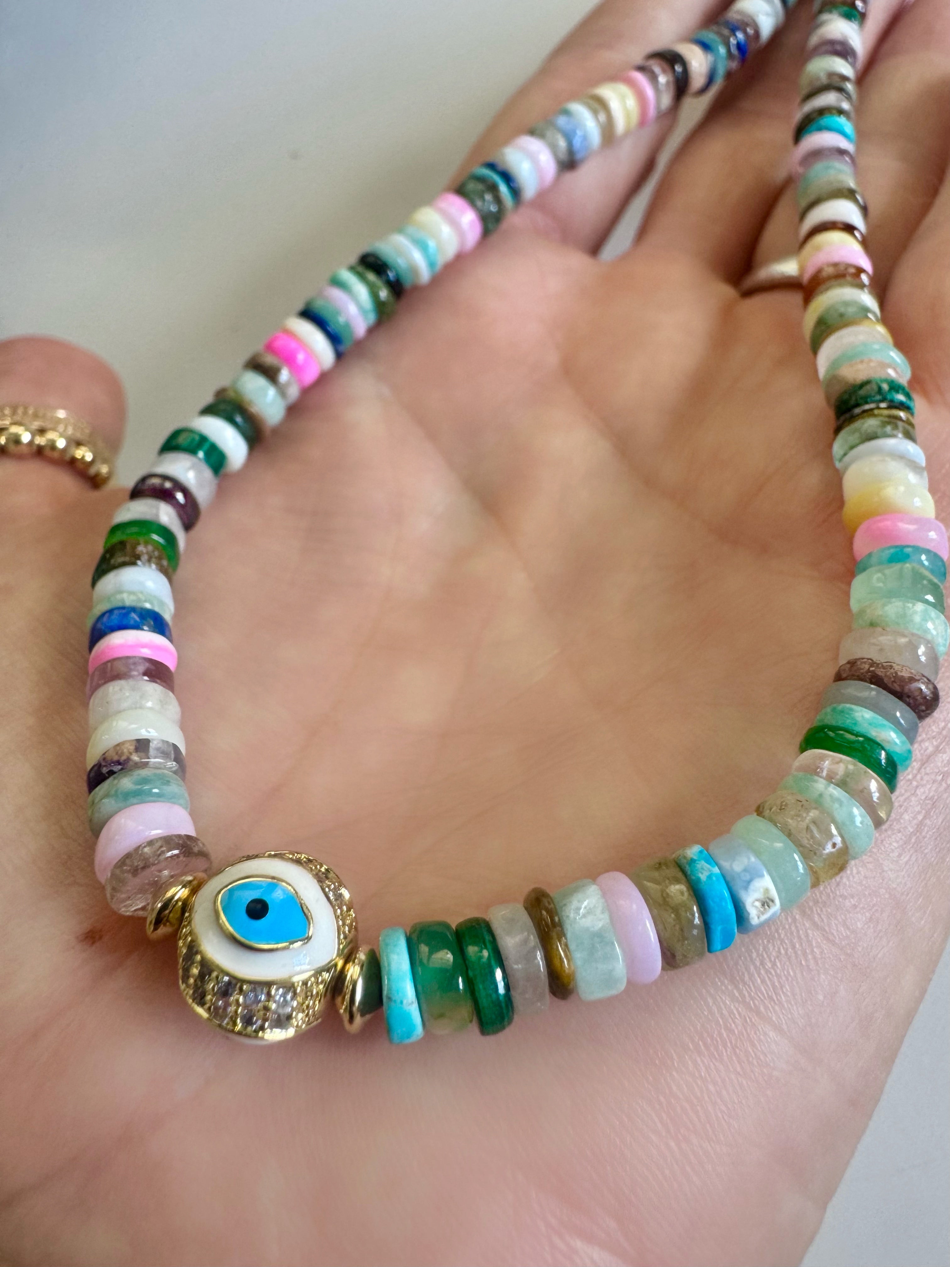 Fun Italian gold filled evil eye bead multigem necklace.  Gems are: tiger eye, opal, quartz, turquoise, amethyst, fluorite, citrine, amazonite, lapis and others...Evil eye are Italian made enamel/CZs and gold filled material.  Gold filled findings.