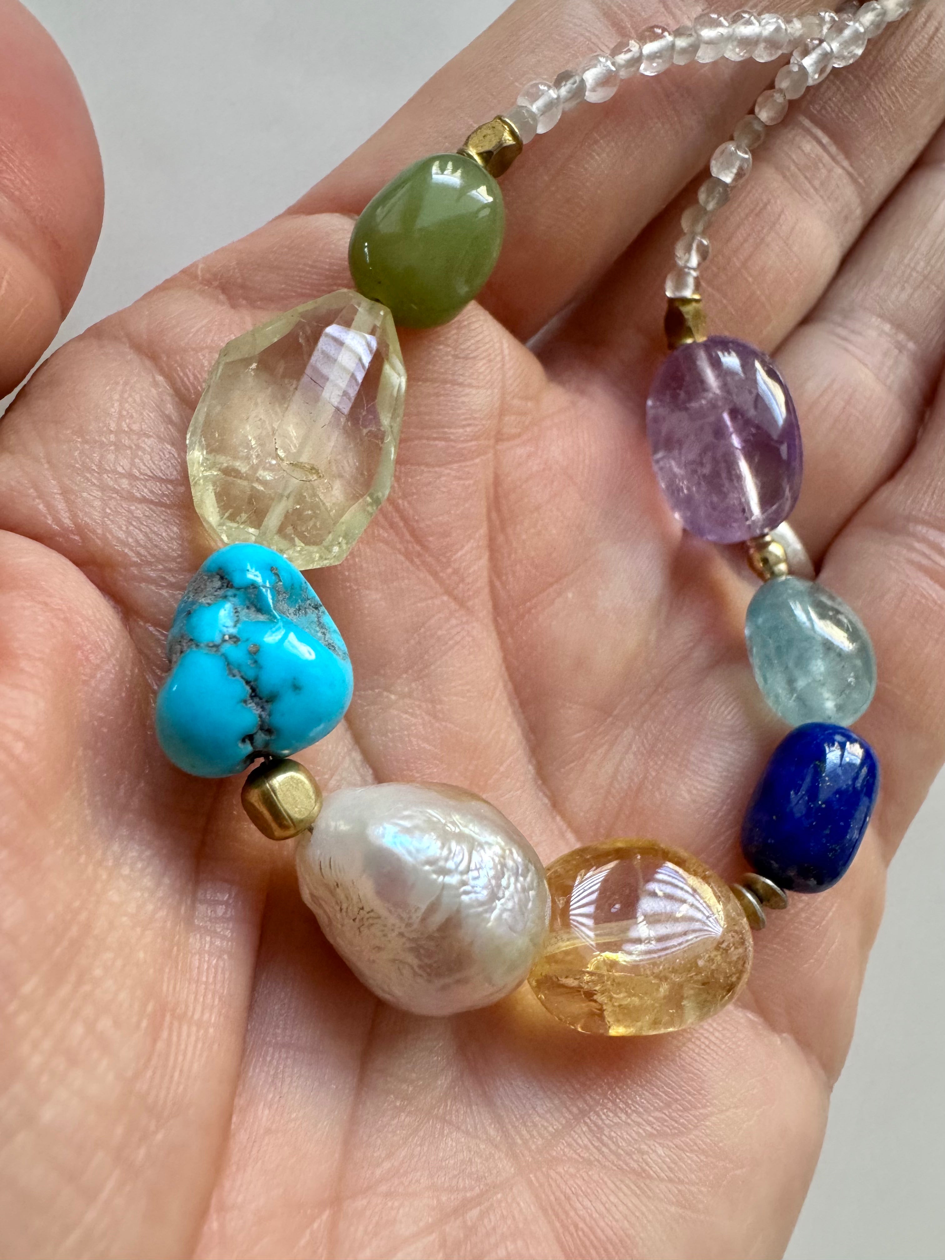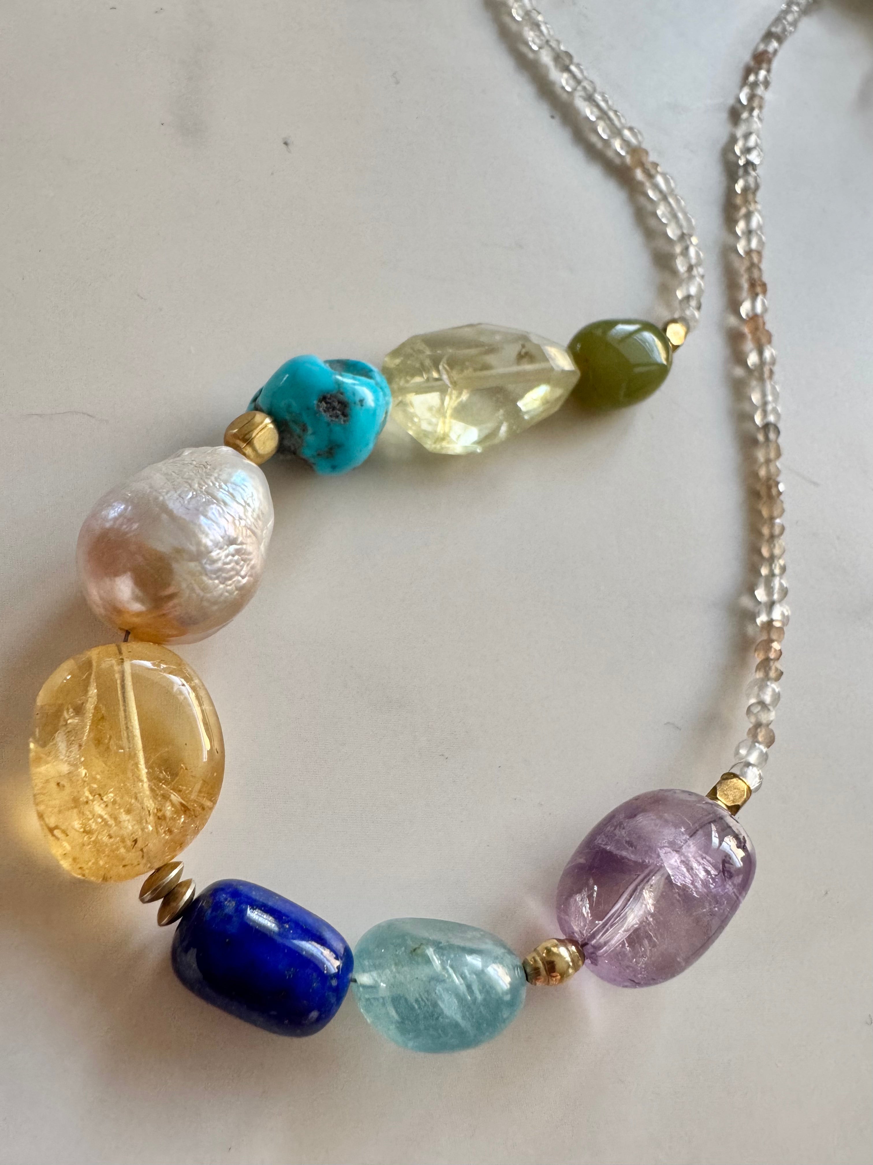 Gem sample bead necklace consisting of freshwater Edison pearl, tumbled citrine, tube lapis lazuli, tumbled amethyst, kyanite, AZ turquoise and quartz. Such unique and bold! Smaller beads are micro faceted peach moonstone. Vermeil accent and gold filled findings.