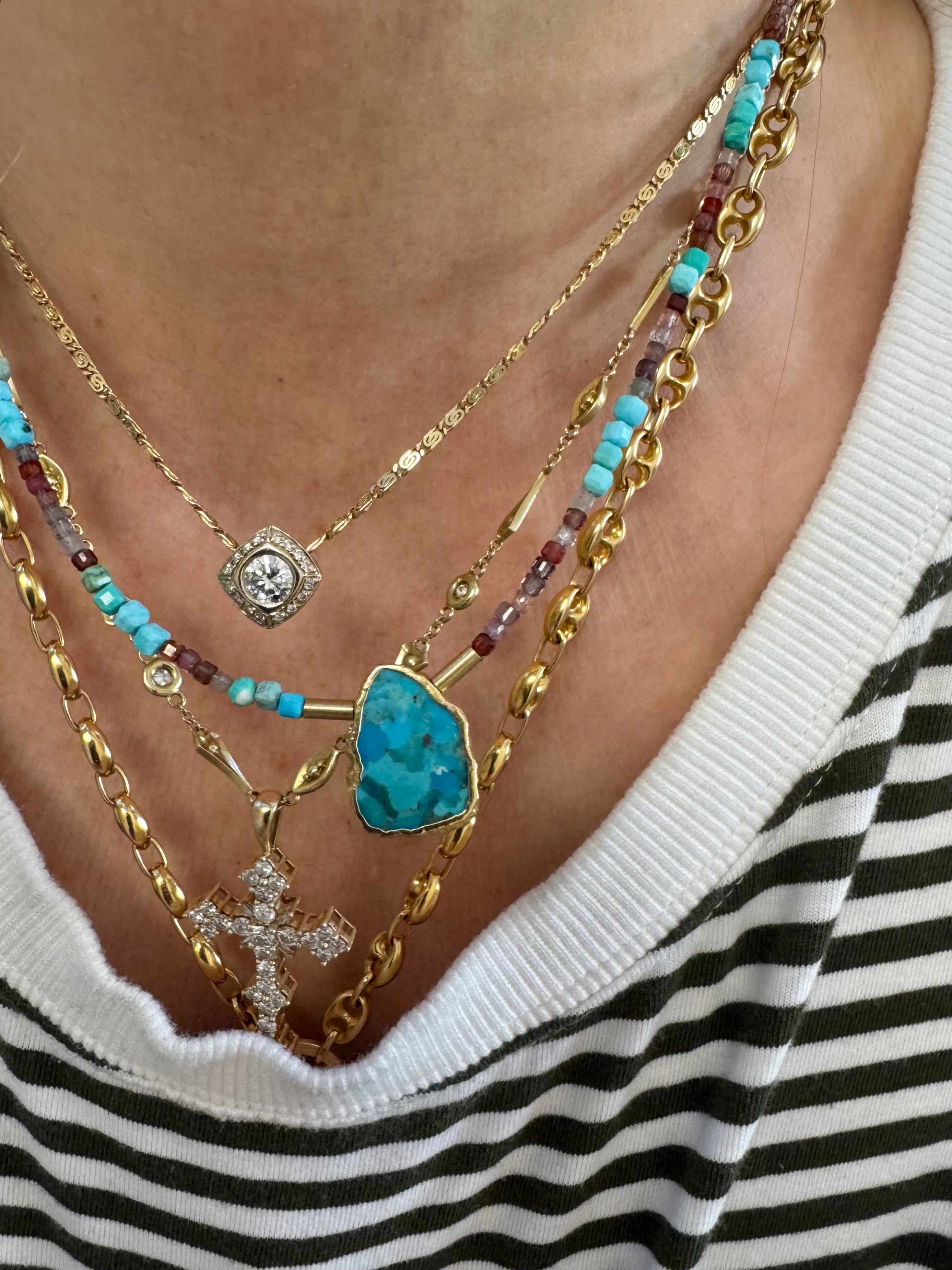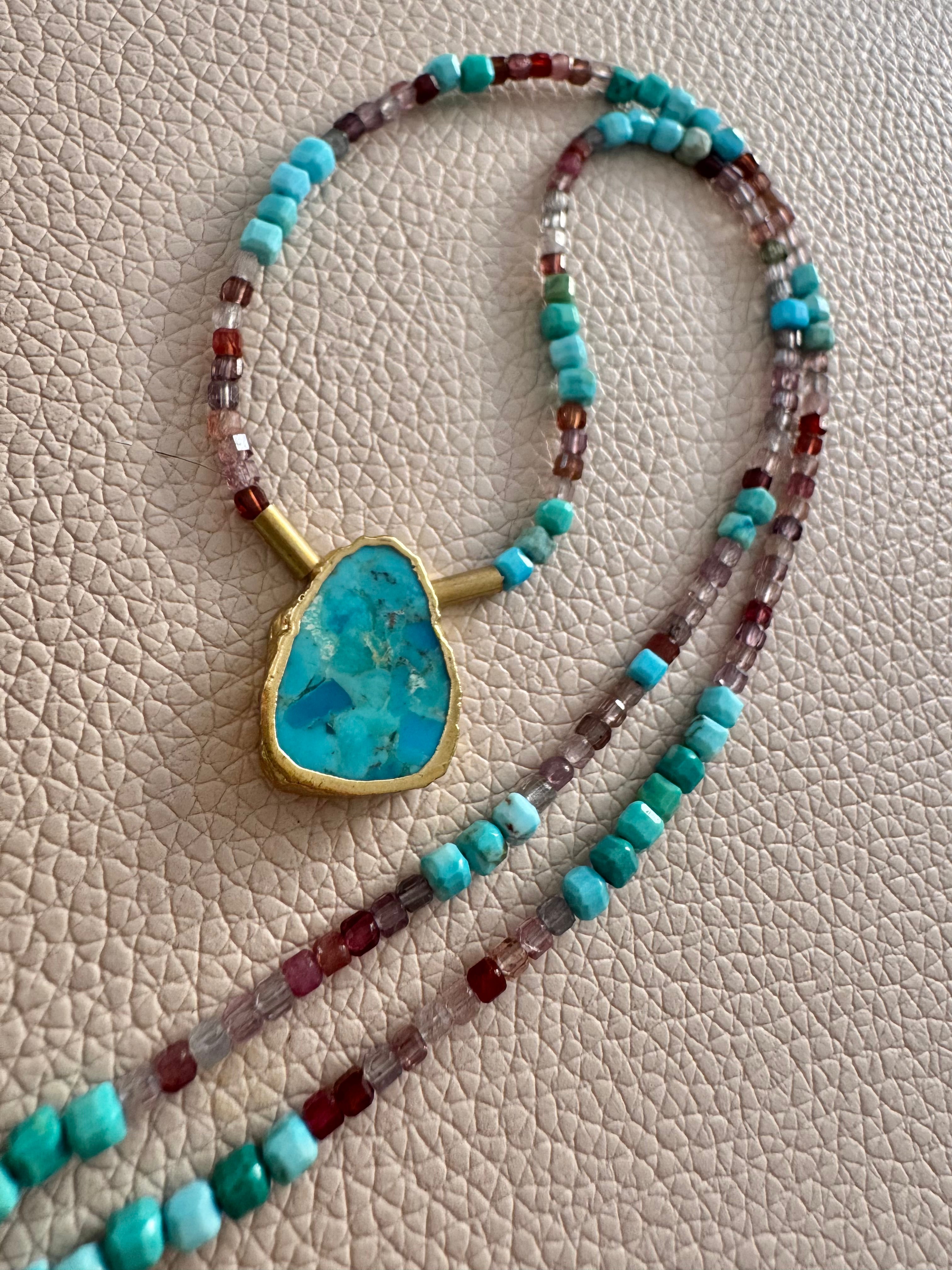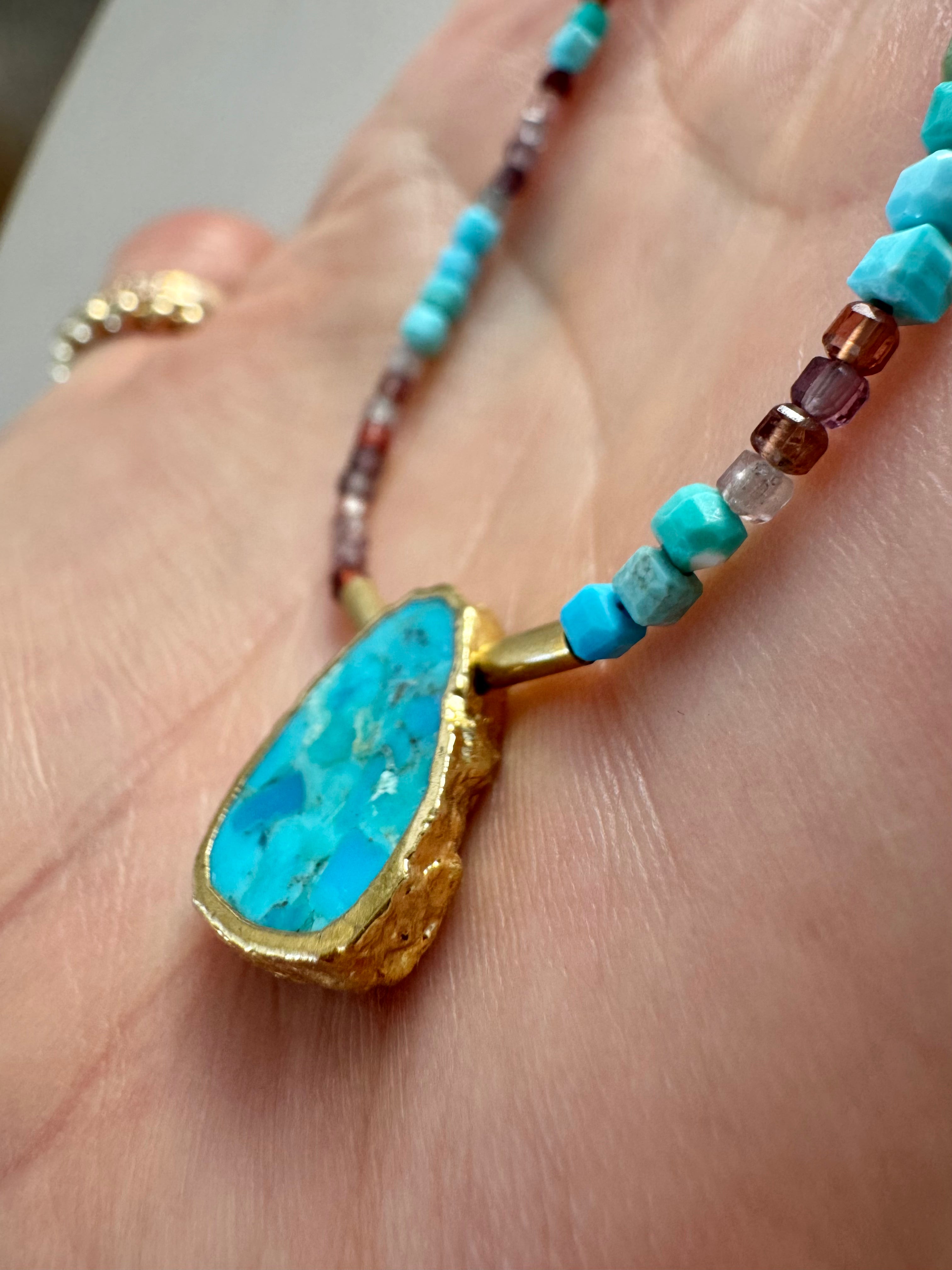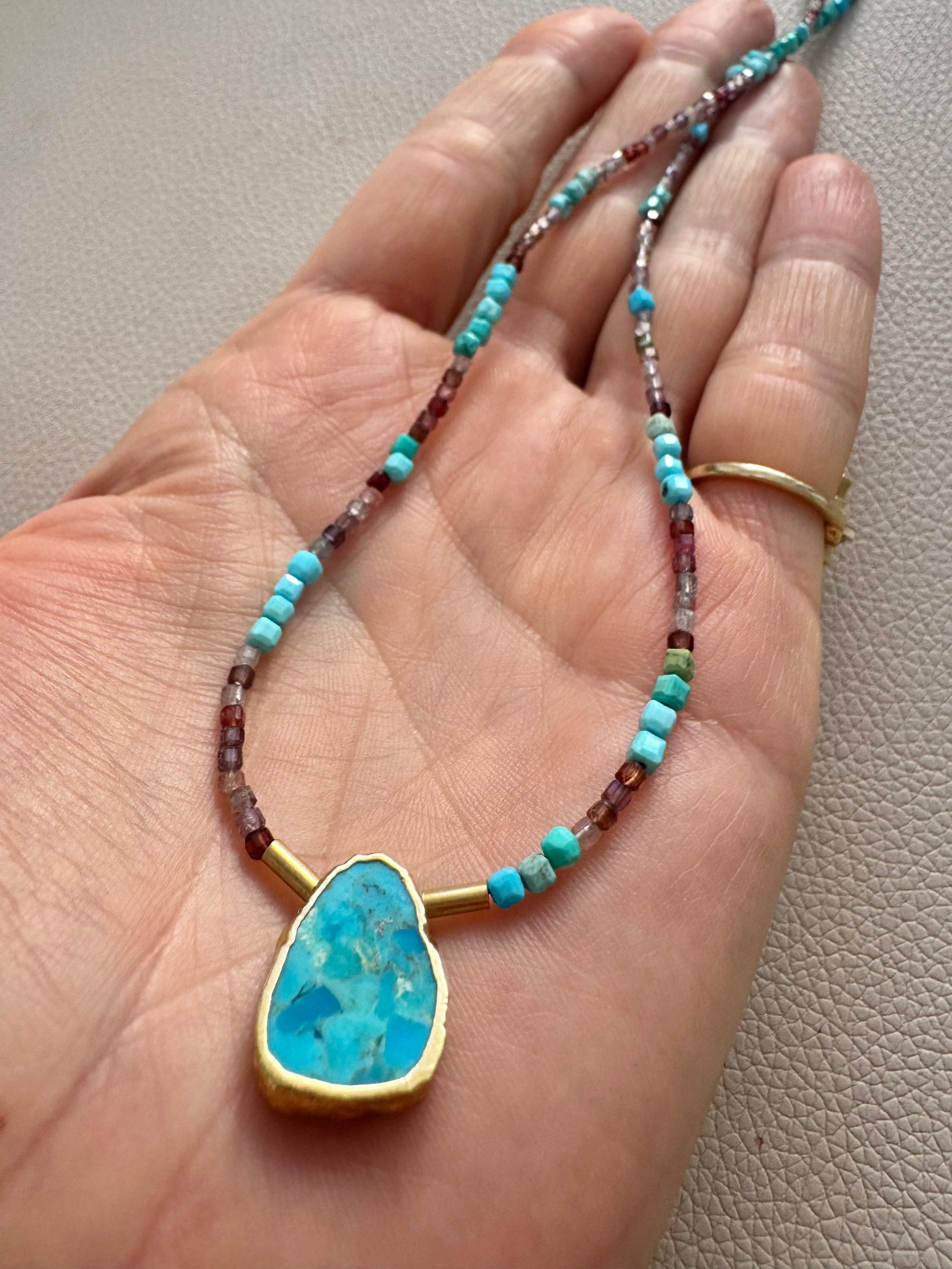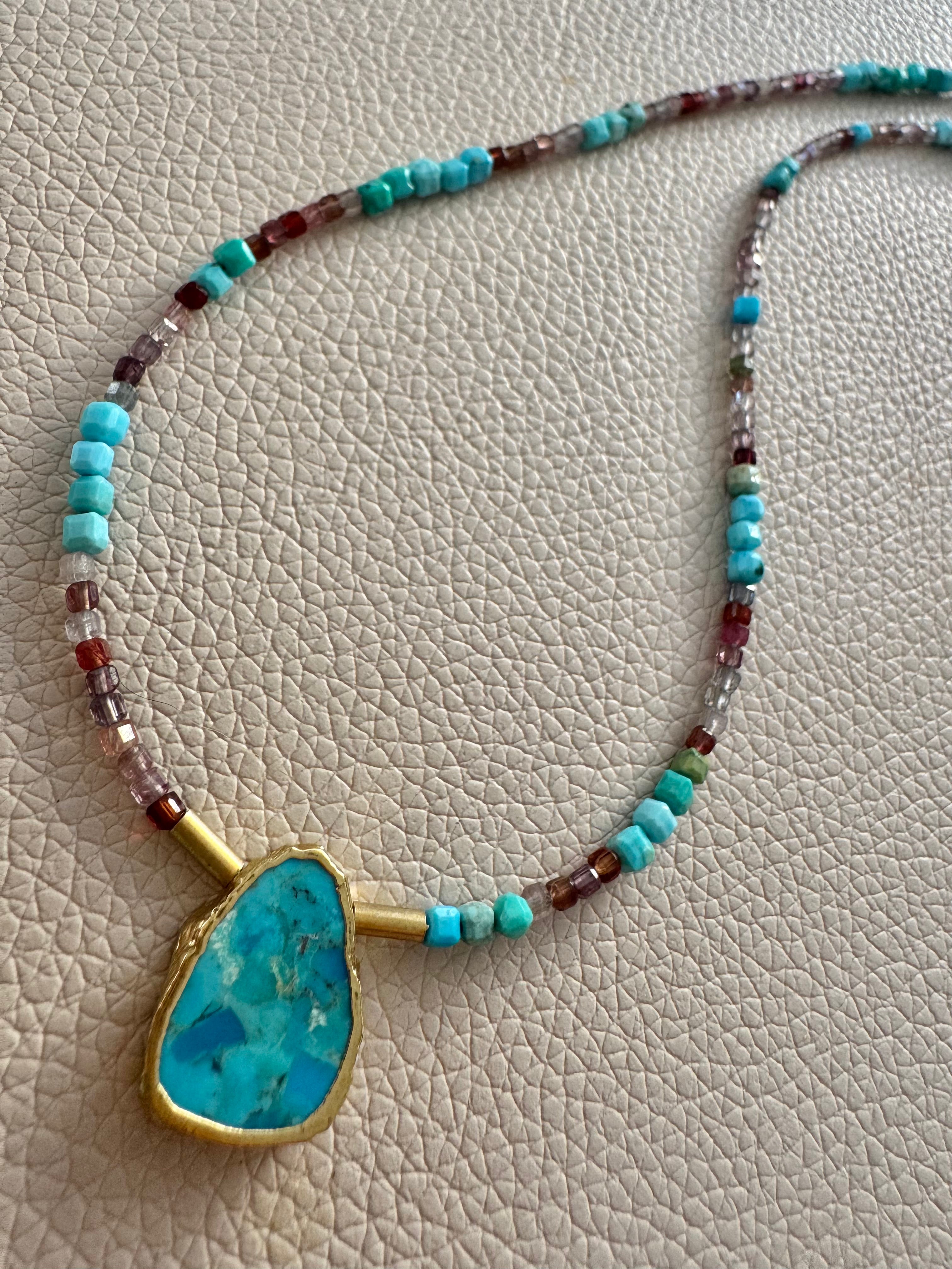 Striking AZ turquoise bead necklace with micro faceted spinel and AZ turquoise slice. Just wow! Perfect layering necklace for summer or all year long. Highest quality gems. Gold filled findings.