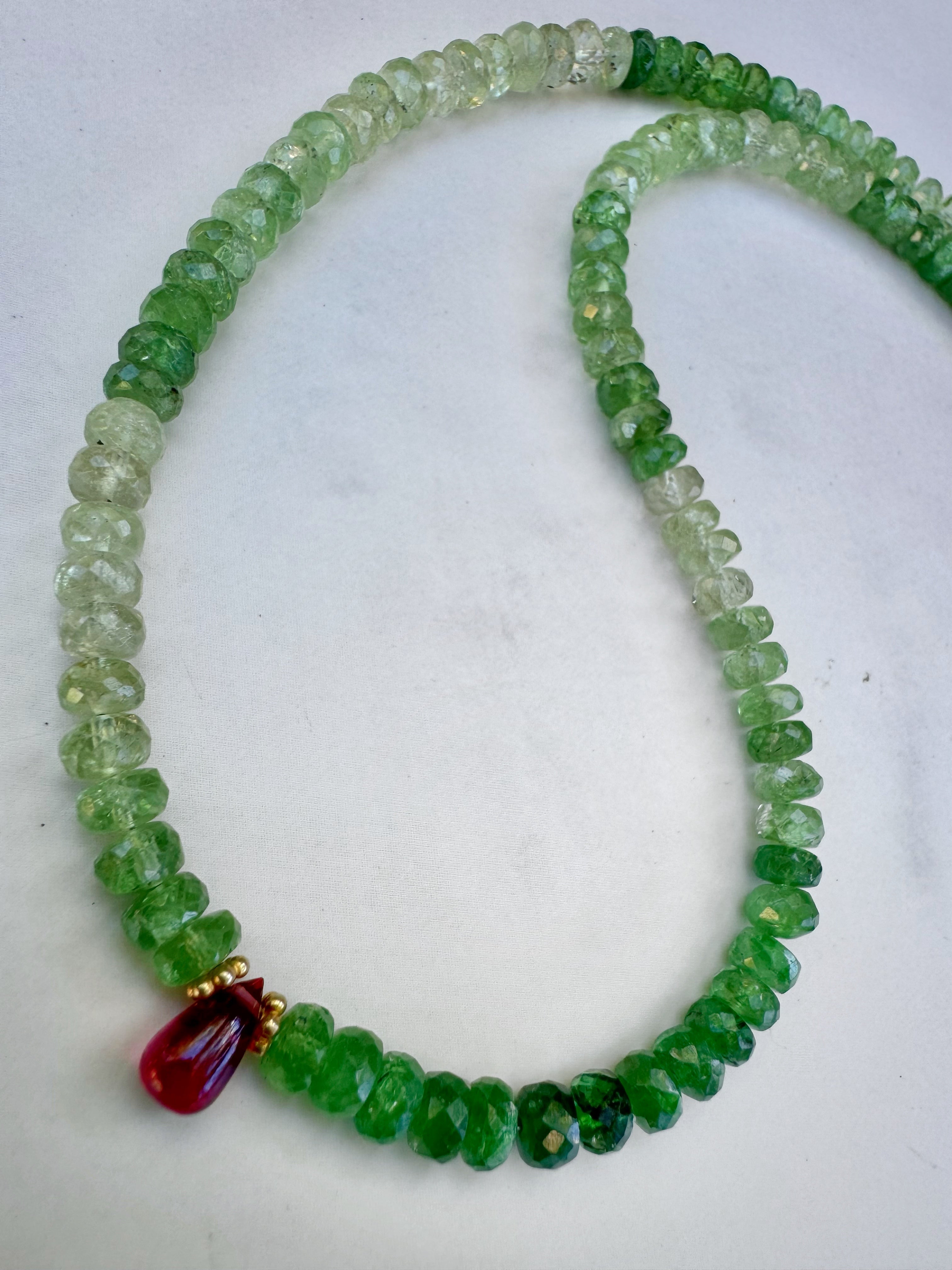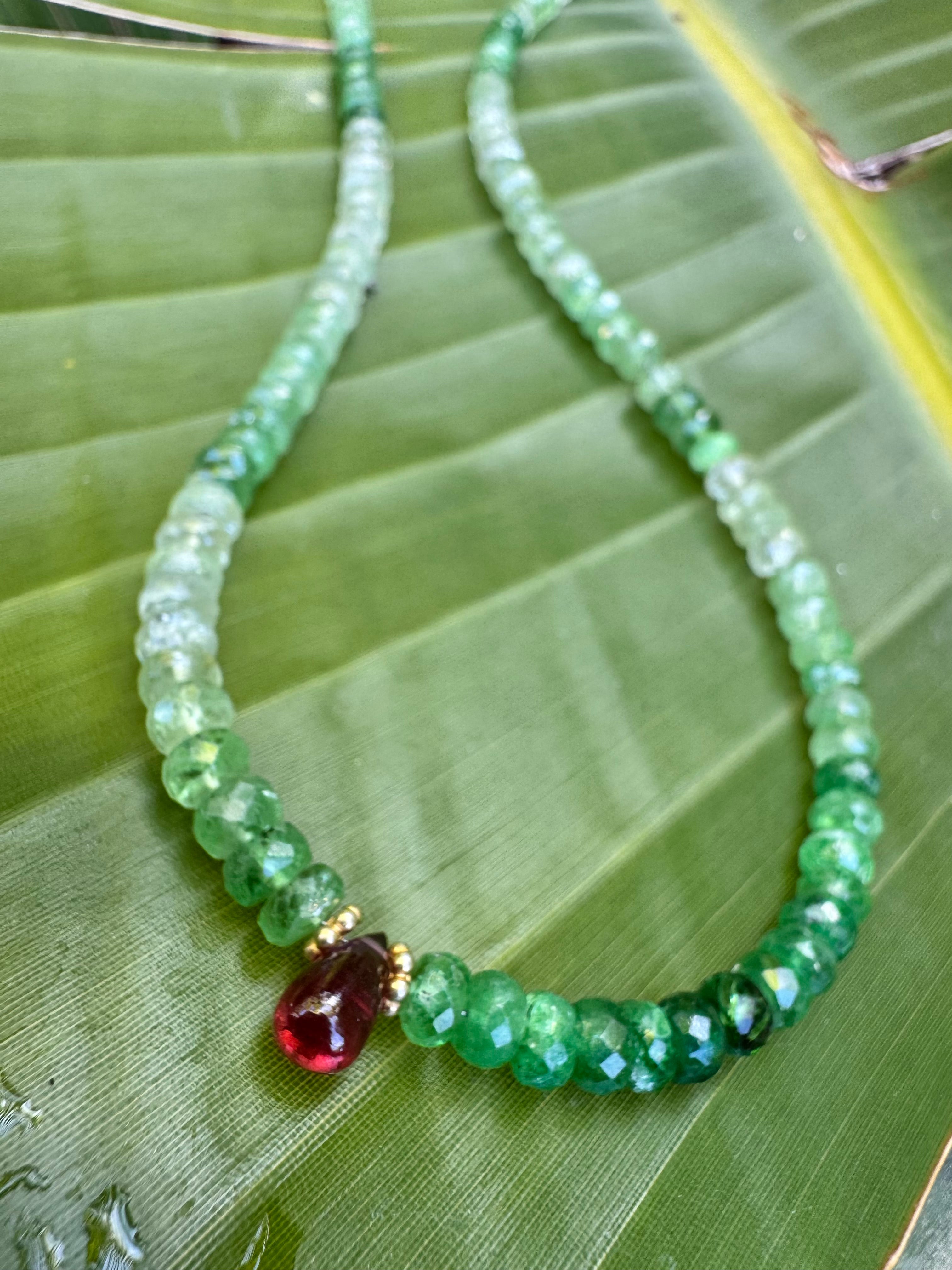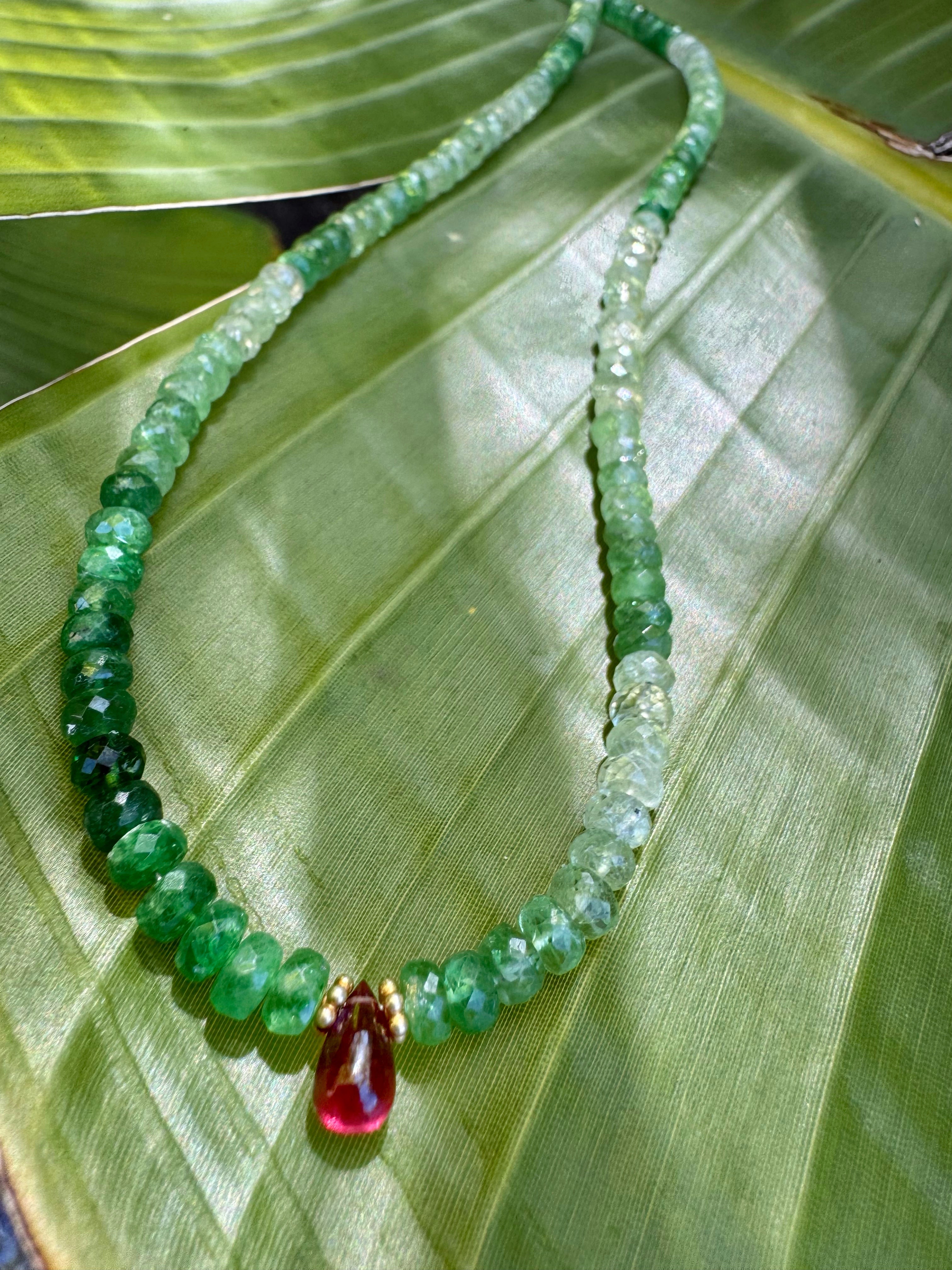Stunning AAA shaded tsavorite bead necklace with rhodolite garnet drop