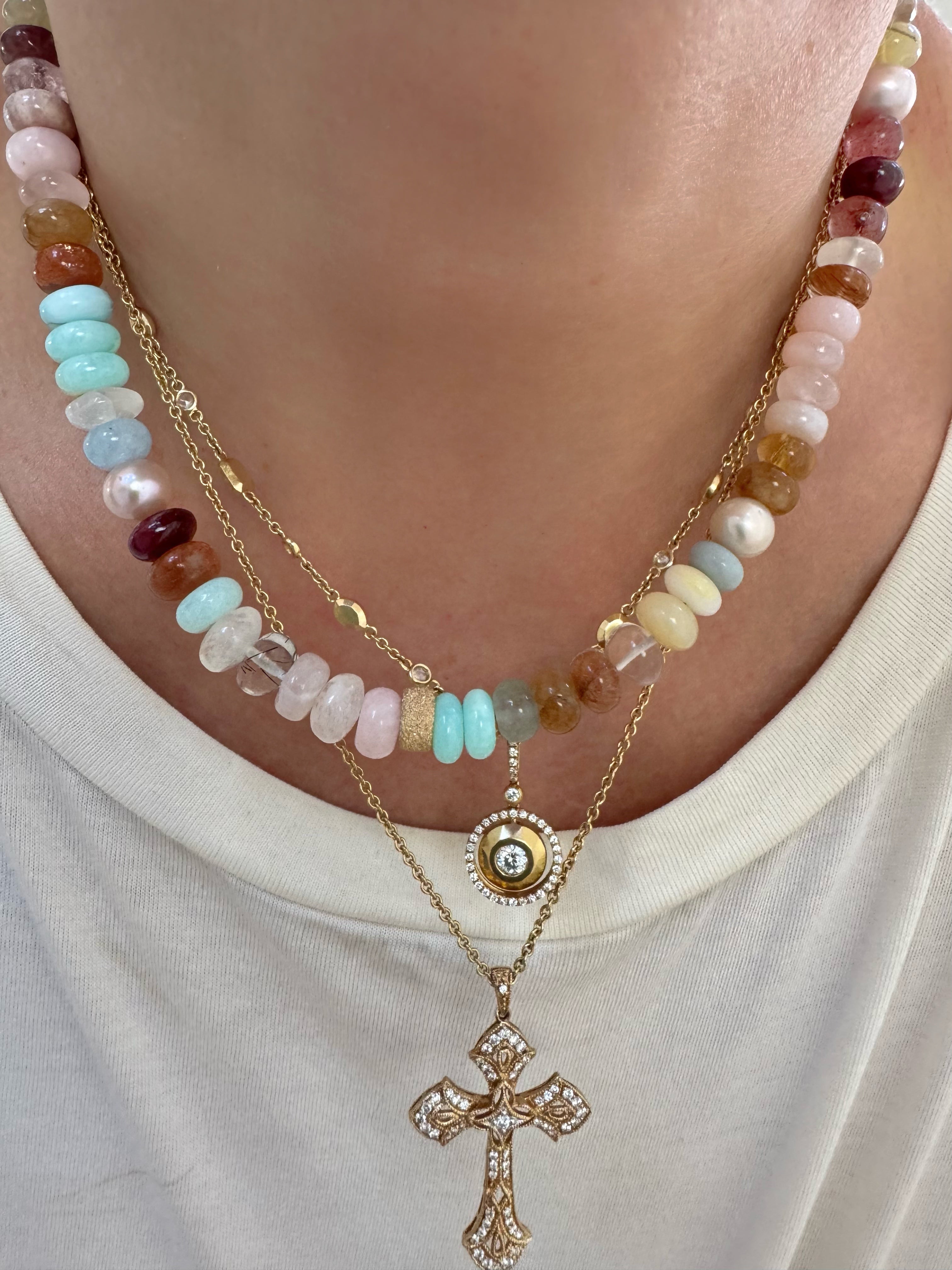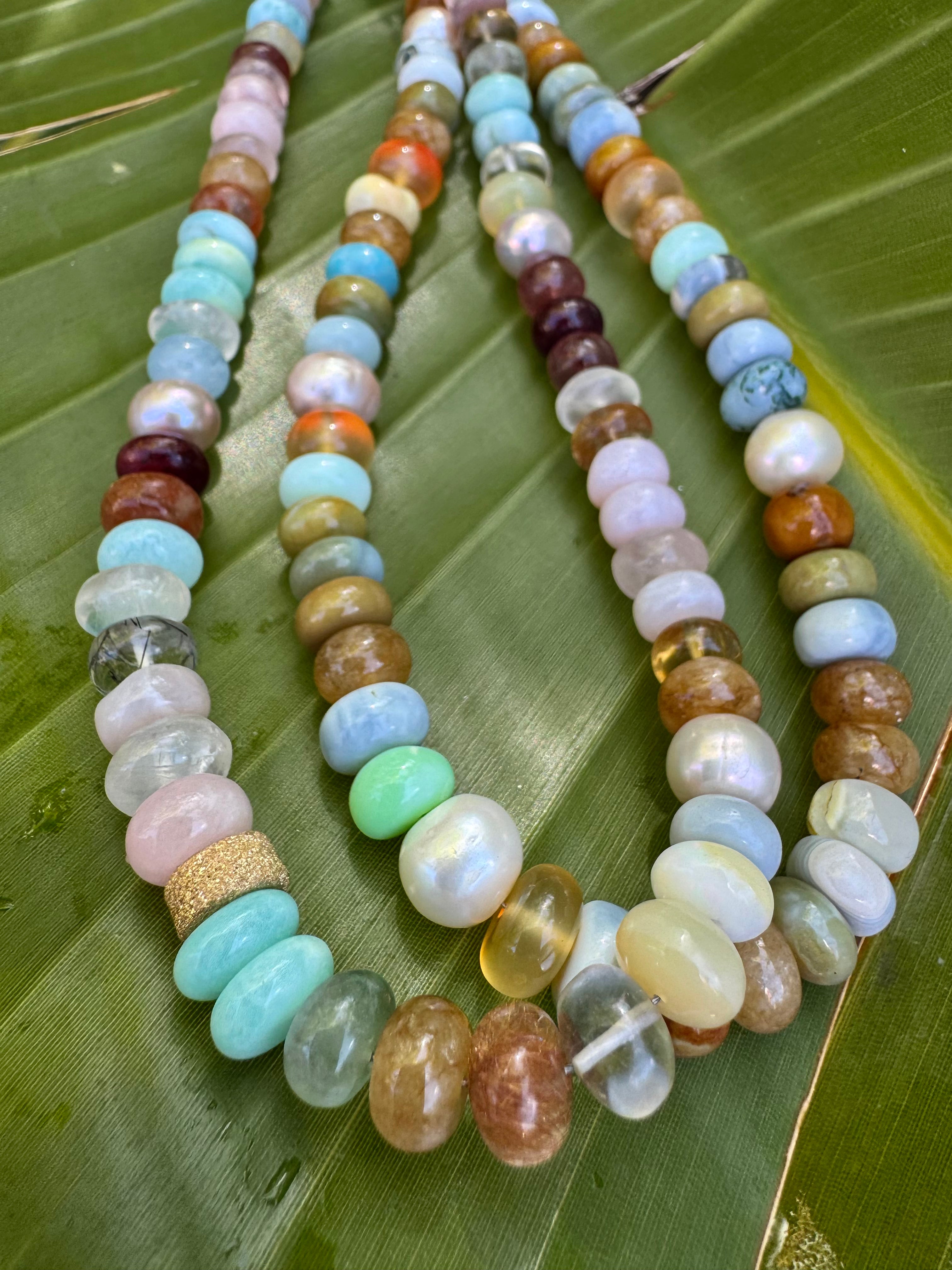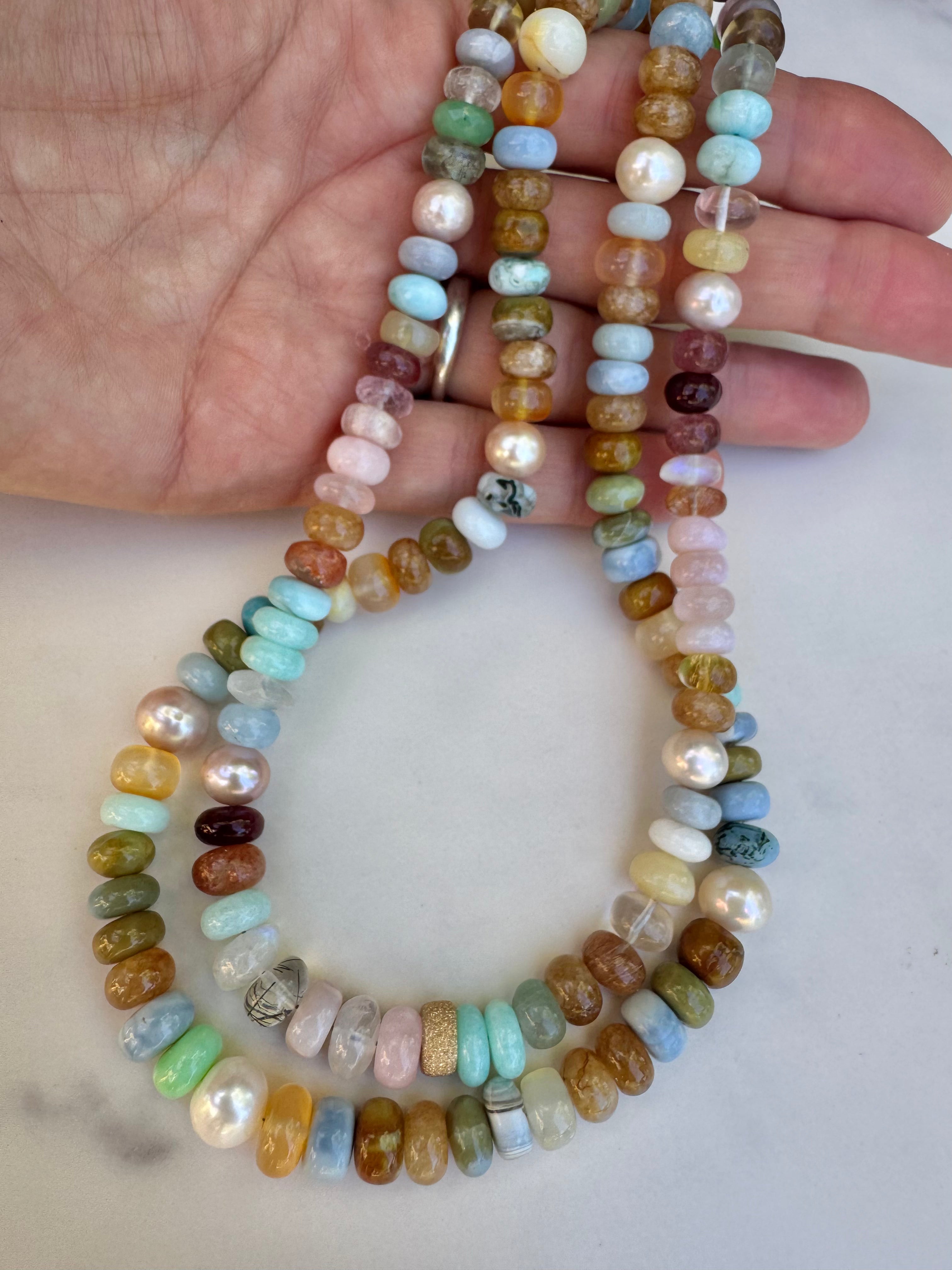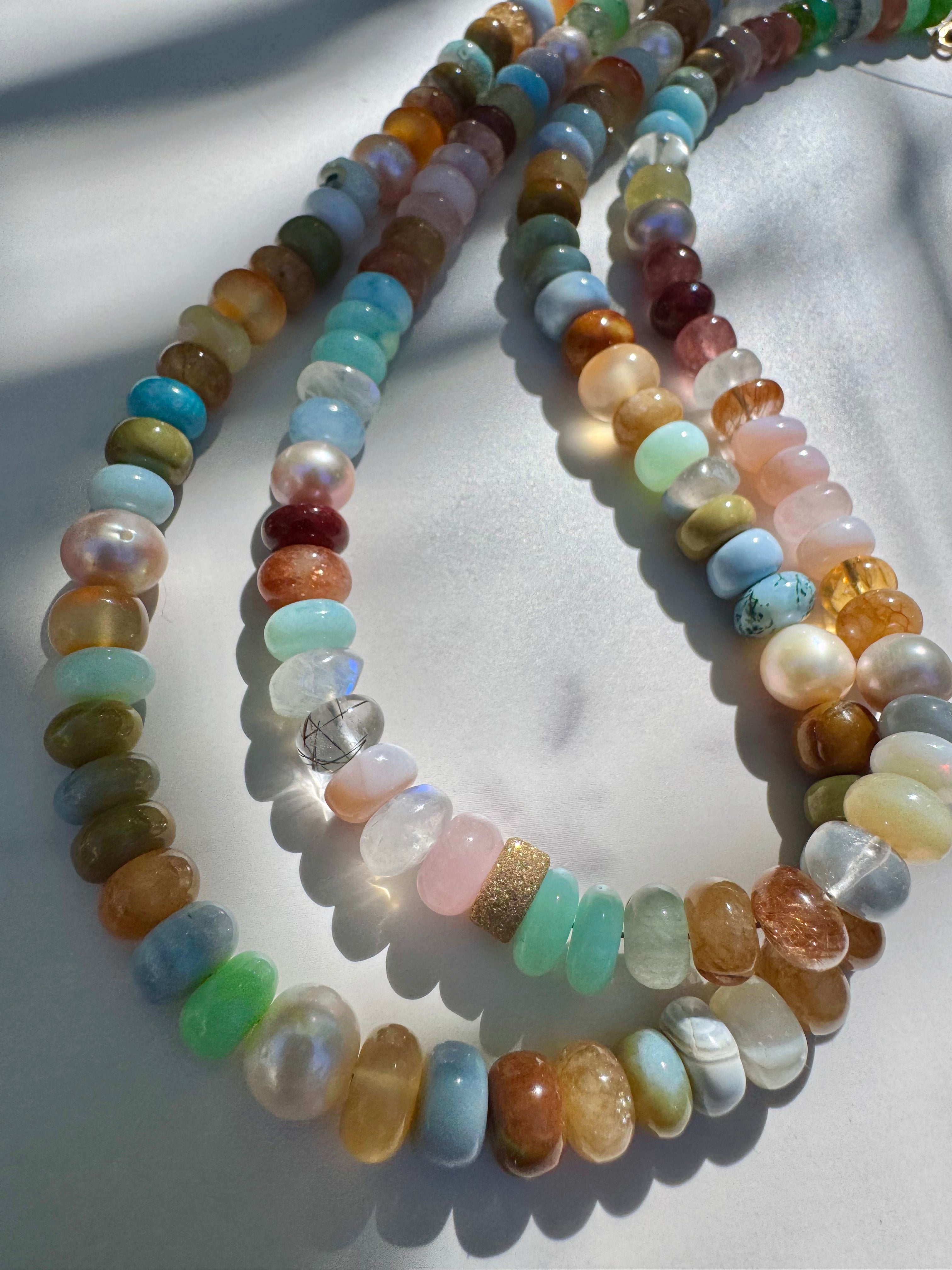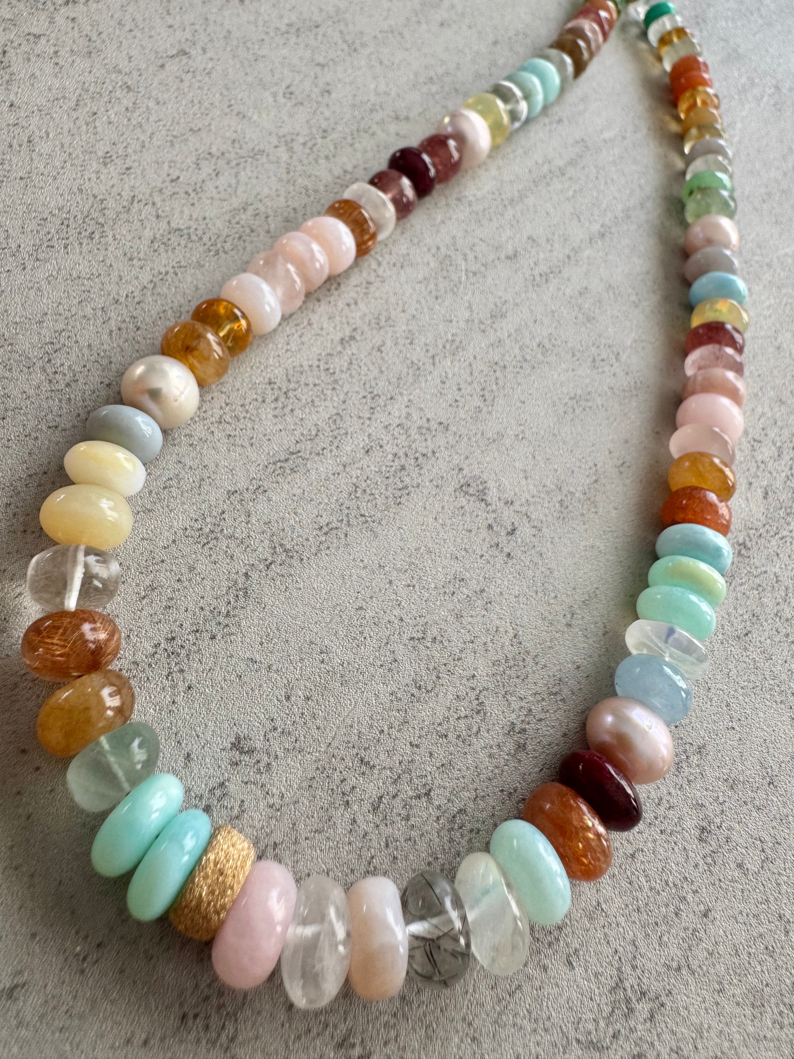 Stunning mixed gems candy necklace with vermeil star dust accent bead. The hues of this necklace is out of this world gorgeous from pastels to earthy tones. Top quality gems are: jade, Peruvian opal, freshwater pearls, strawberry quartz, larimar, prehnite, chrysoprase, agate, clear quartz, rutilated quartz, and more! Just a happy strand to elevate your well being and well feeling! Gold filled findings.
