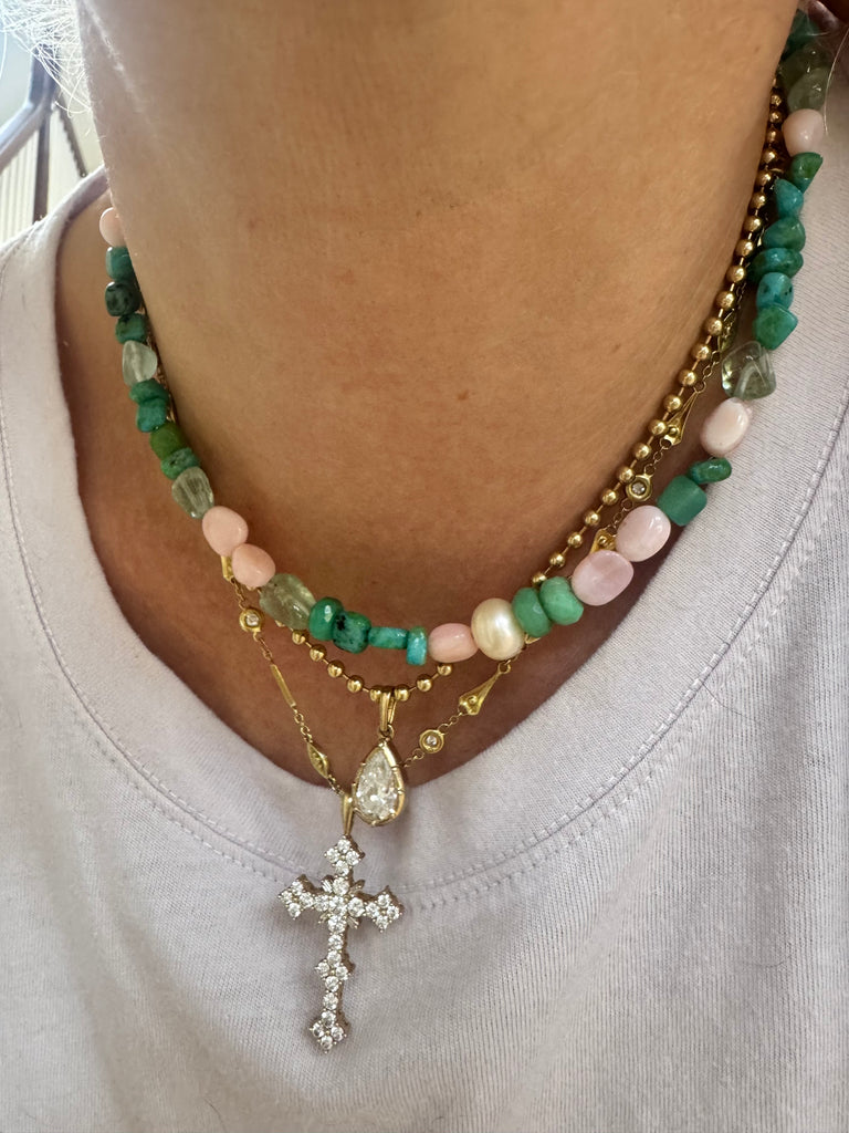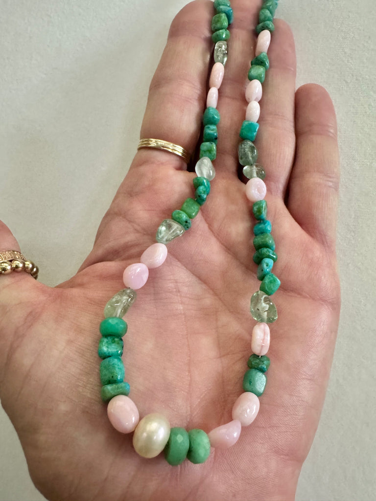 Sweet multi gem bead necklace.  Gems are: turquoise nuggets, Peruvian pink opal, chrysoprase, freshwater pearls and fluorite nuggets.  Fun and colorful, great for layering.  Gold filled findings.