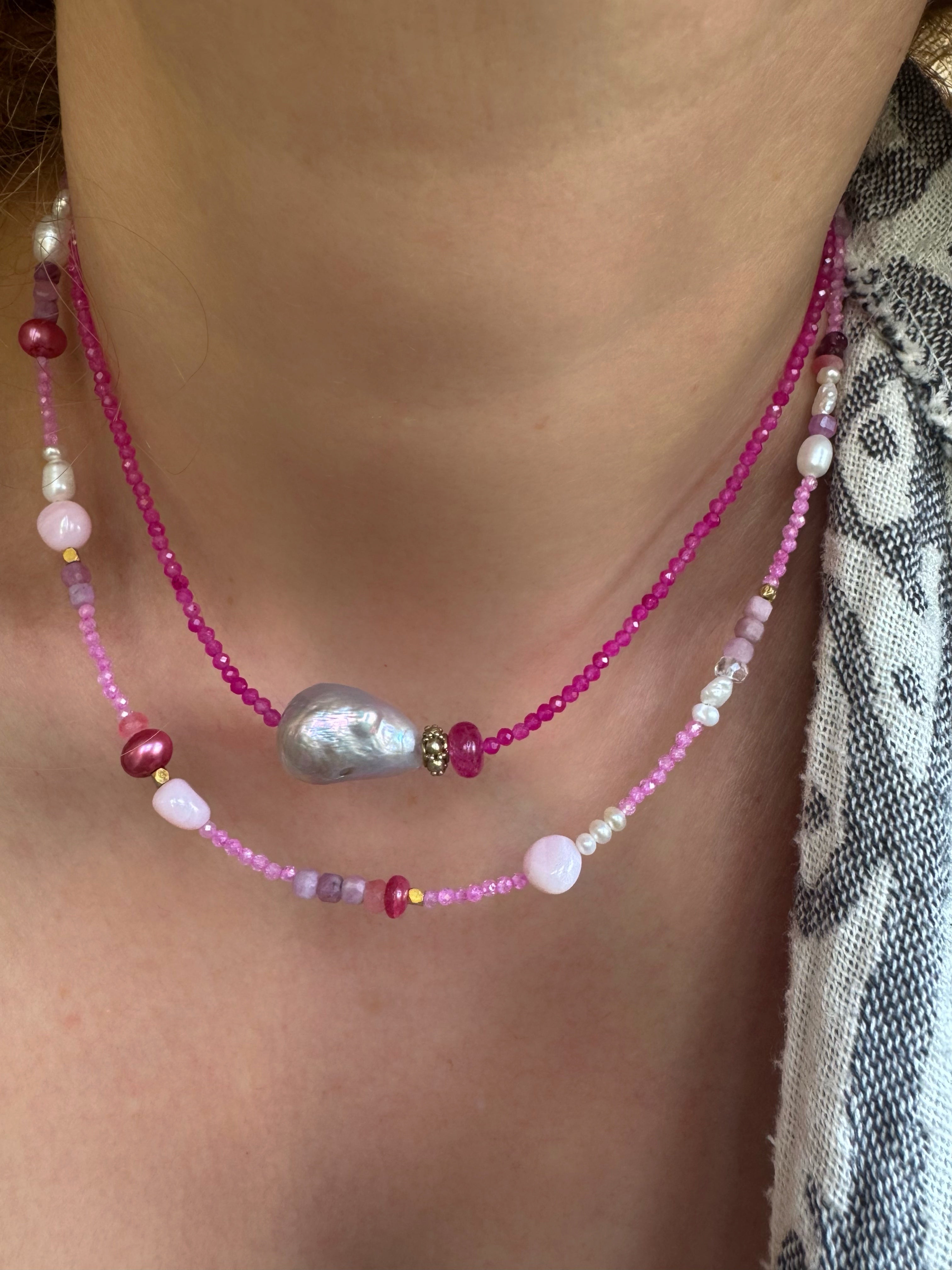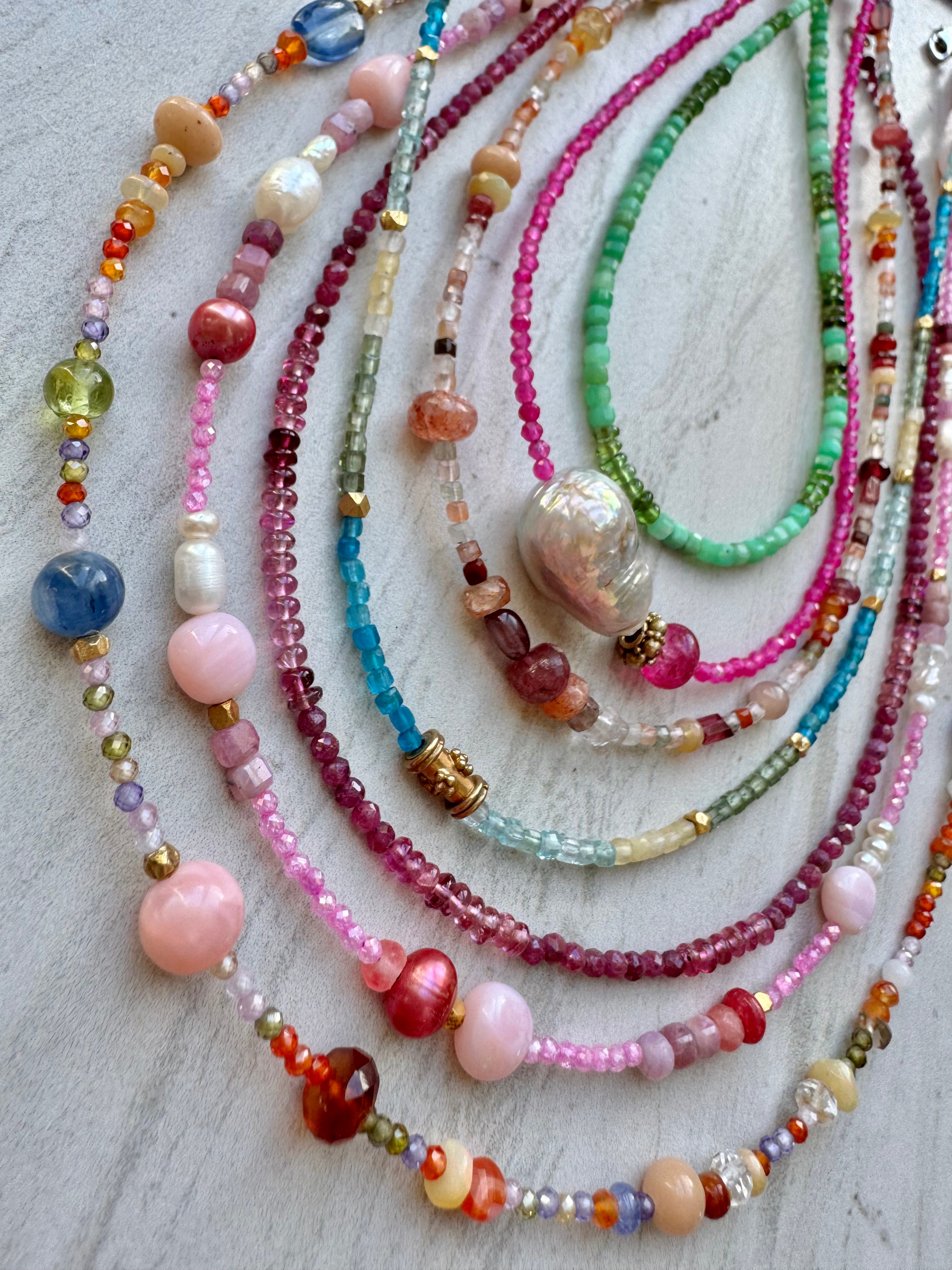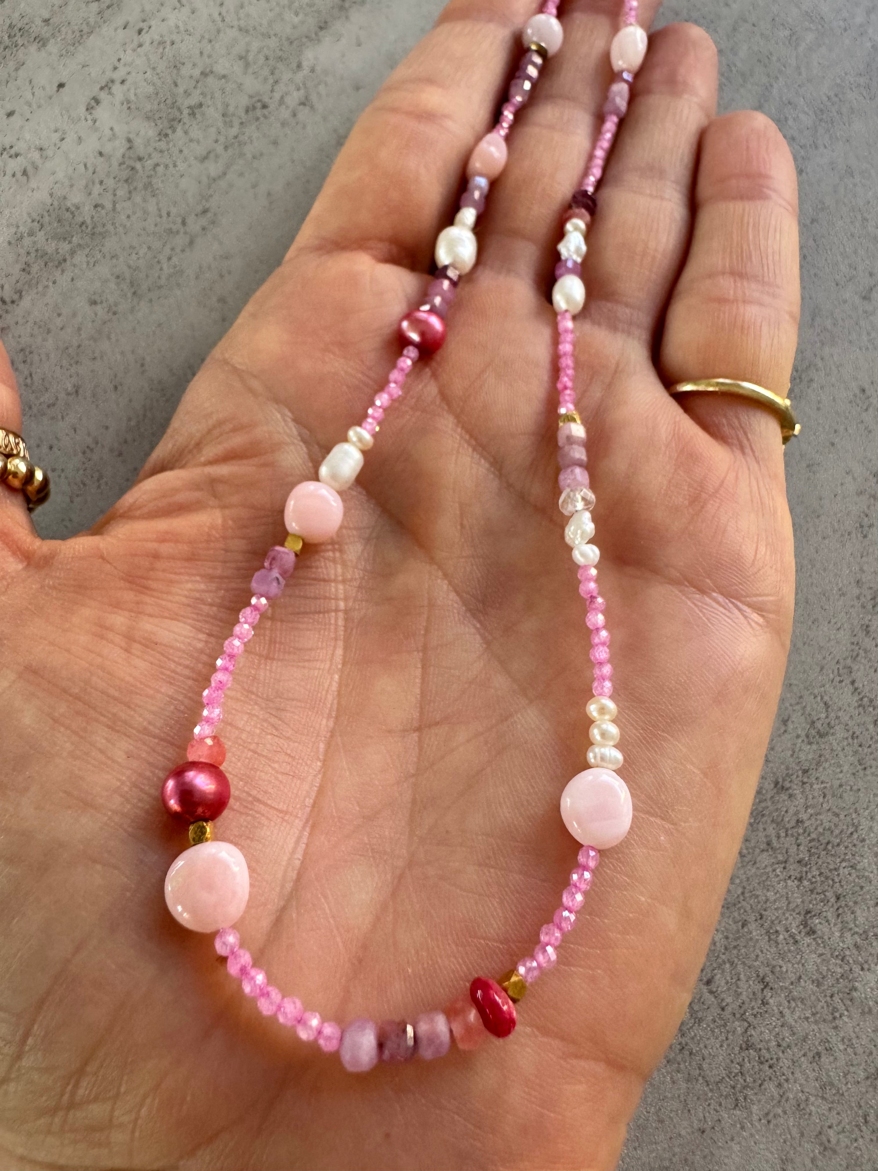 Sweet multi gem bead necklace with freshwater pearls and Peruvian pink opals. Micro beads are CZs rest go gems are pink rubies, pearls and vermeil accent beads. Great layering necklace! Gold filled findings.