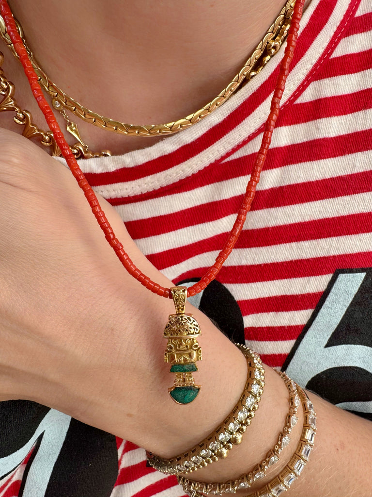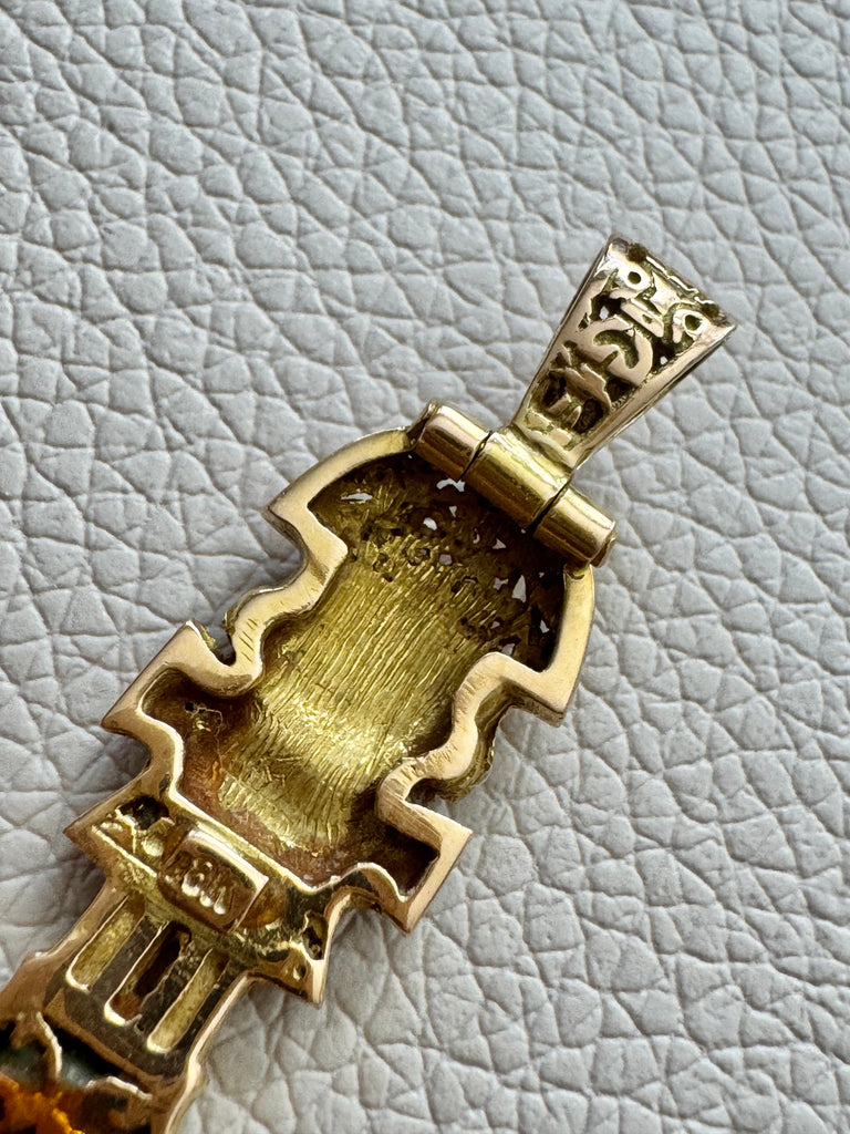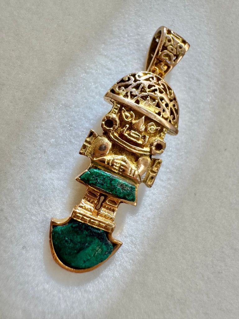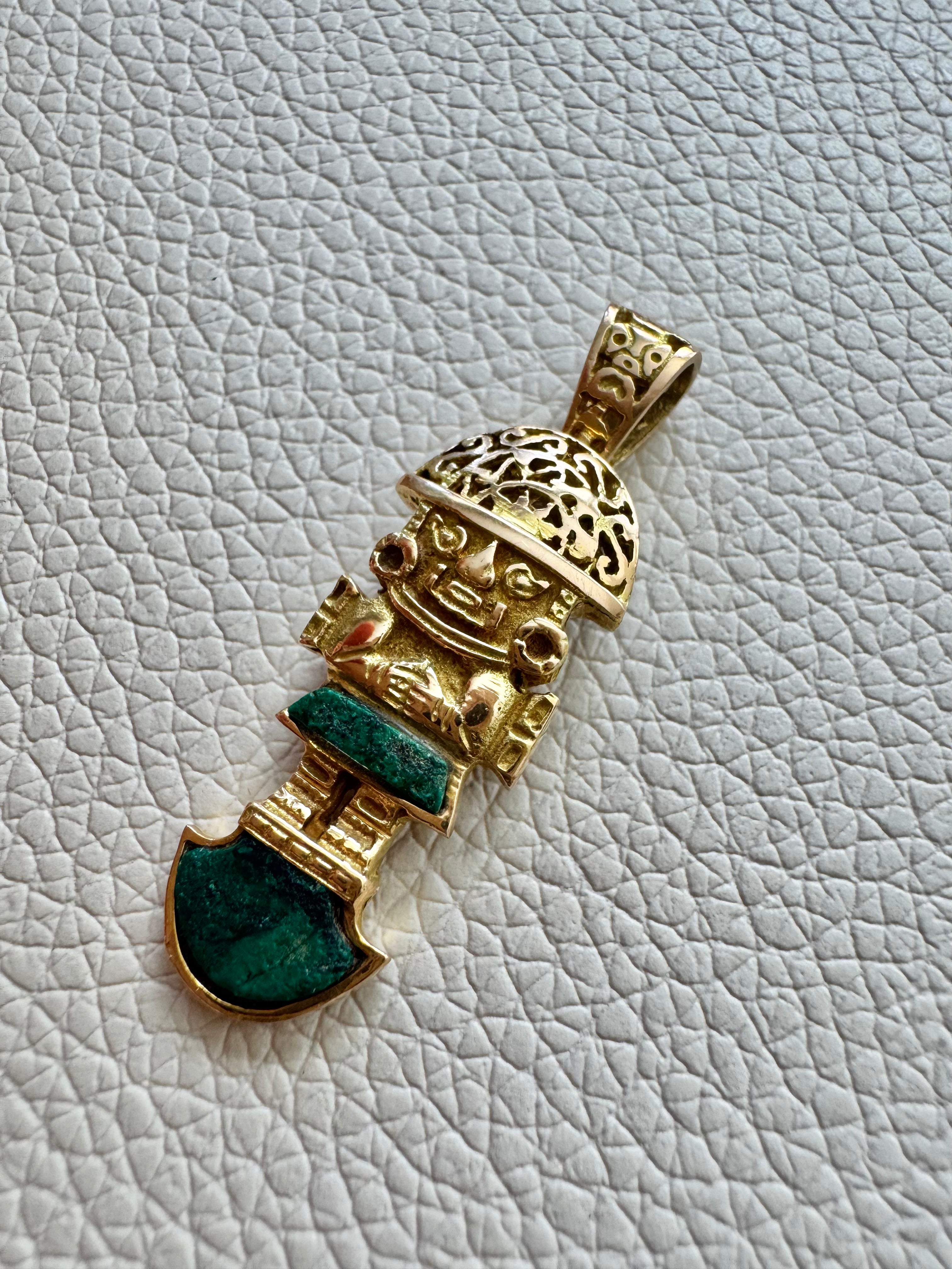 Vintage ornate 18KT gold/chrysocolla Sican Tumi amulet pendant from Peru
