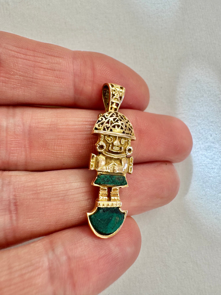 Vintage ornate 18KT yellow gold/chrysocolla Sican Tumi amulet pendant from Peru.  Beautiful and meaningful. Tumi is a national symbol of Peru and is associated with good fortune. Wear for good luck.  Movable bail.