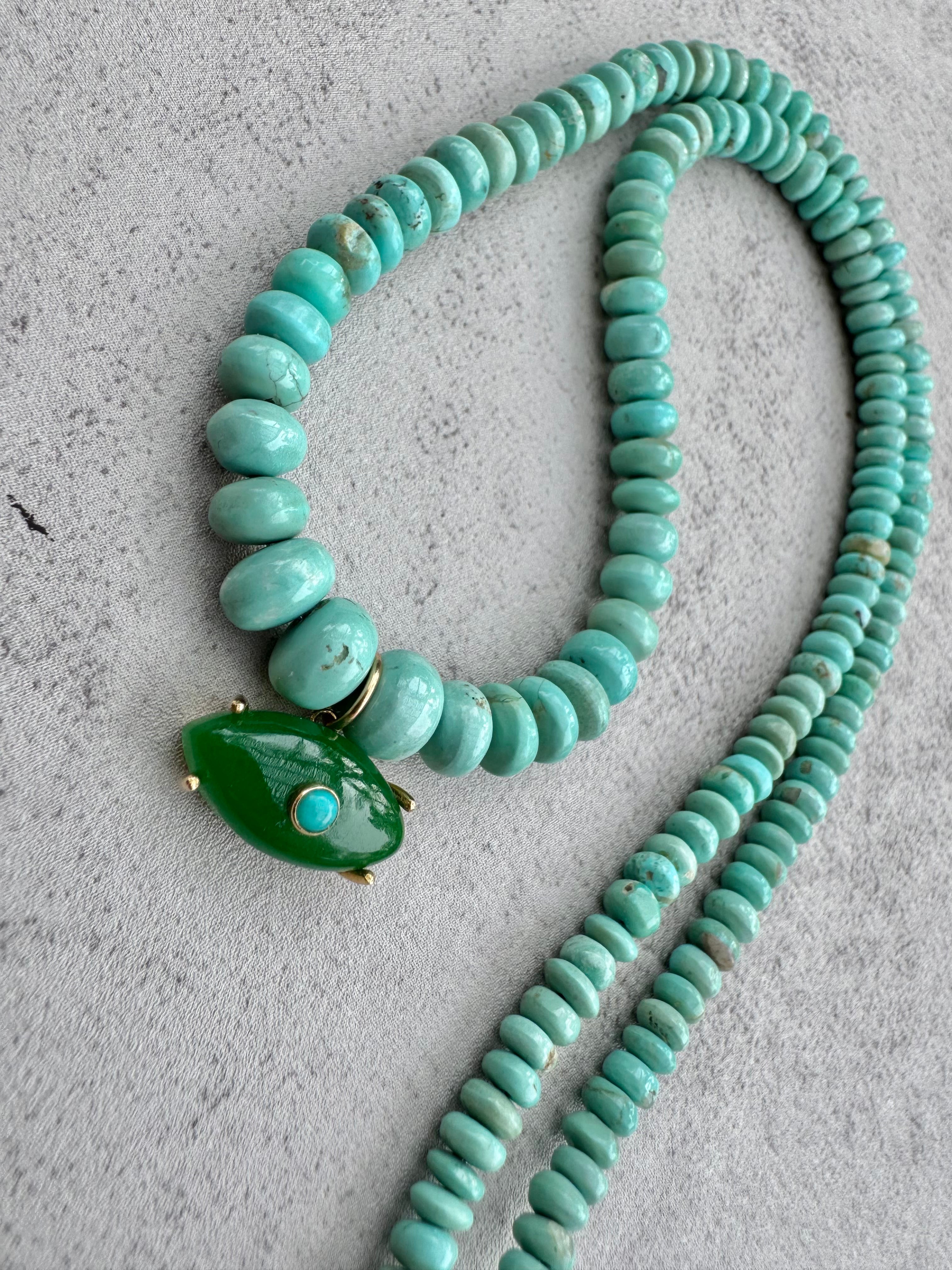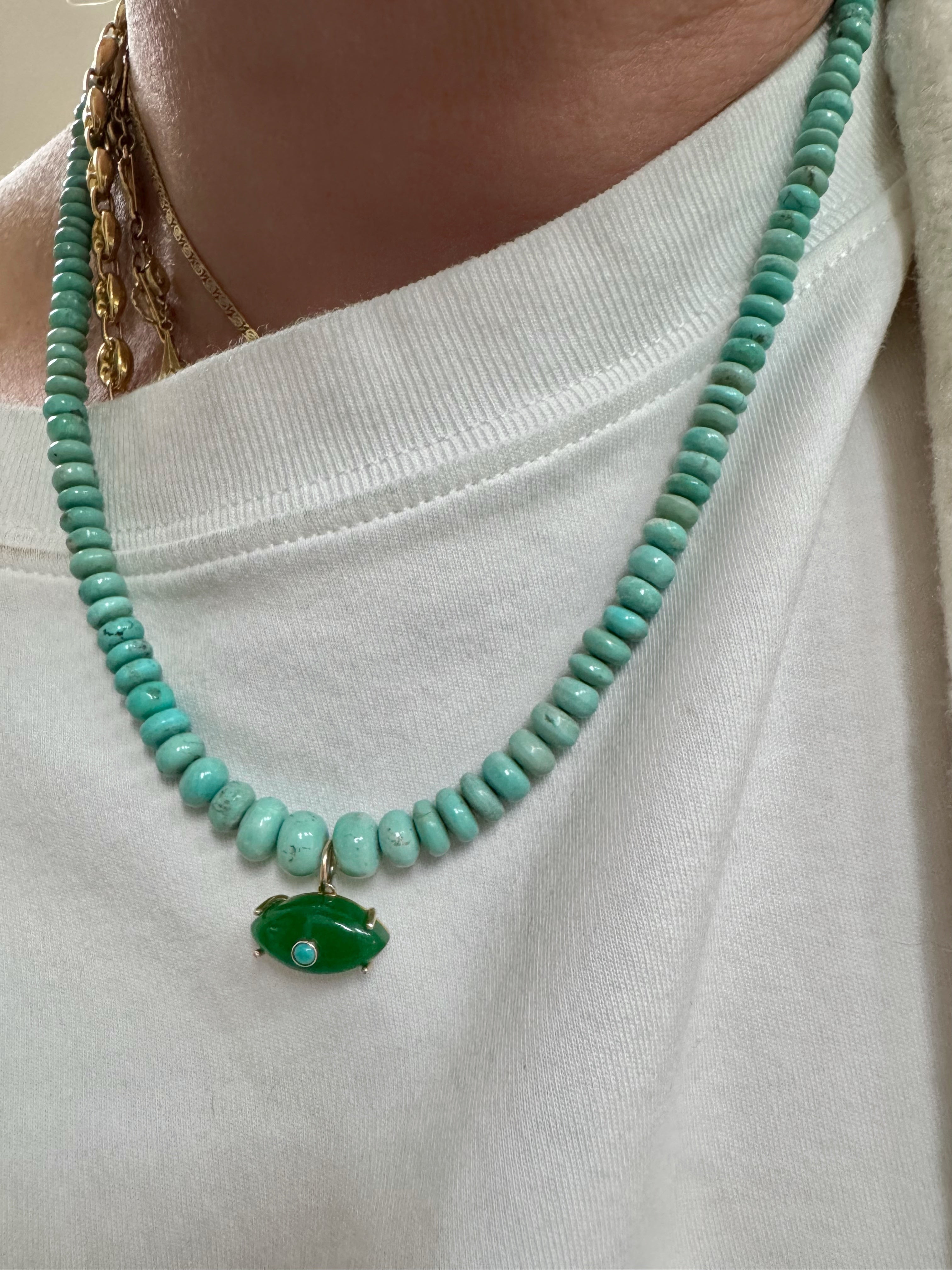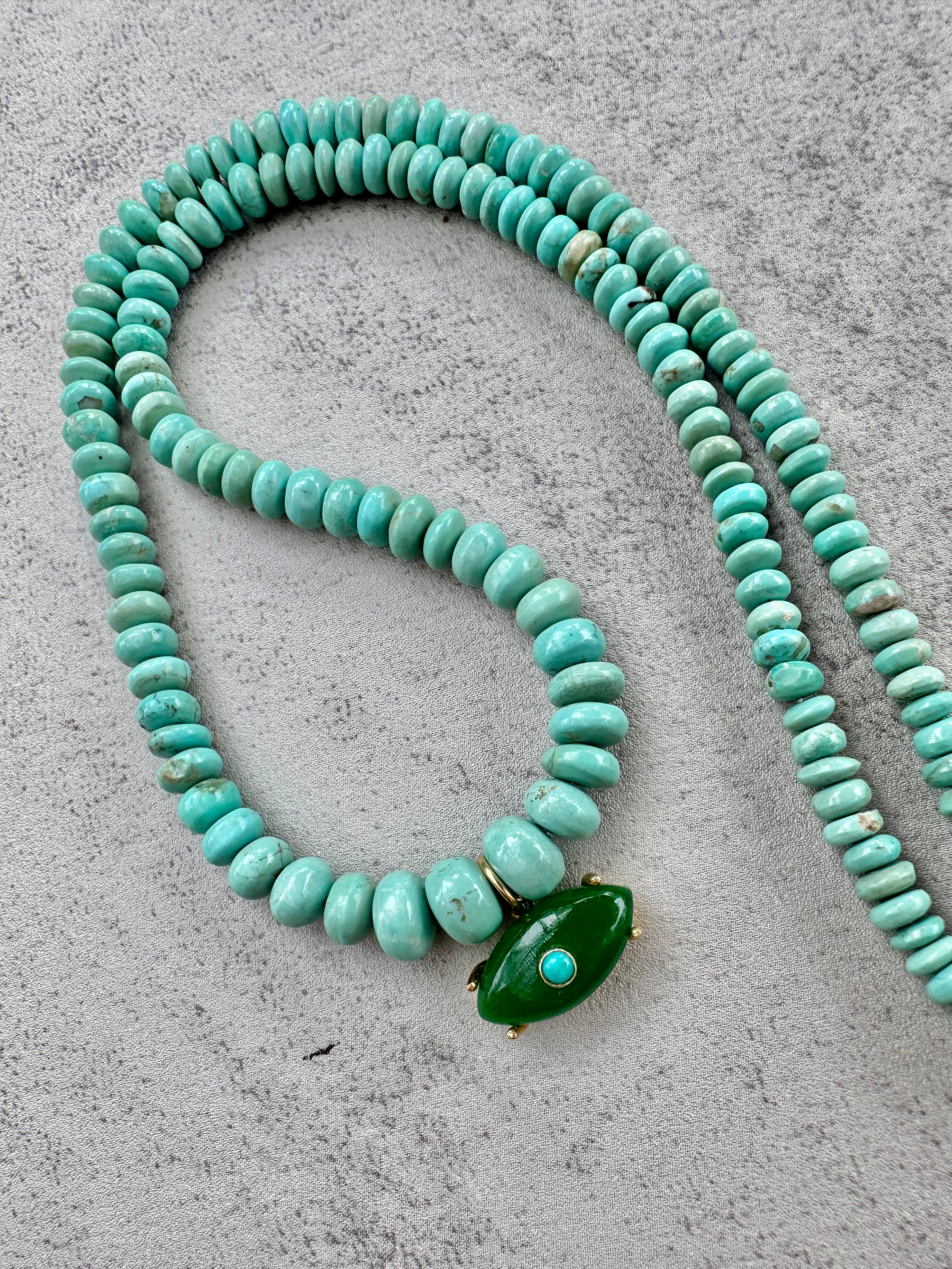 Beautiful AAA Arizona turquoise bead necklace with 14KT gold green jade/turquoise evil eye charm. Beautiful talismanic striking piece. Most gorgeous light blue smooth rondelle Arizona turquoise compliments green jade so well. Wear alone or layered. Gold filled findings.
